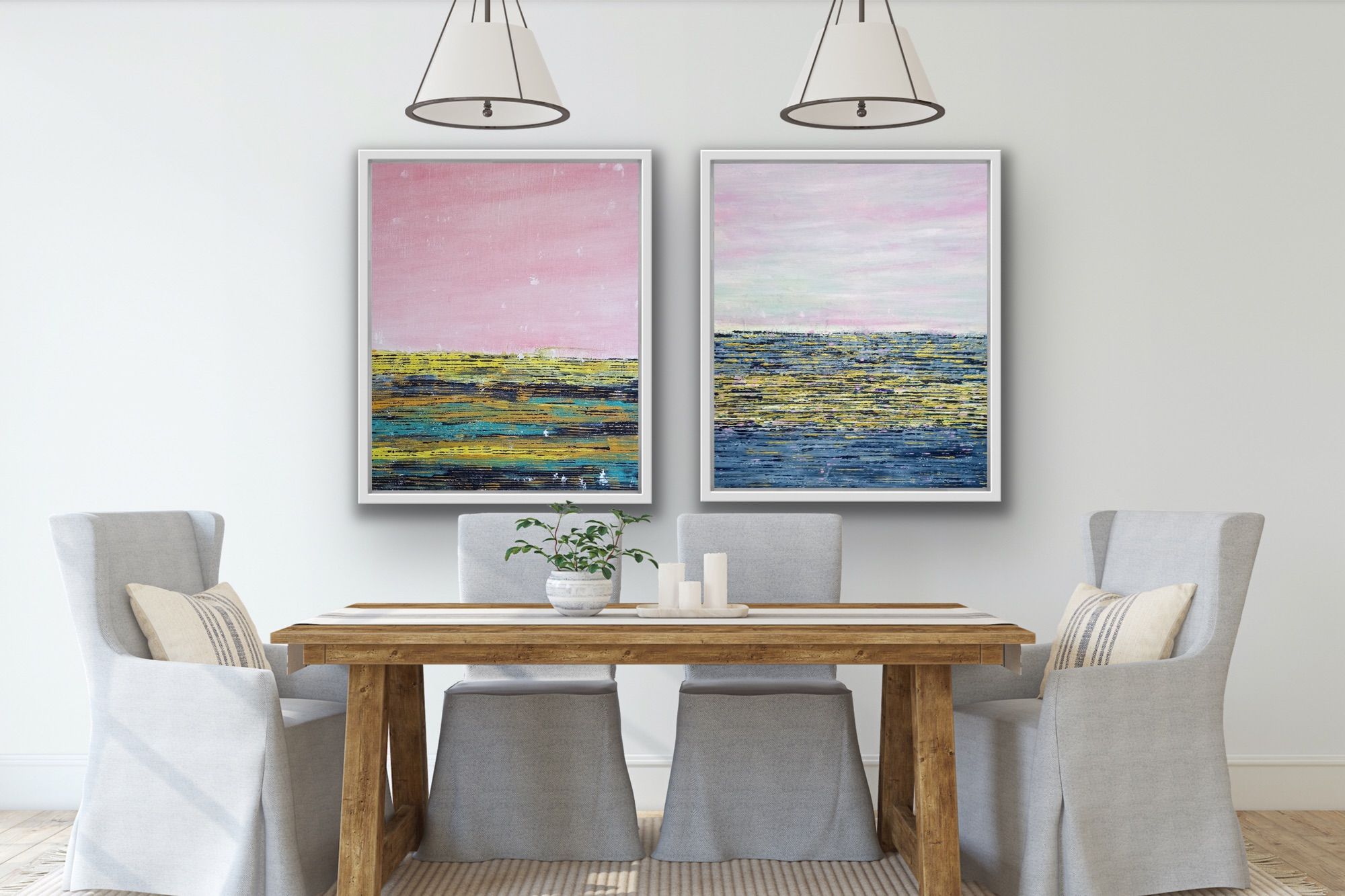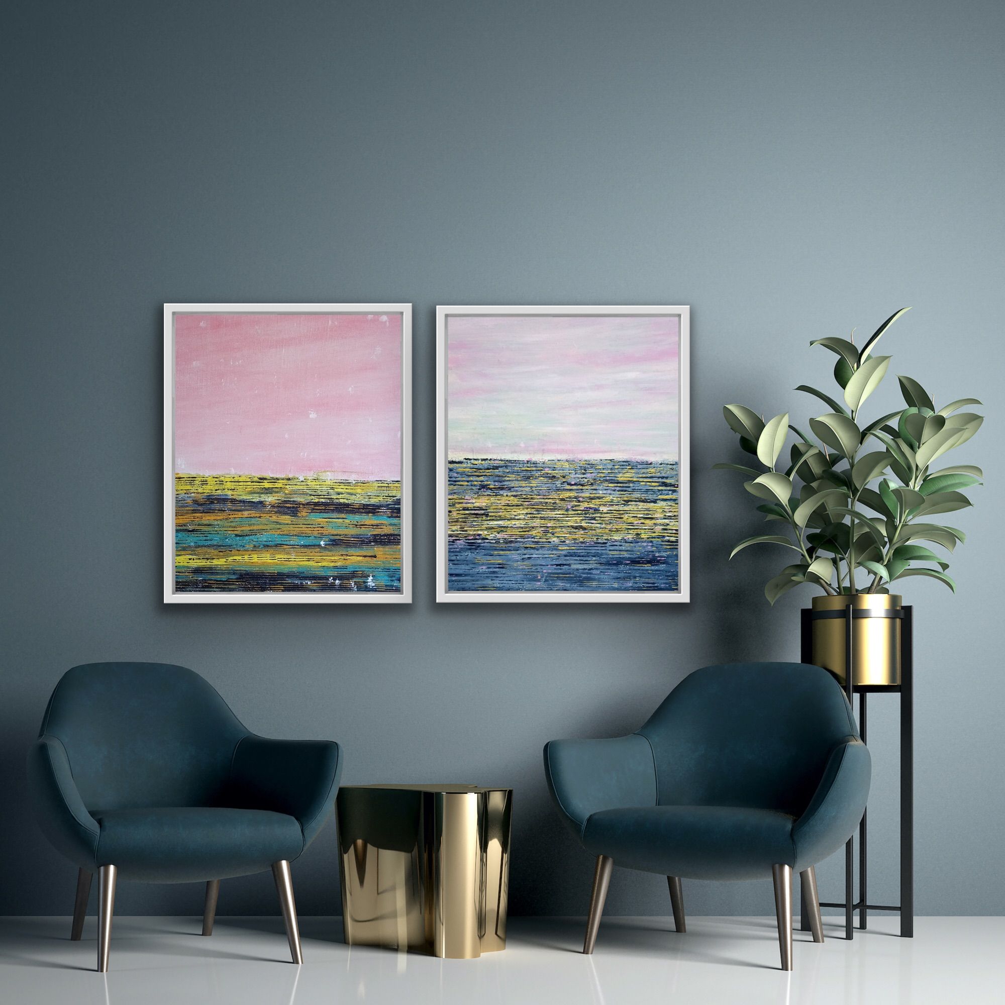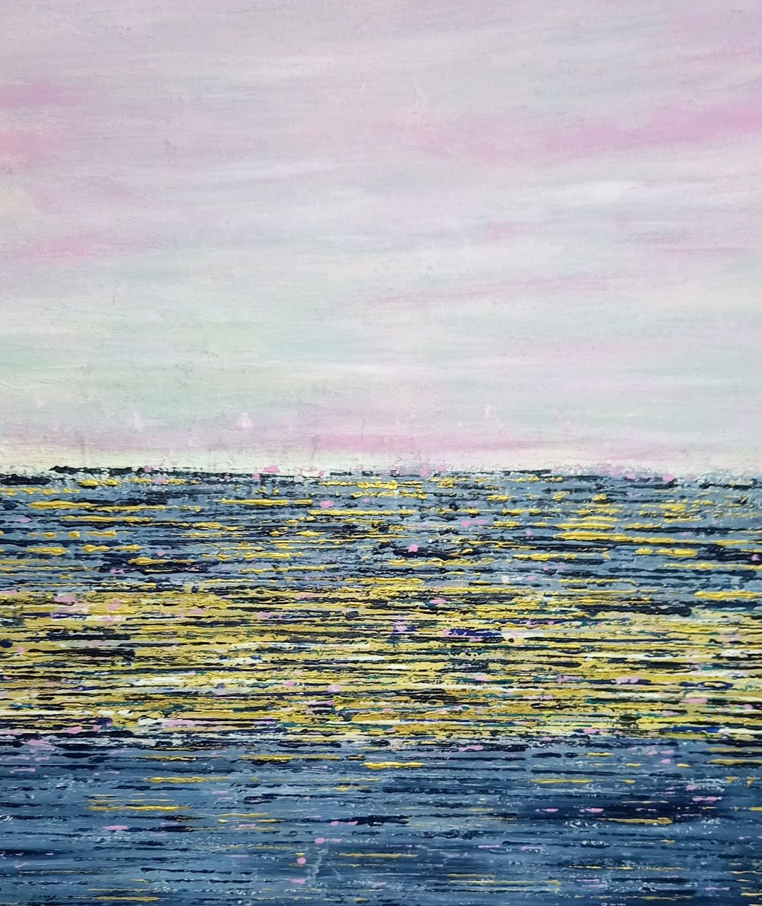 If I could choose the life I lead and Ocean Deep are original abstract seascapes by Pixie Willoughby. They capture the depth of the ocean. How it reflects so many different colours that glisten and sparkle in the evening sun. The pinks give a calm, serene feel to this piece. The dazzling