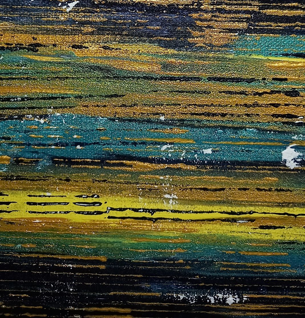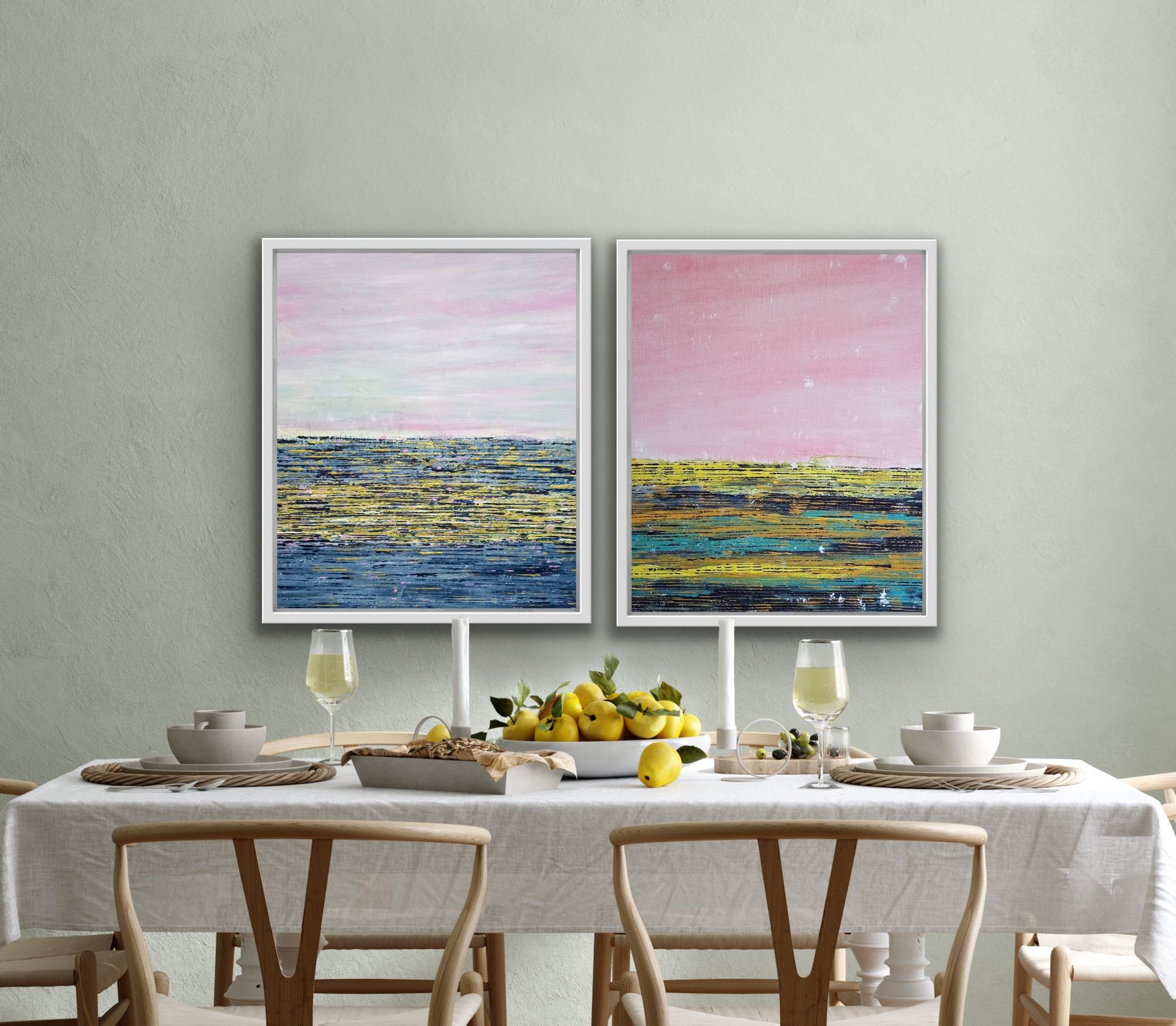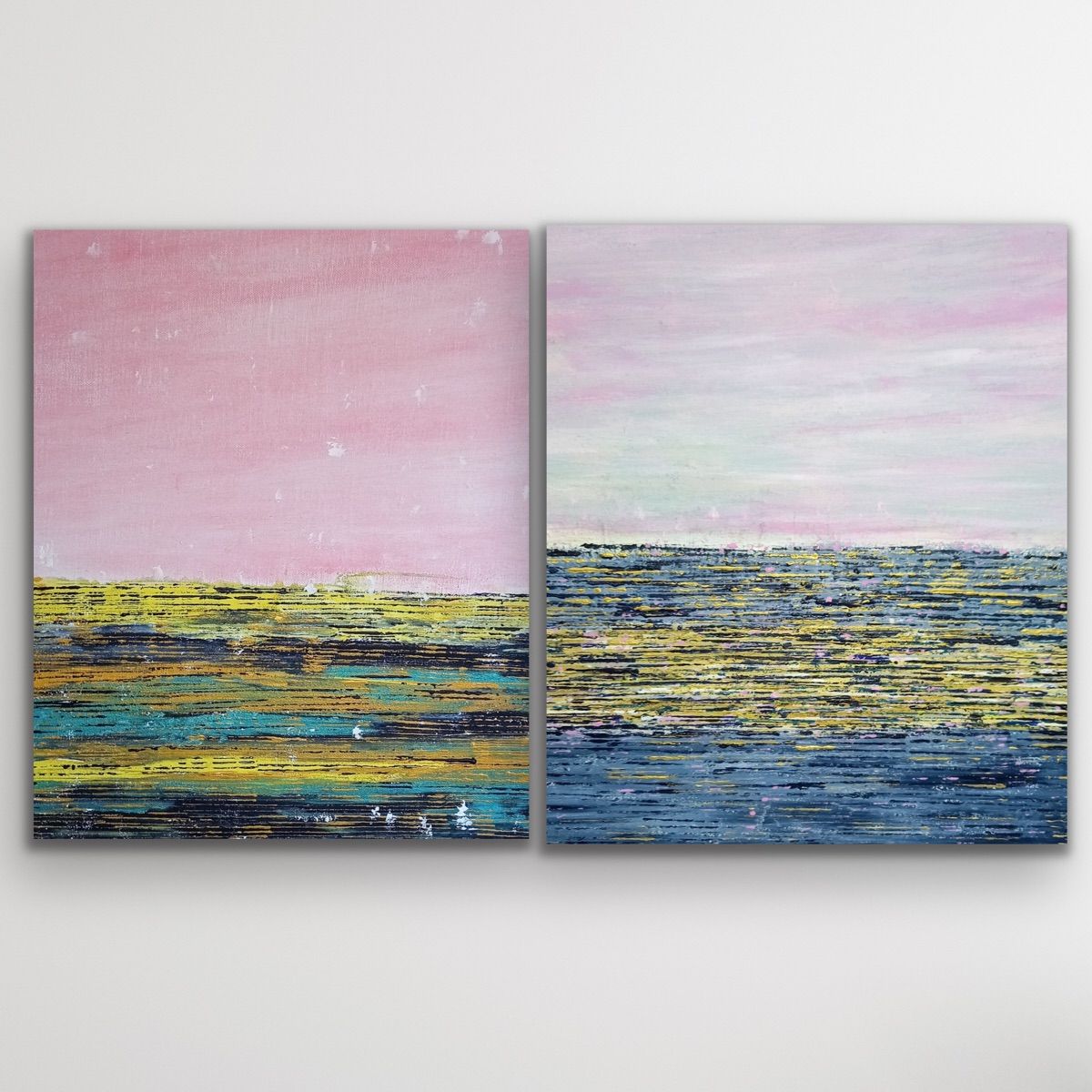 If I could choose the life I lead and Ocean Deep are original abstract seascapes by Pixie Willoughby. They capture the depth of the ocean. How it reflects so many different colours that glisten and sparkle in the evening sun. The pinks give a calm, serene feel to this piece. The dazzling