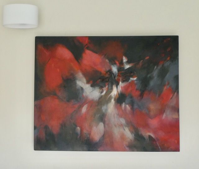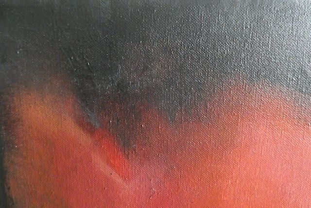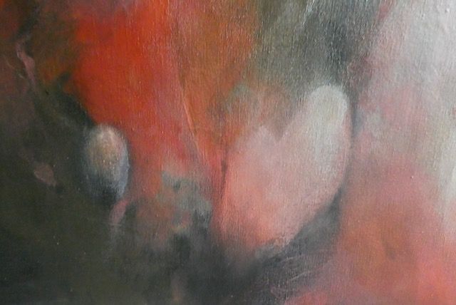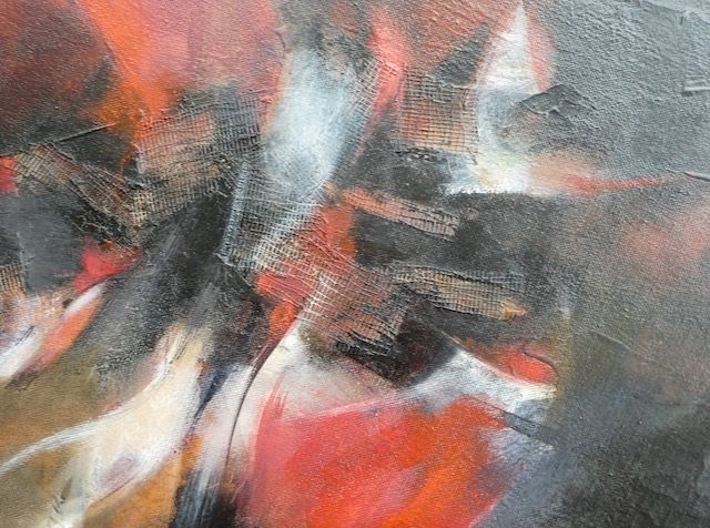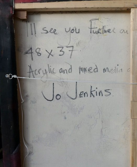 A landscape orientated painting with abstract qualities and a strong dramatic colour scheme. Smaller shapes burst through the darkness to fragment and shatter in the centre of the painting. Additional Information:I'll See You Further On Up the Road [2022] by Jo Jenkins Acrylic paint on canvasSigned by artistSOLD UNFRAMED Image size: Height: 81cm (31.89