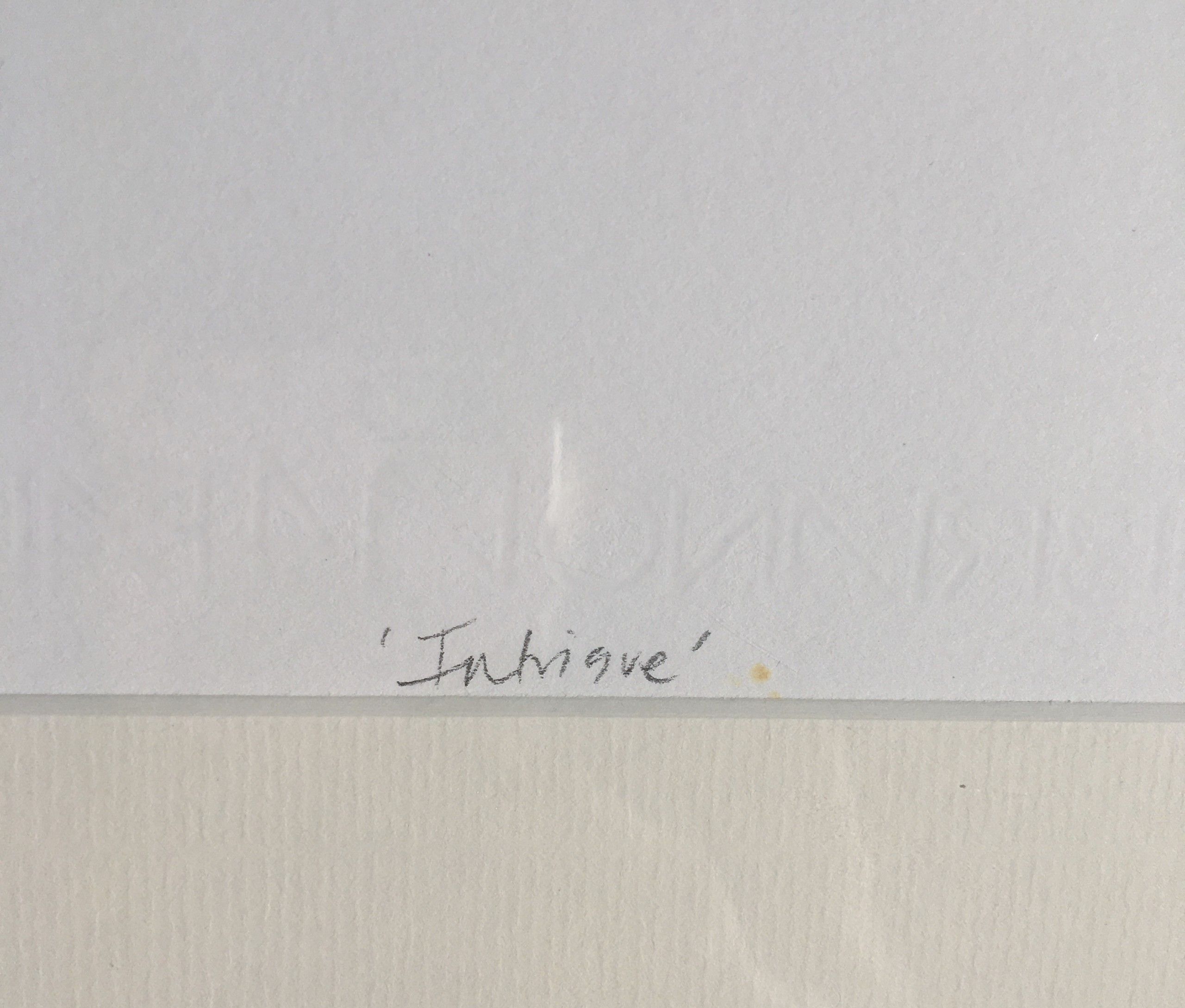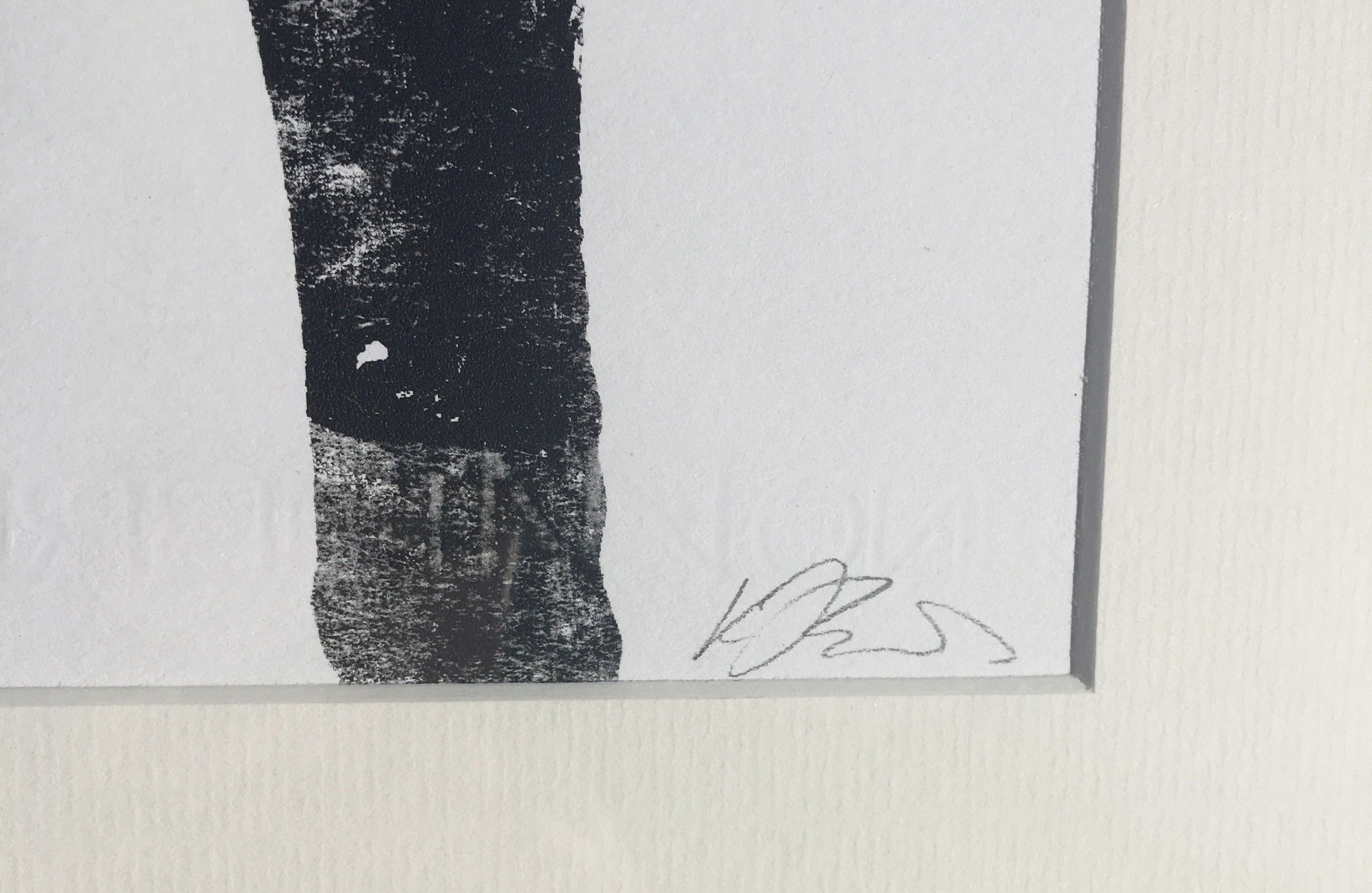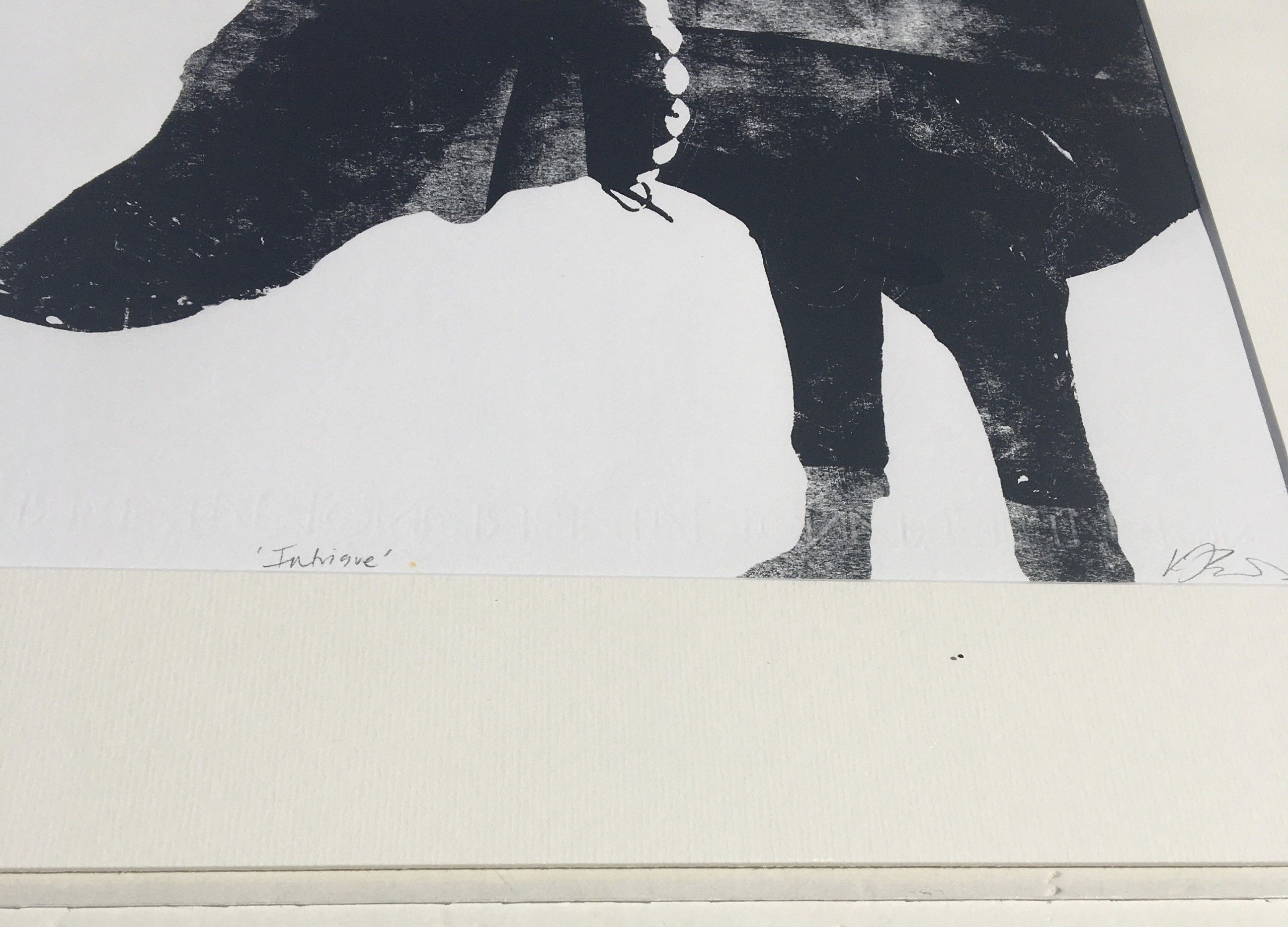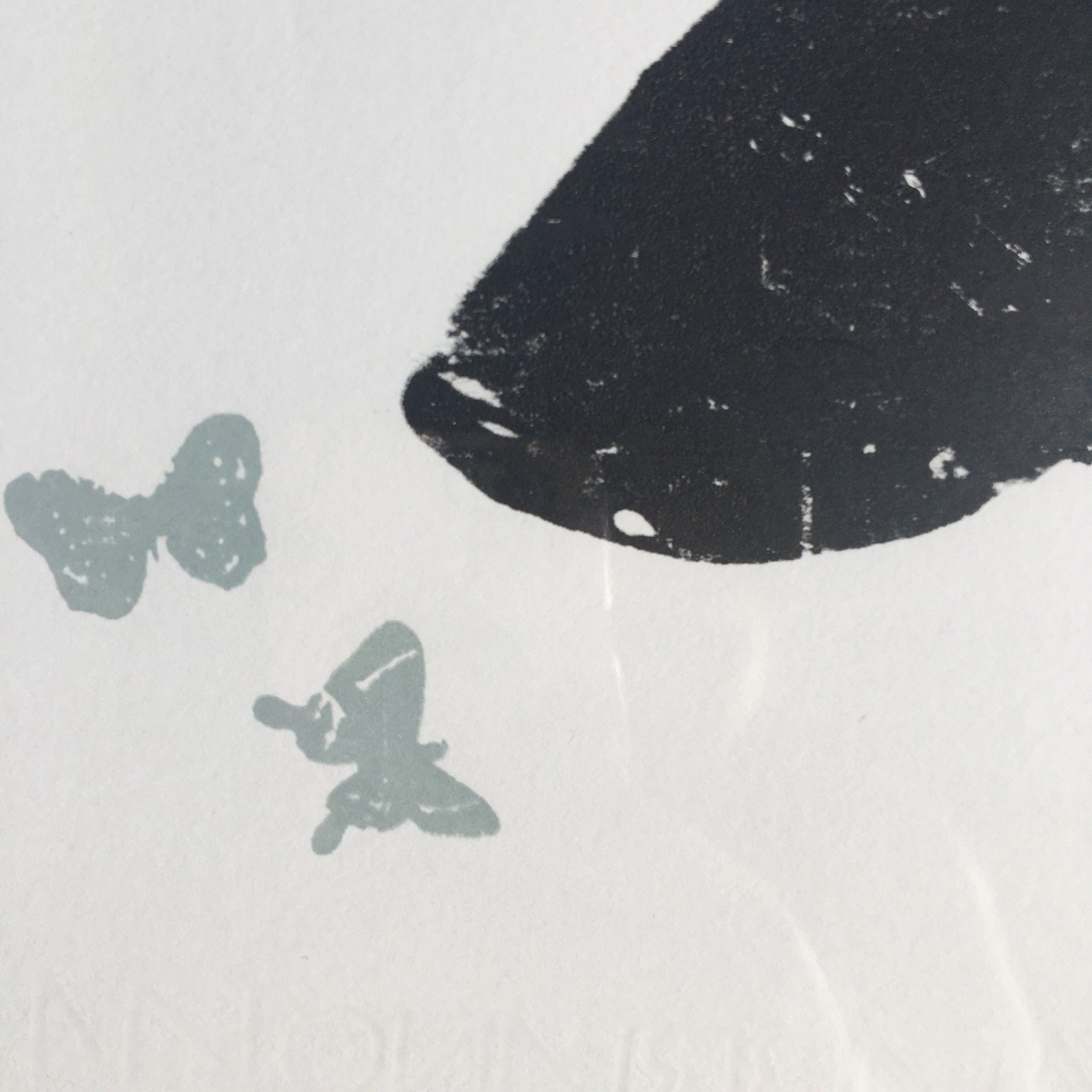 Katie Edwards. Intrigue. Part of a collection of works exploring the symbolism of a black dog, this piece was created in 2014 it is a playful piece portraying the idea of Intrigue as the dog plays and sniffs at some fluttering butterflies. Limited Edition of 100, 2 colour screen print on Fabriano Ruvidi