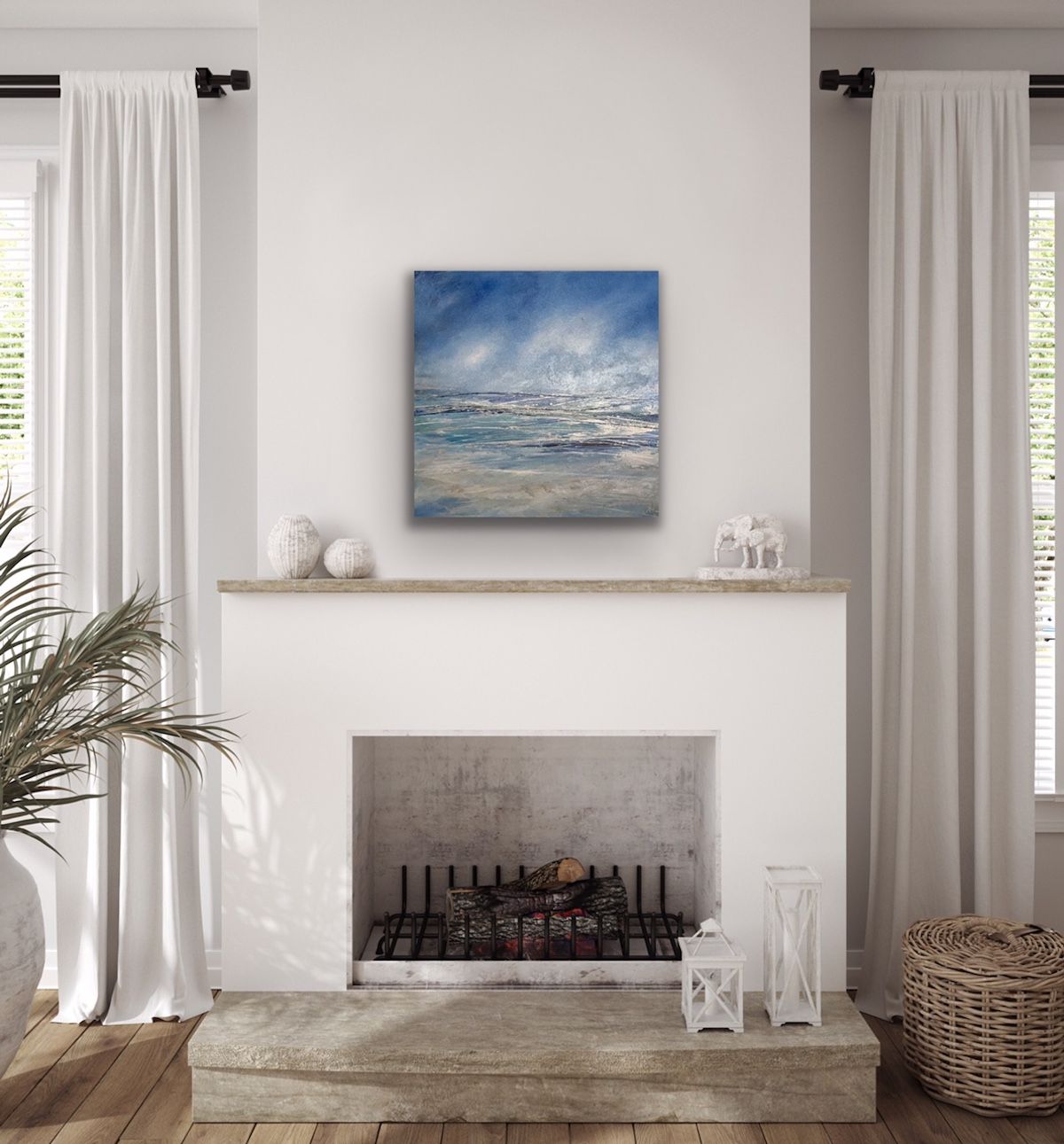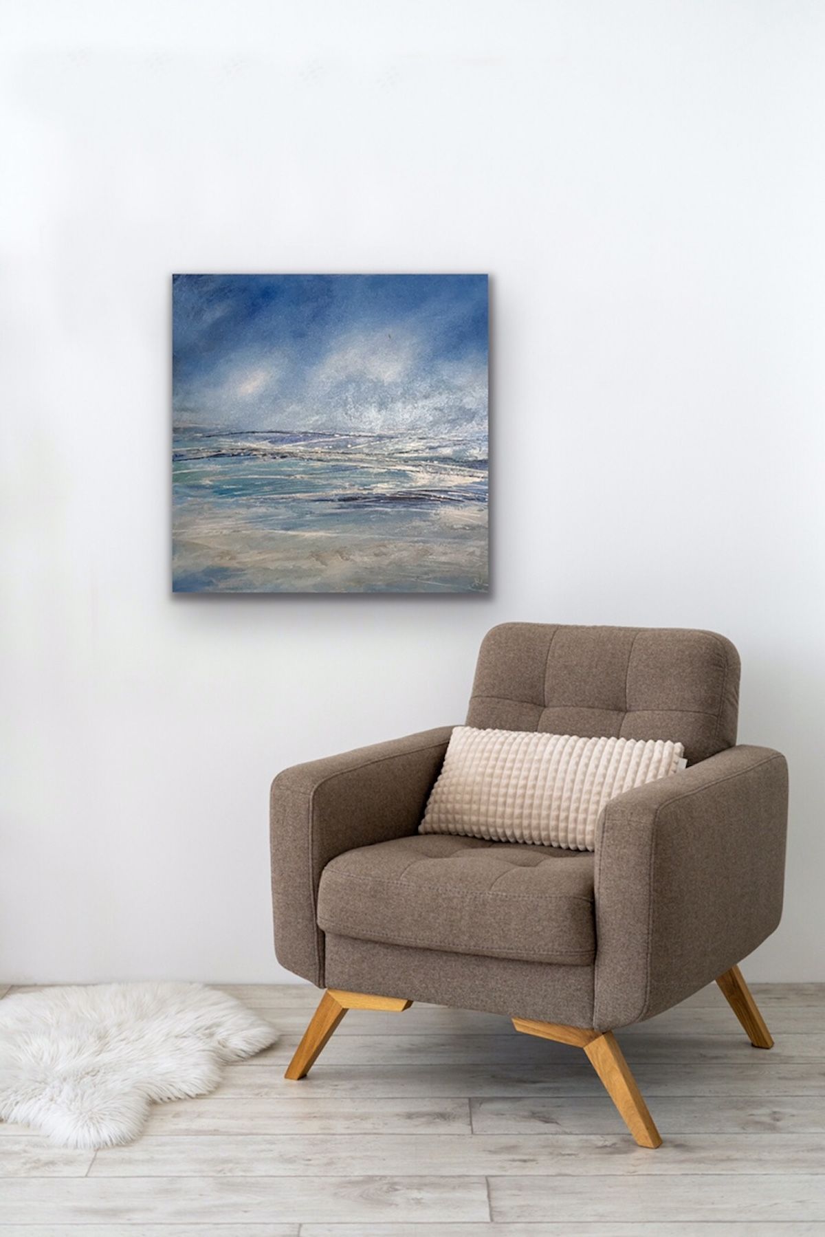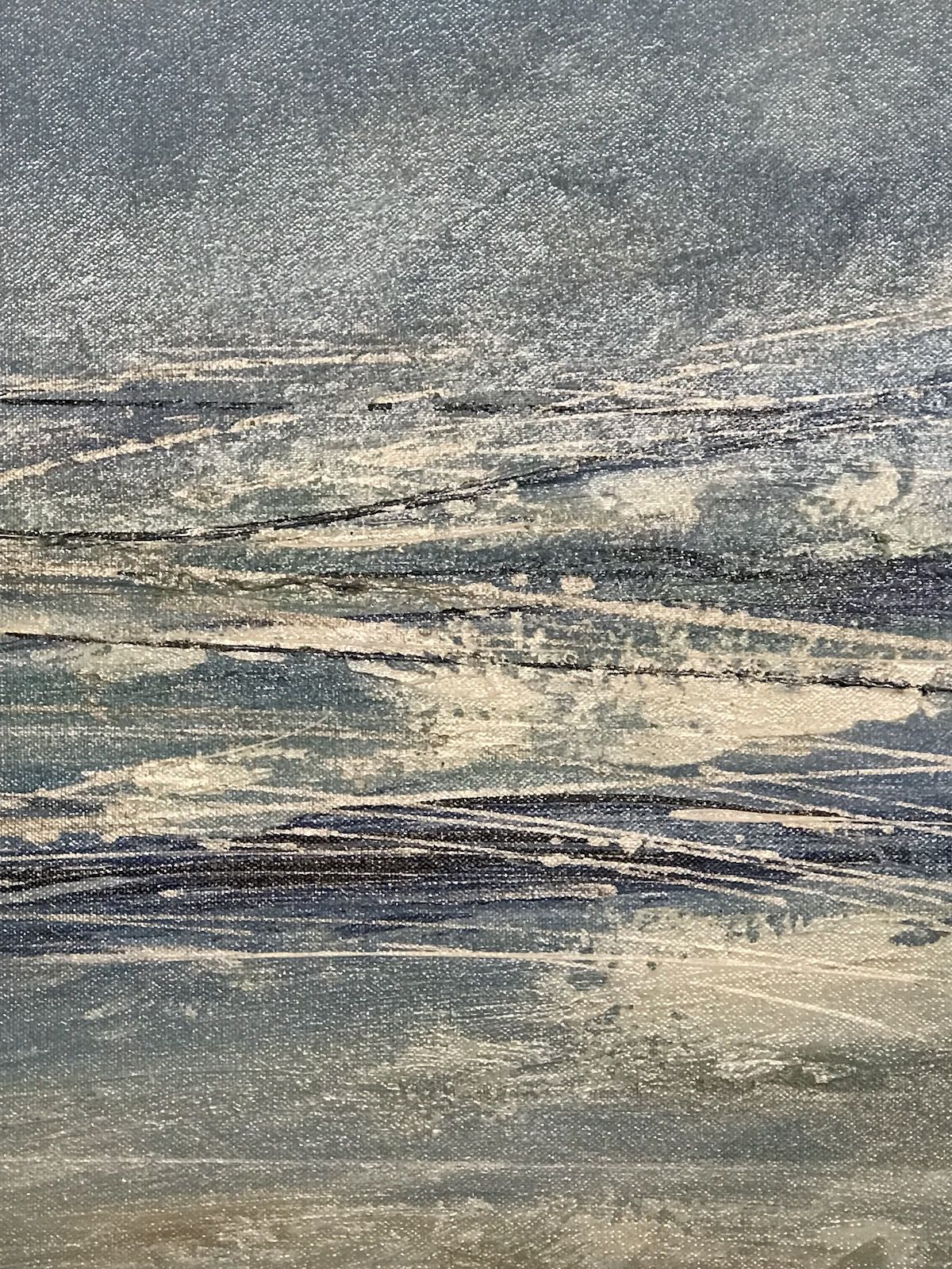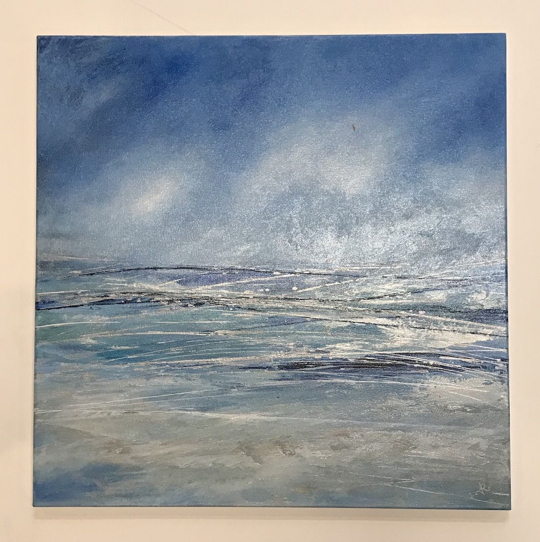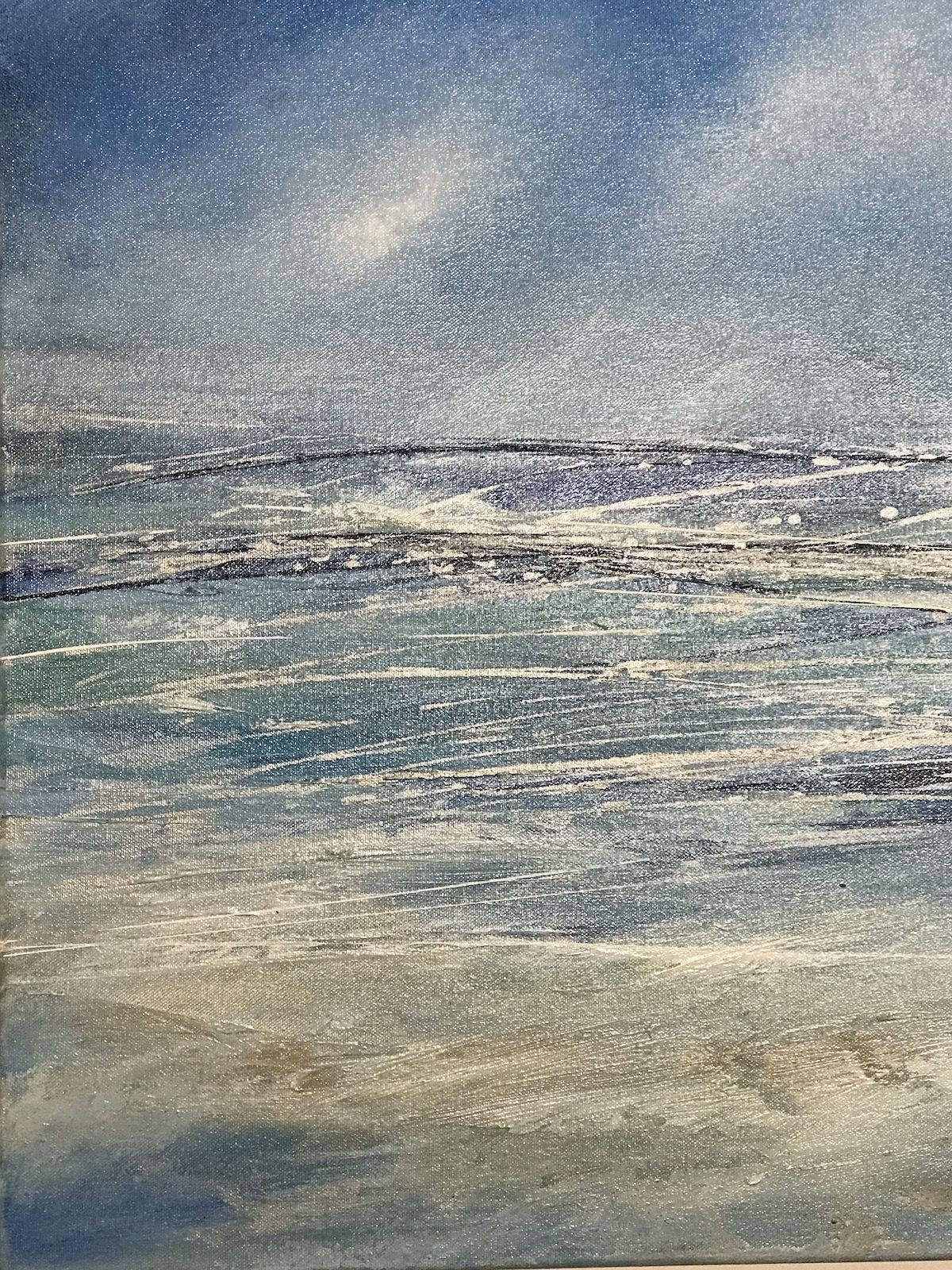 Abstract Tenby to Caldey is an original abstract acrylic painting on canvas by Jan Rogers. Depicting a sea scape with a vast bright blue sky and breaking waves below.