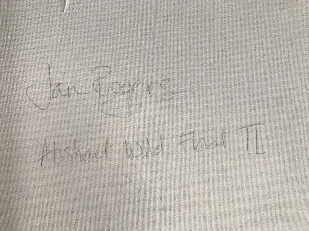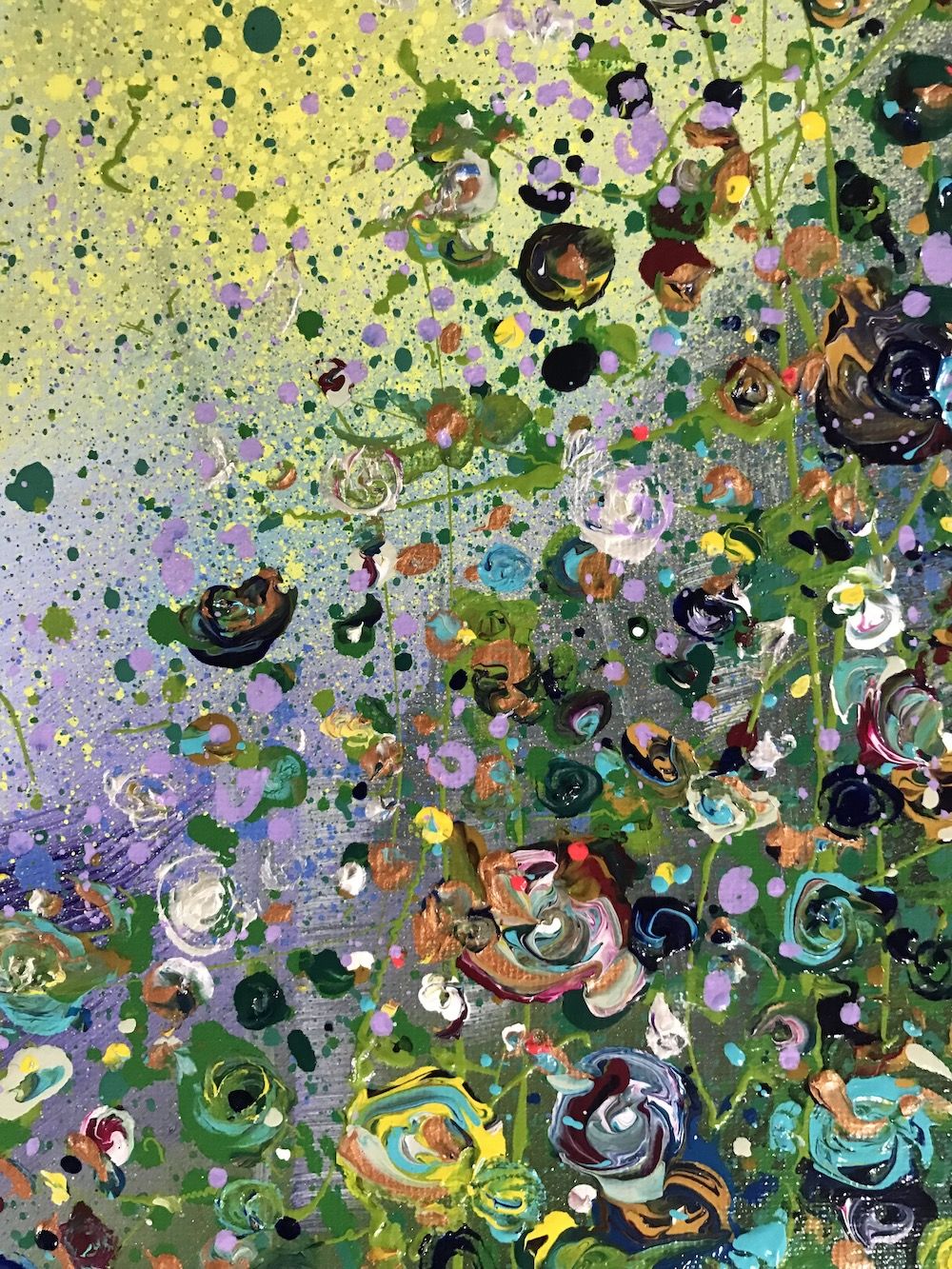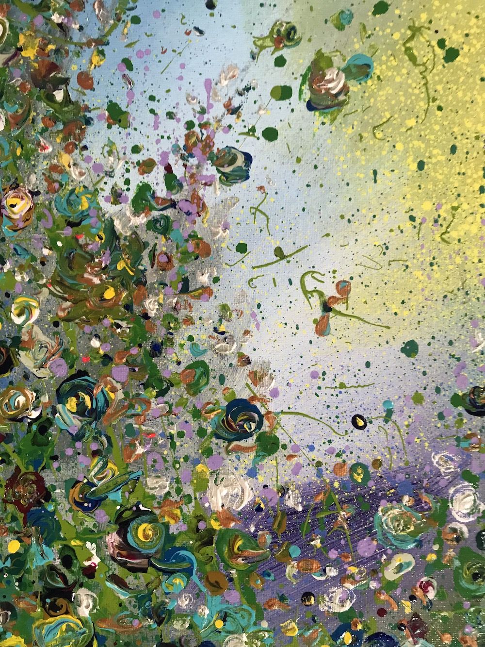 Abstract Wild Floral II by Jan Rogers is an original acrylic painting of a colourful floral landscape in front of a bright blue sky.
