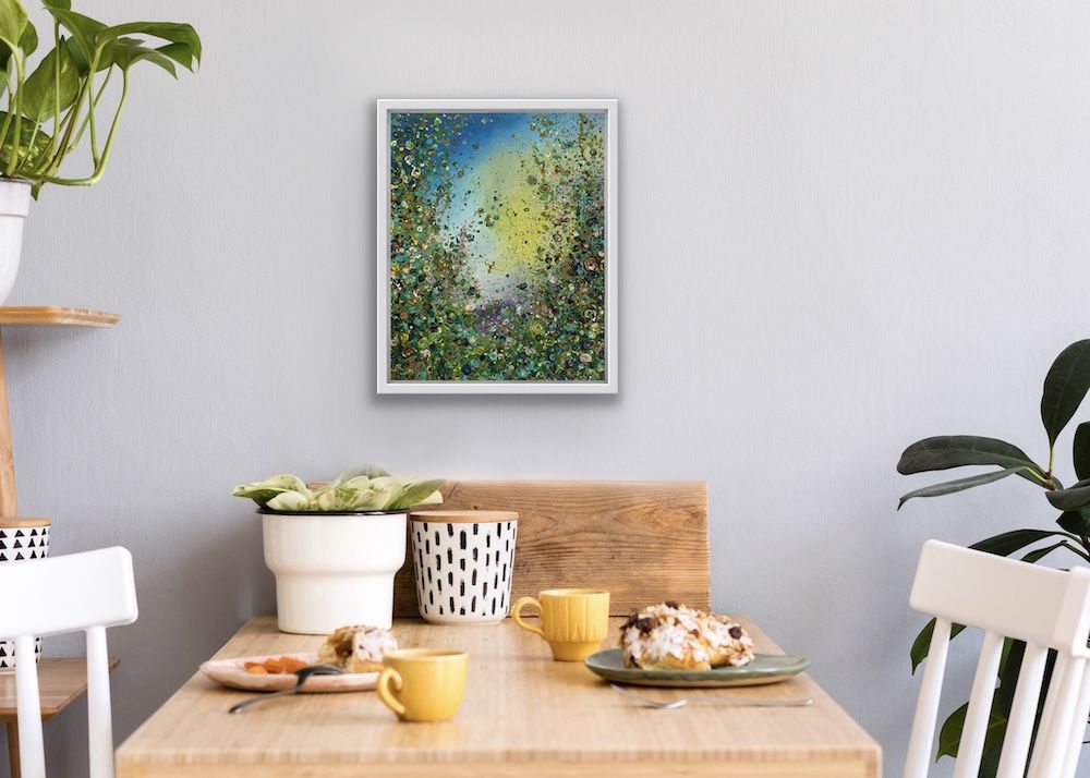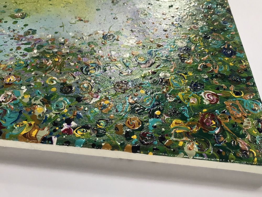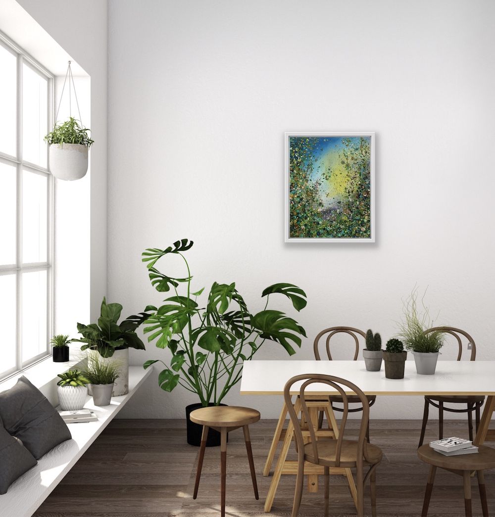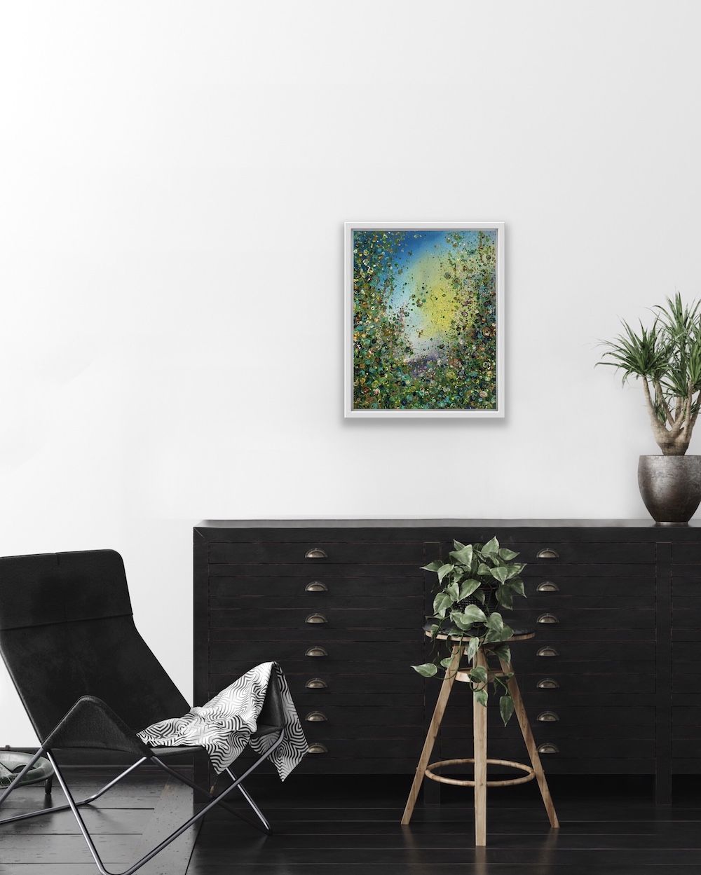 Abstract Wild Floral II by Jan Rogers is an original acrylic painting of a colourful floral landscape in front of a bright blue sky.