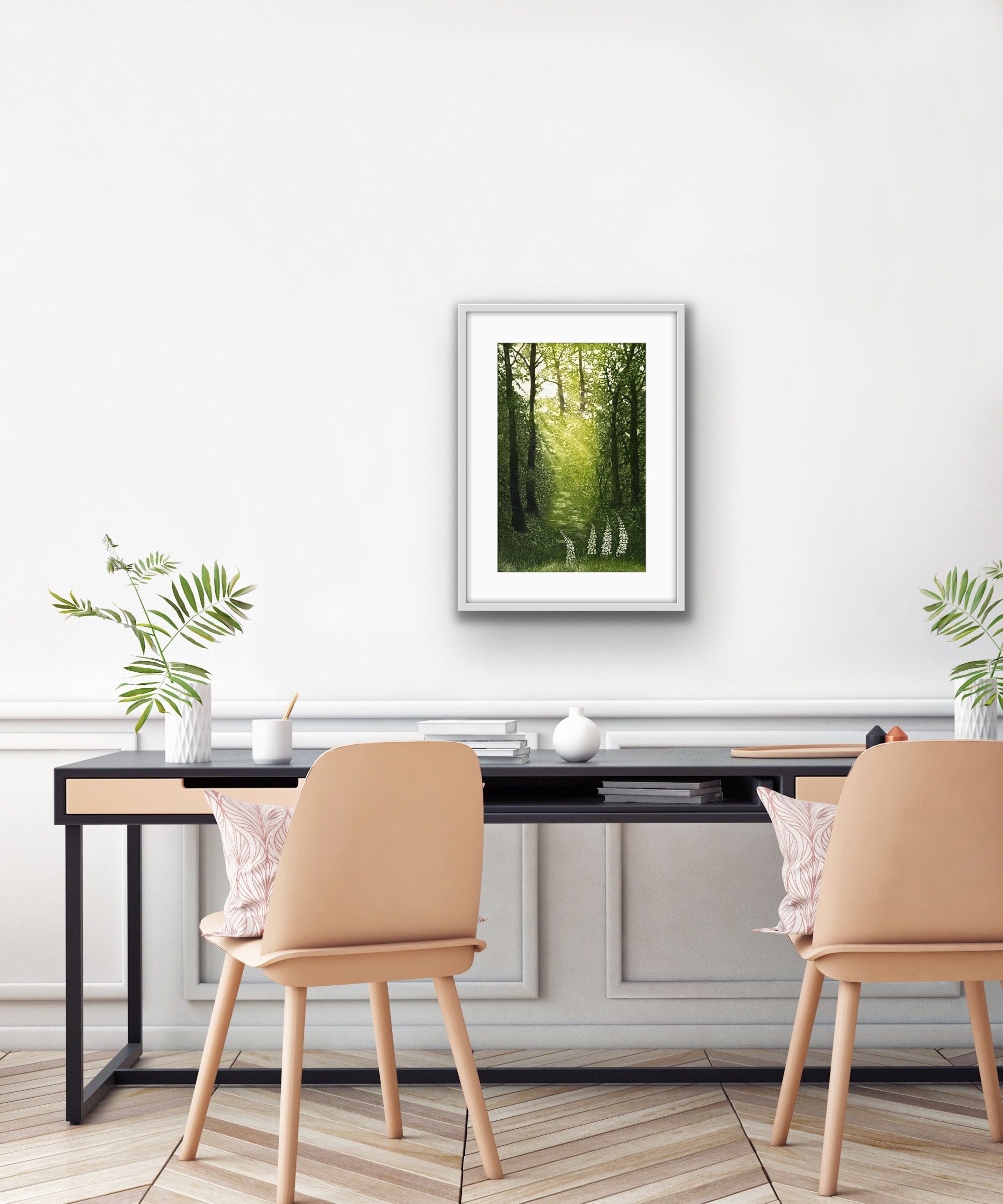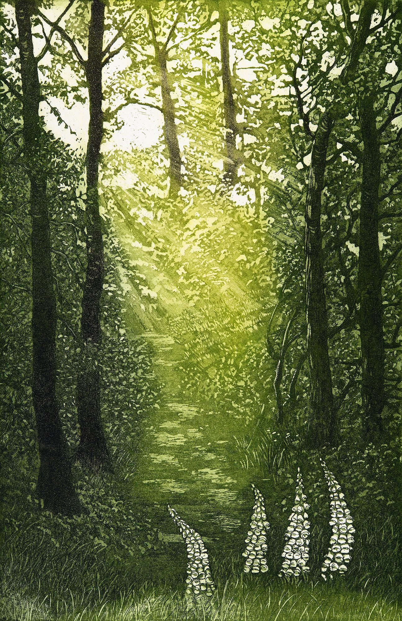 Jane Peart Woodland Glade Limited Edition Print Edition of 100 Etching/Aquatint Image Size: H 35 cm x W 22 cm Sheet Size: H 47 cm x W 36 cm Signed Sold Unframed Please note that in situ images are purely an indication of how a piece may look. Woodland Glade a copper plate etching by Jane Peart. I was inspired