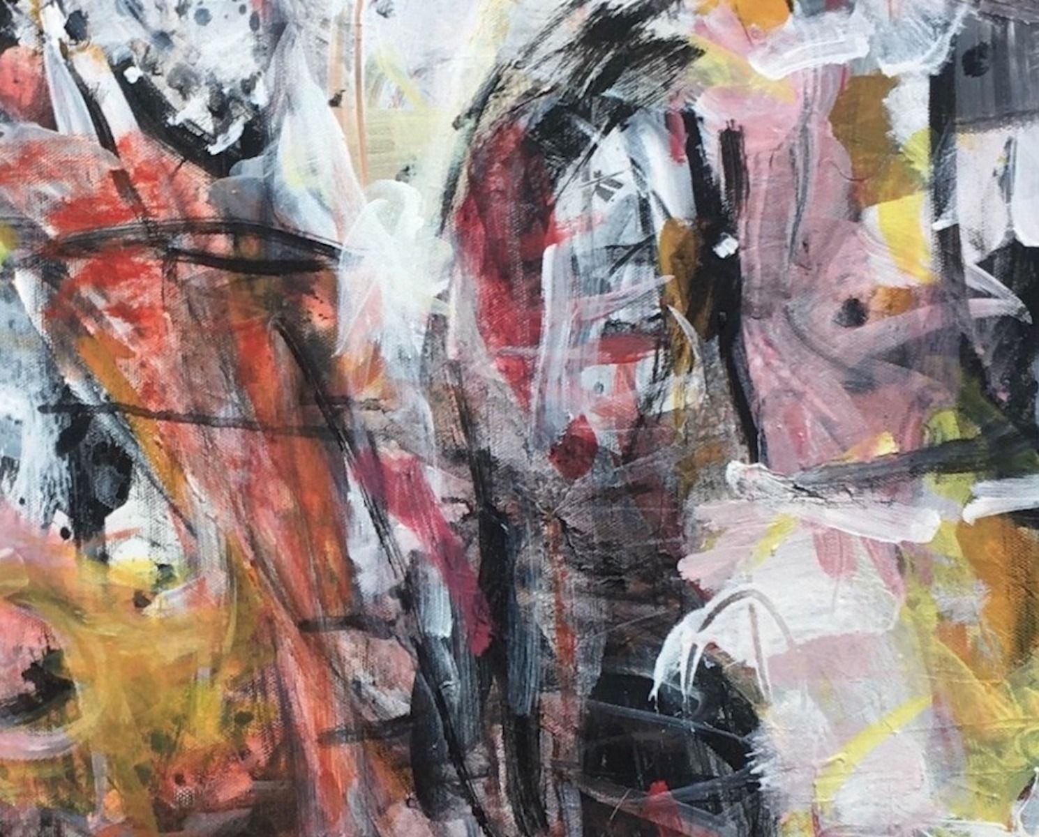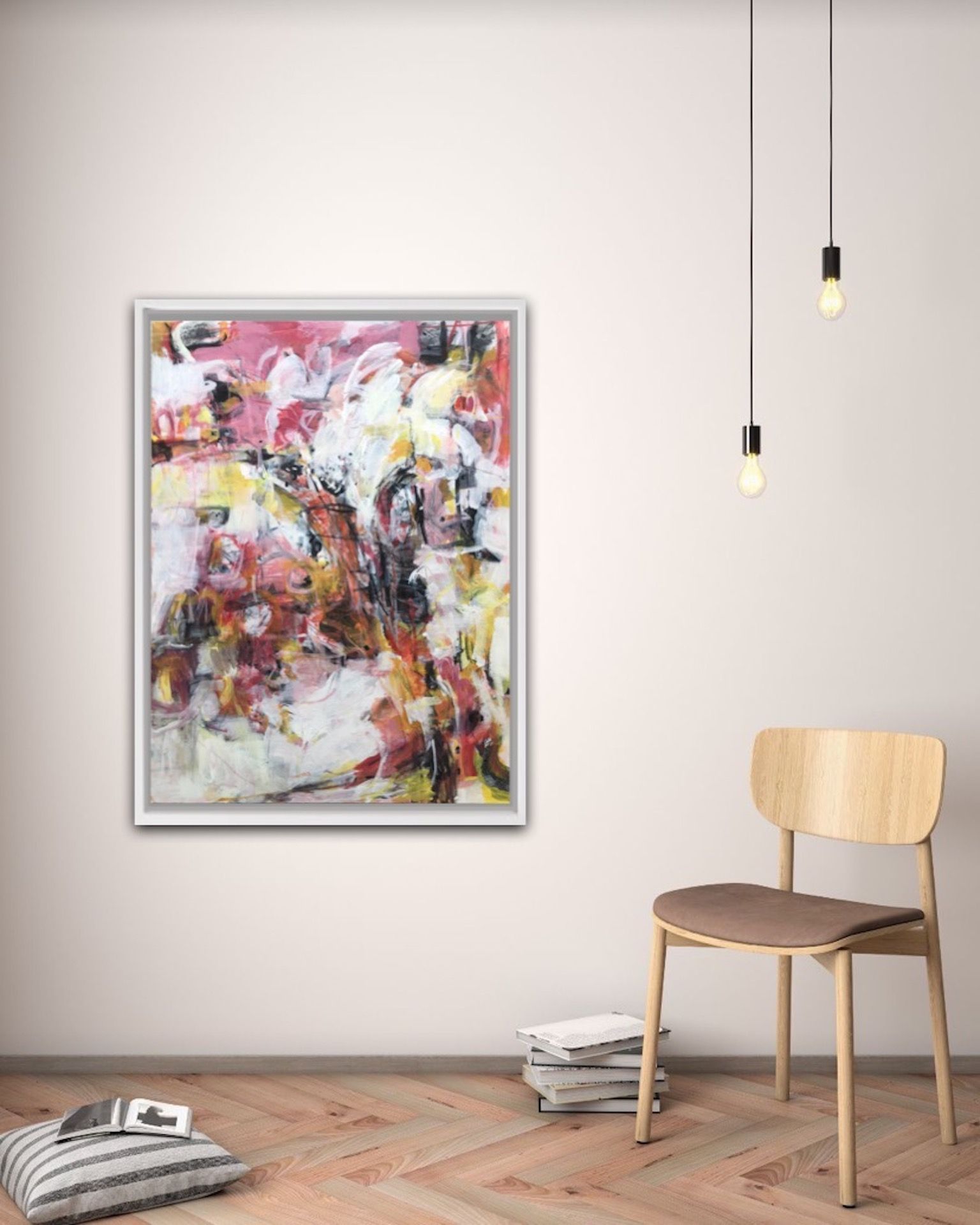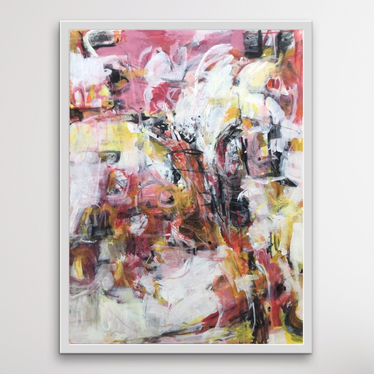 Fiesta! is an original abstract expressionist painting by Janet Keith. The painting is a bold and energetic expression of fun and joy. Its warm colours - pinks and yellows are favourites of the artist. Janet often has music playing while she is working in the studio and many of her paintings