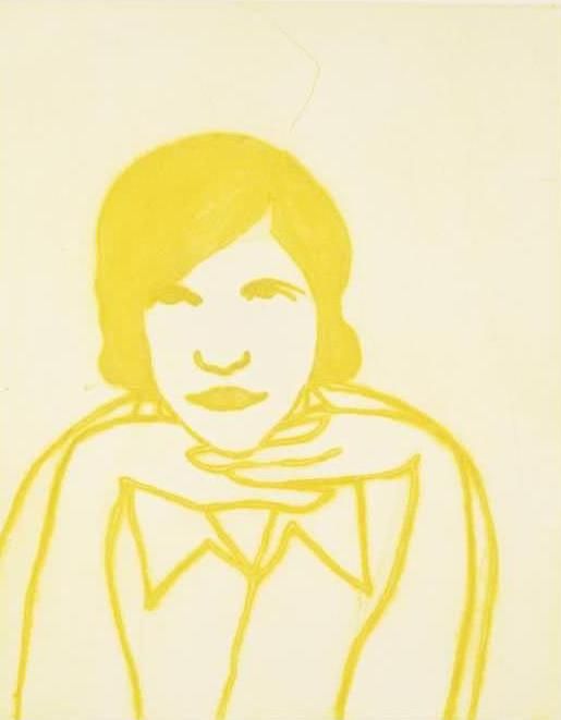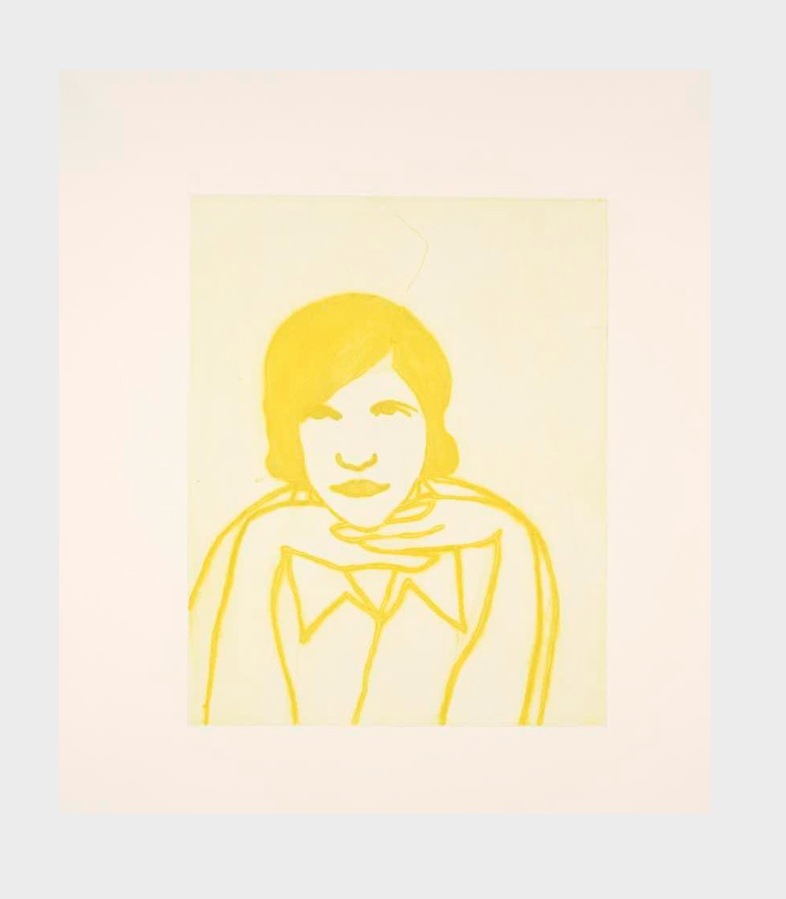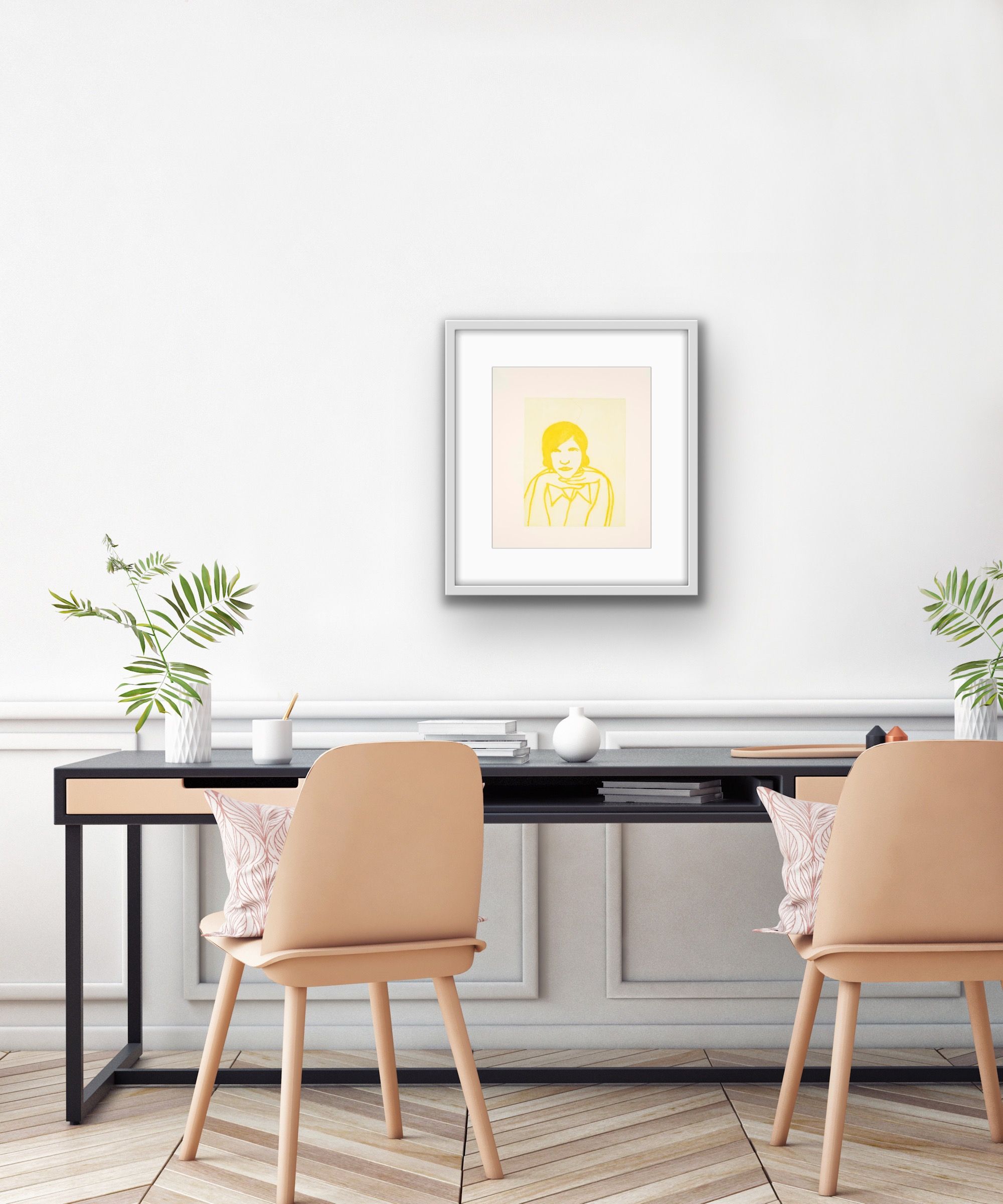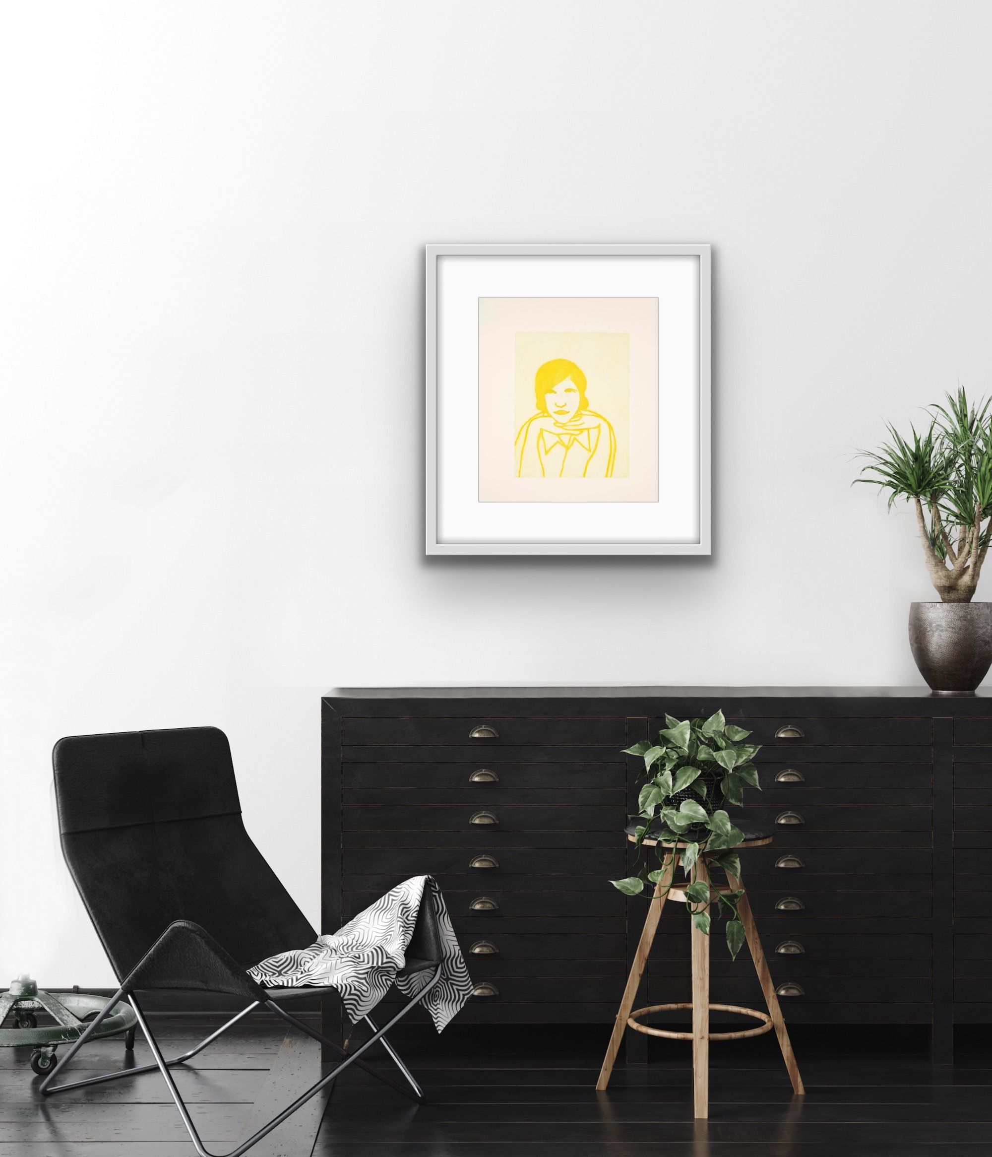 Jean Rhys is a limited edition drypoint etching by Kate Boxer. This print features the novelist Jean Rhys in a bright yellow colour. Kate Boxer manages to capture the essence of Jean Rhys. Kate uses only part of the sheet to capture Jean Rhys in an elegant poise with a