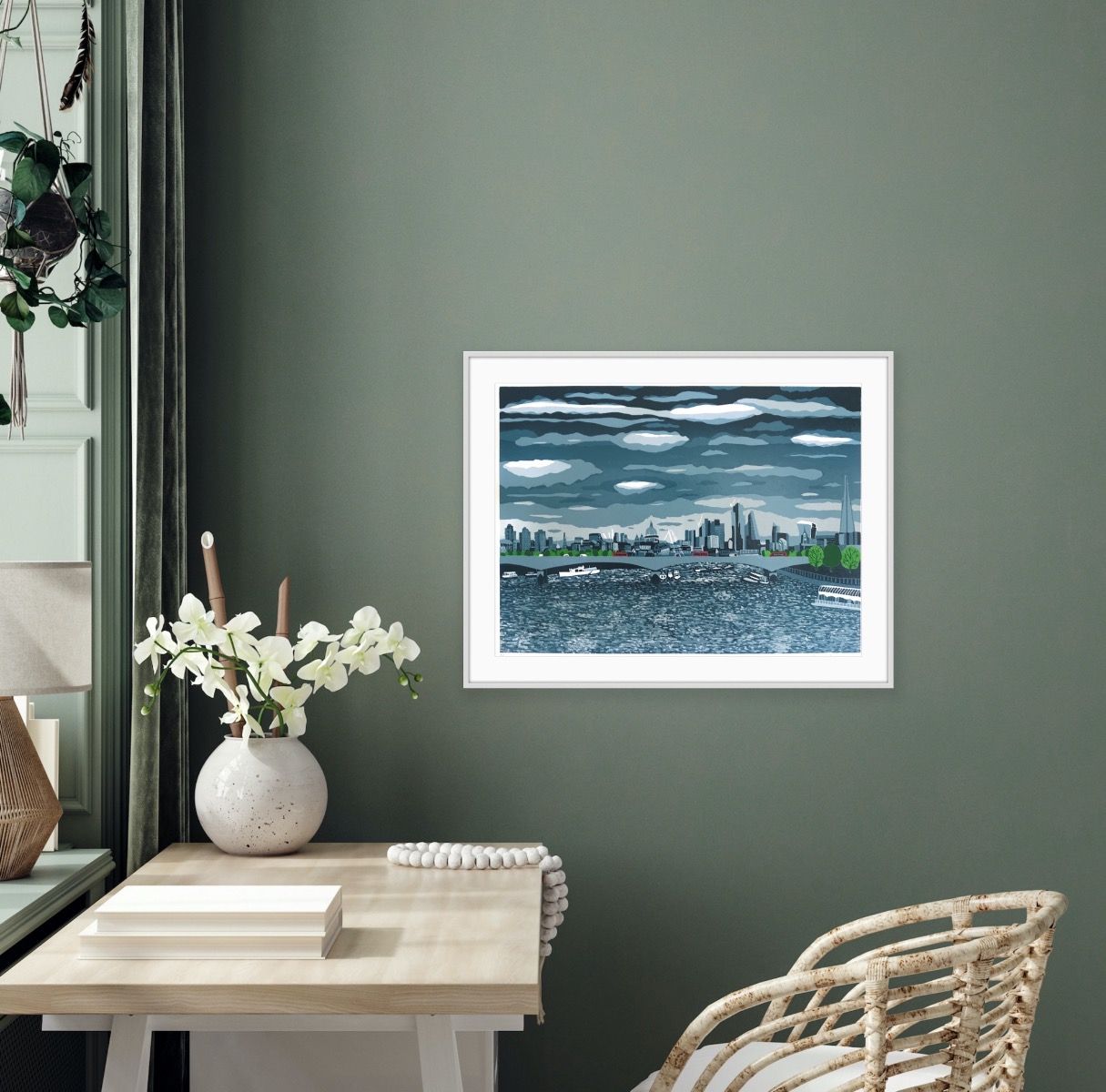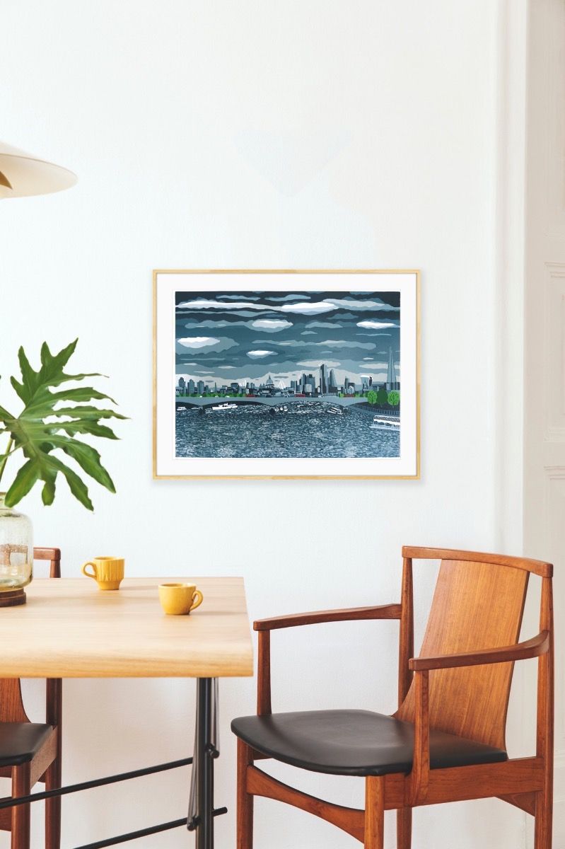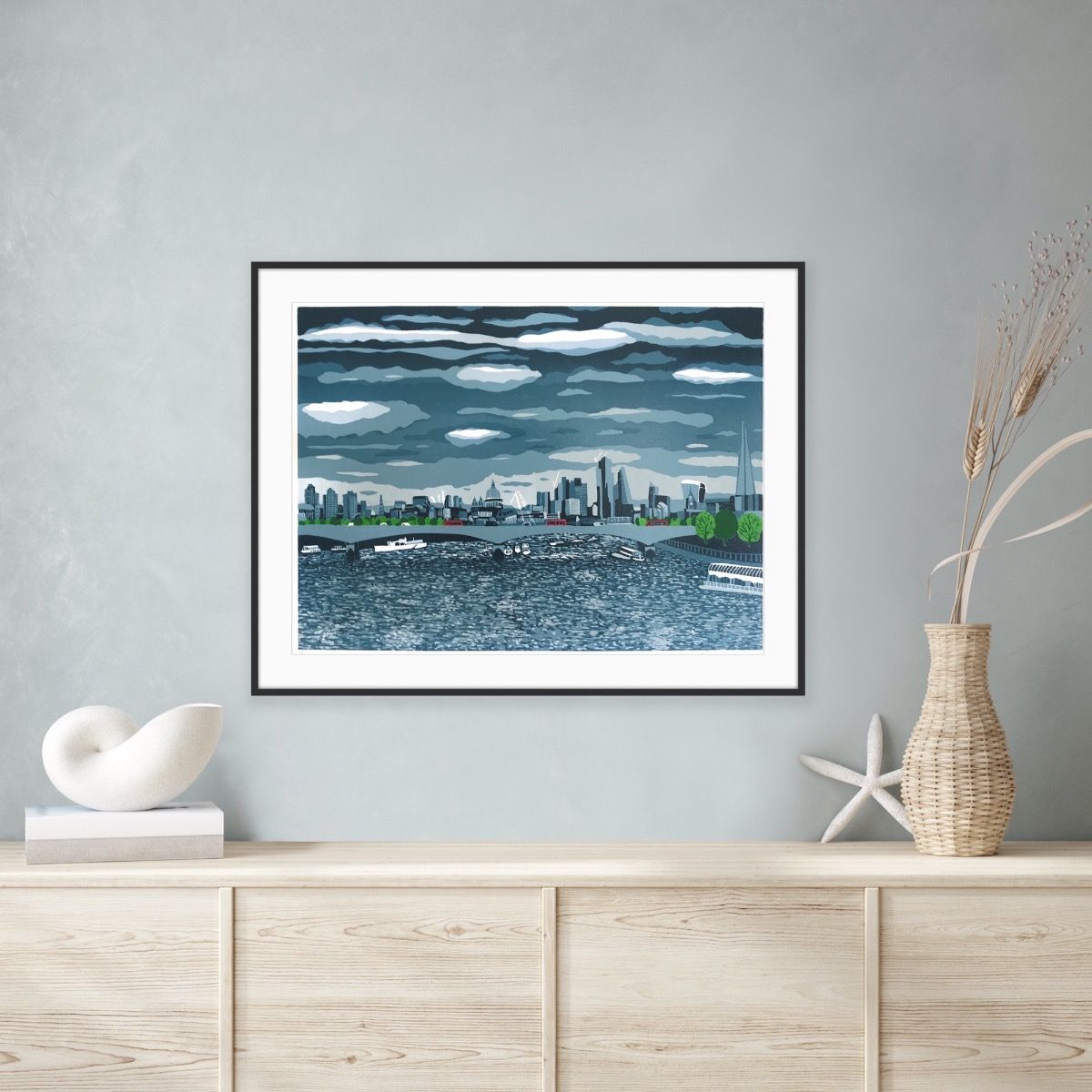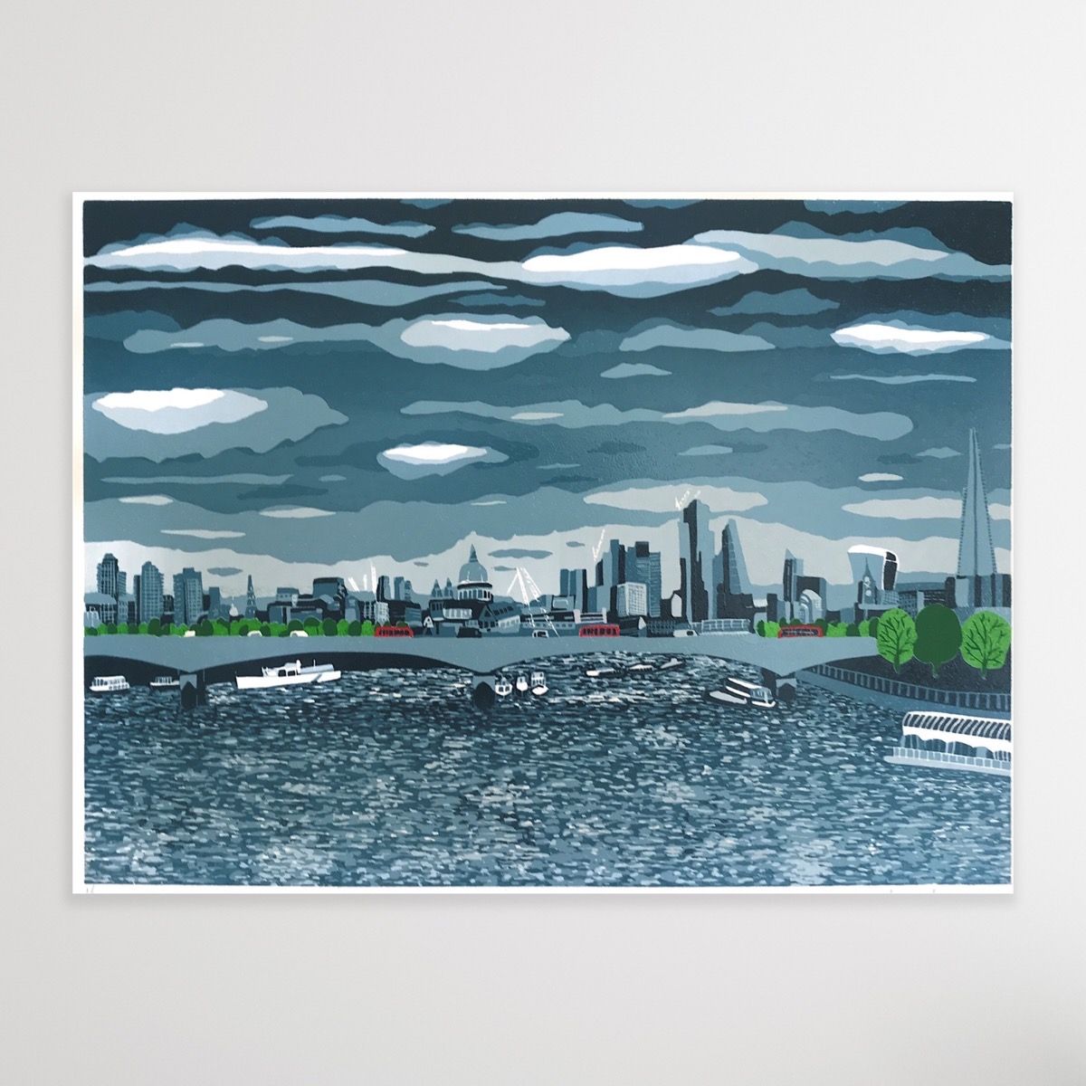 The view from London's Hungerford Bridge looking east with Waterloo Bridge in the foreground and the city skyline beyond. To depict a stormy scene was inspired by those quick heavy summer storms we experience so frequently. I had recently just been caught in one in this very spot. Printed with