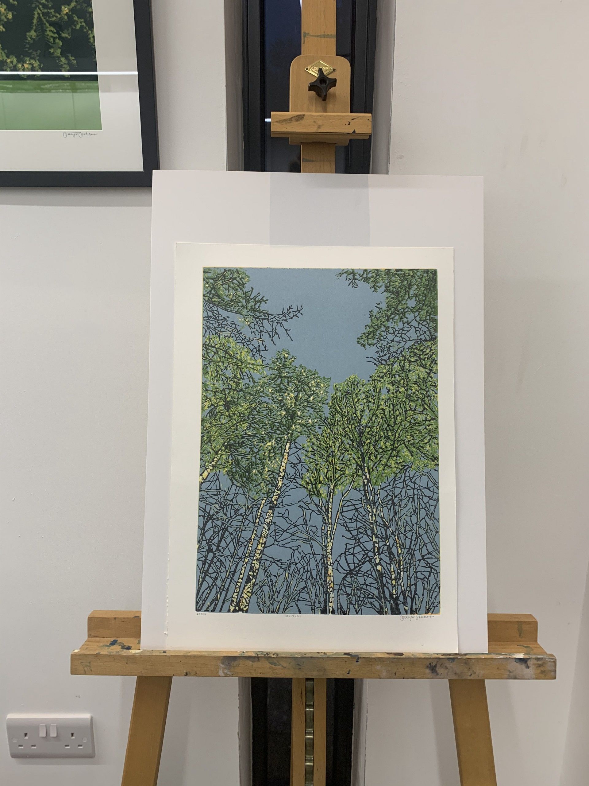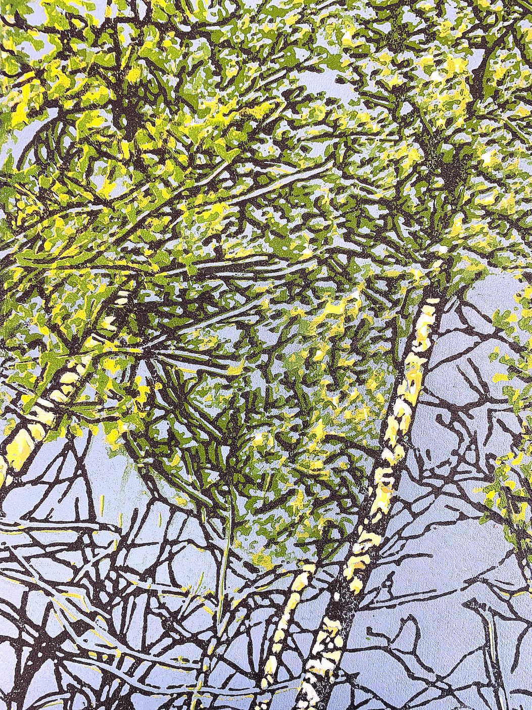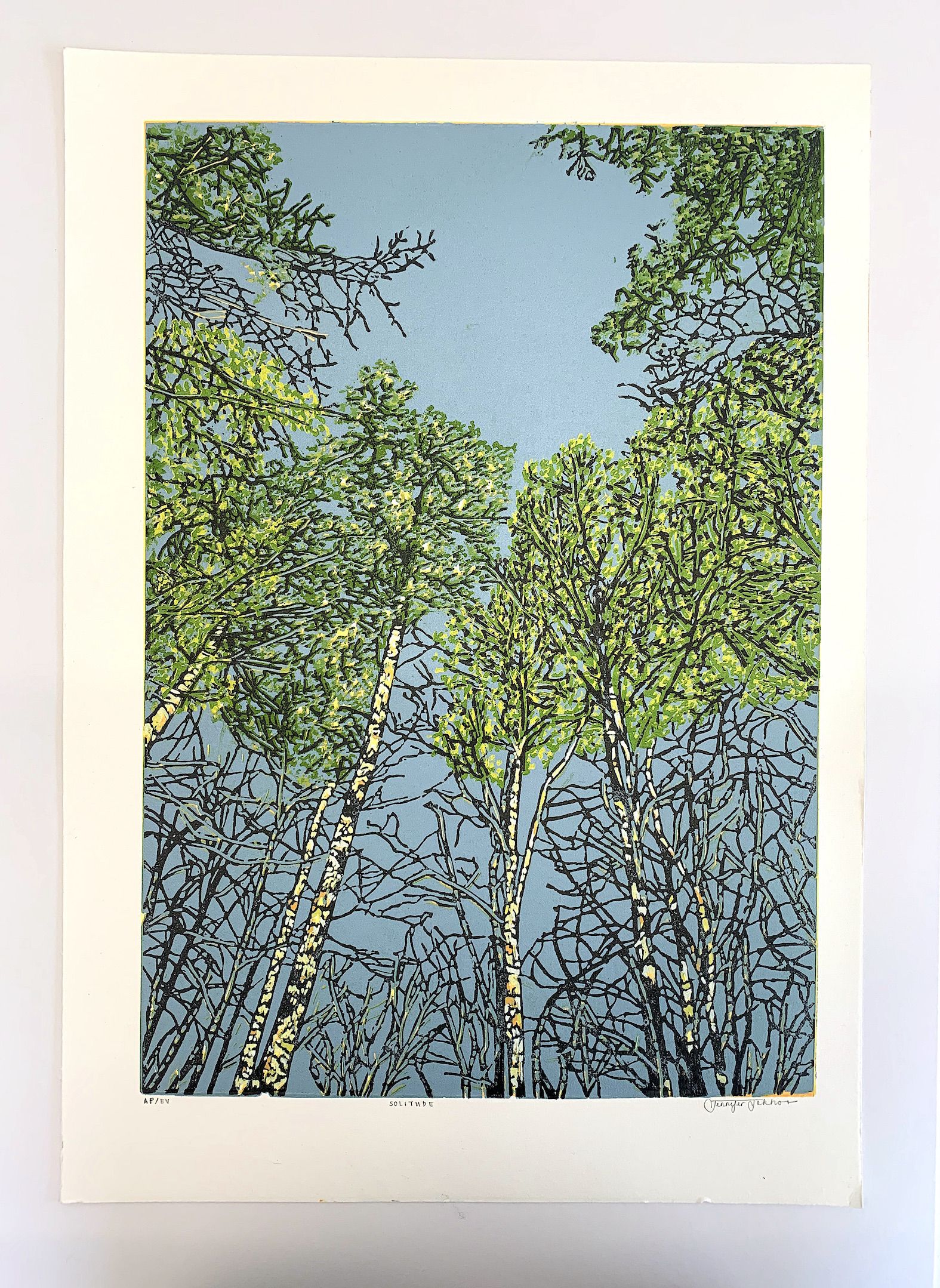 Solitude is a 7 colour reduction linocut of tree canopies created during the lockdown. Many late summer mornings were spent with our dog in the Surrey Hills. The birch trees were mainly still lush green but slowly the leaves begin to turn...