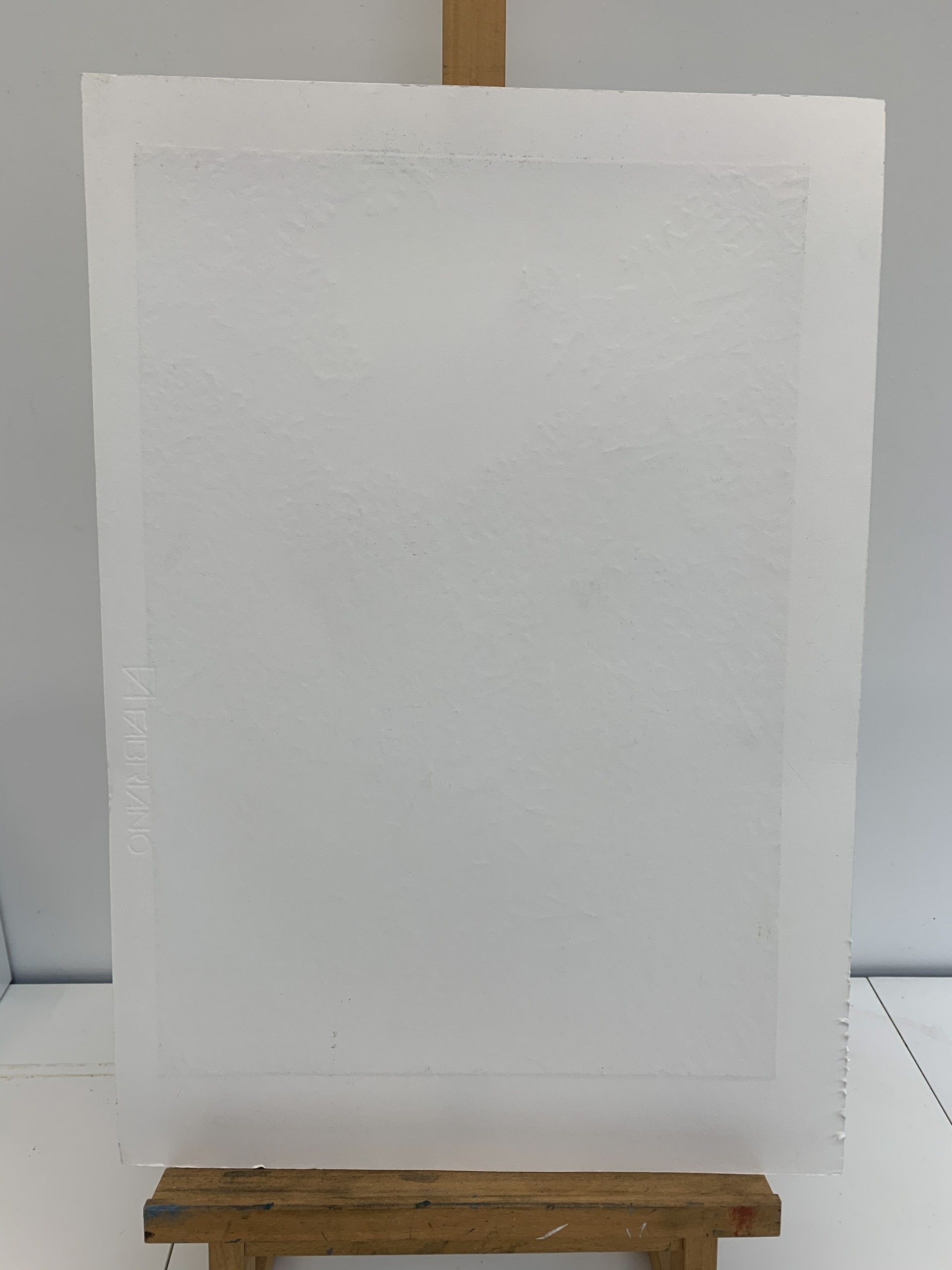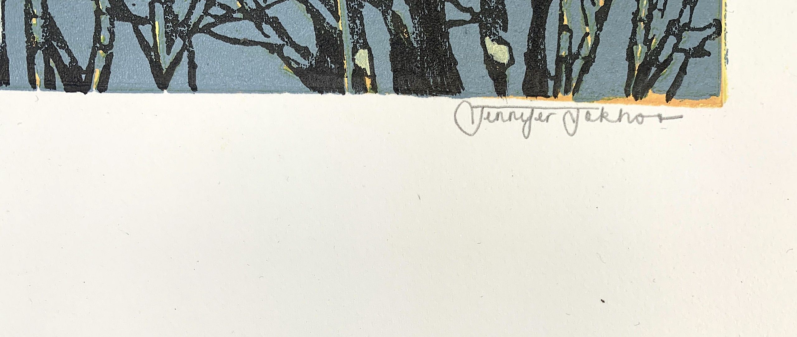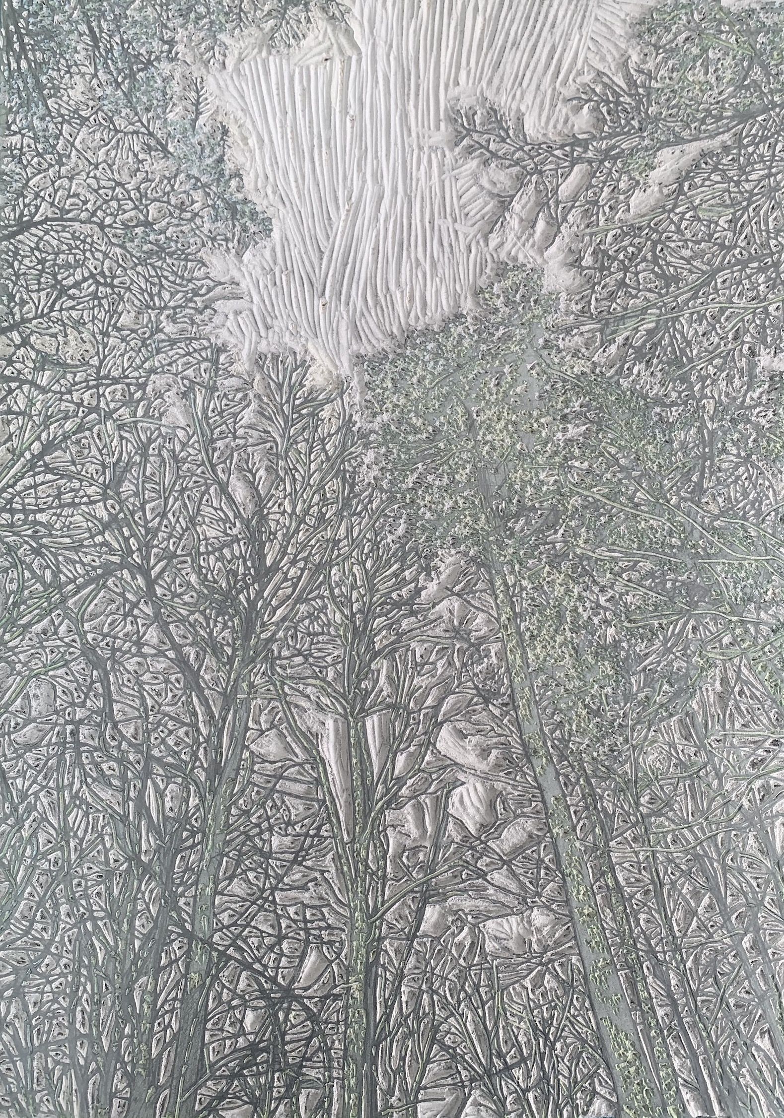 Solitude is a 7 colour reduction linocut of tree canopies created during the lockdown. Many late summer mornings were spent with our dog in the Surrey Hills. The birch trees were mainly still lush green but slowly the leaves begin to turn...