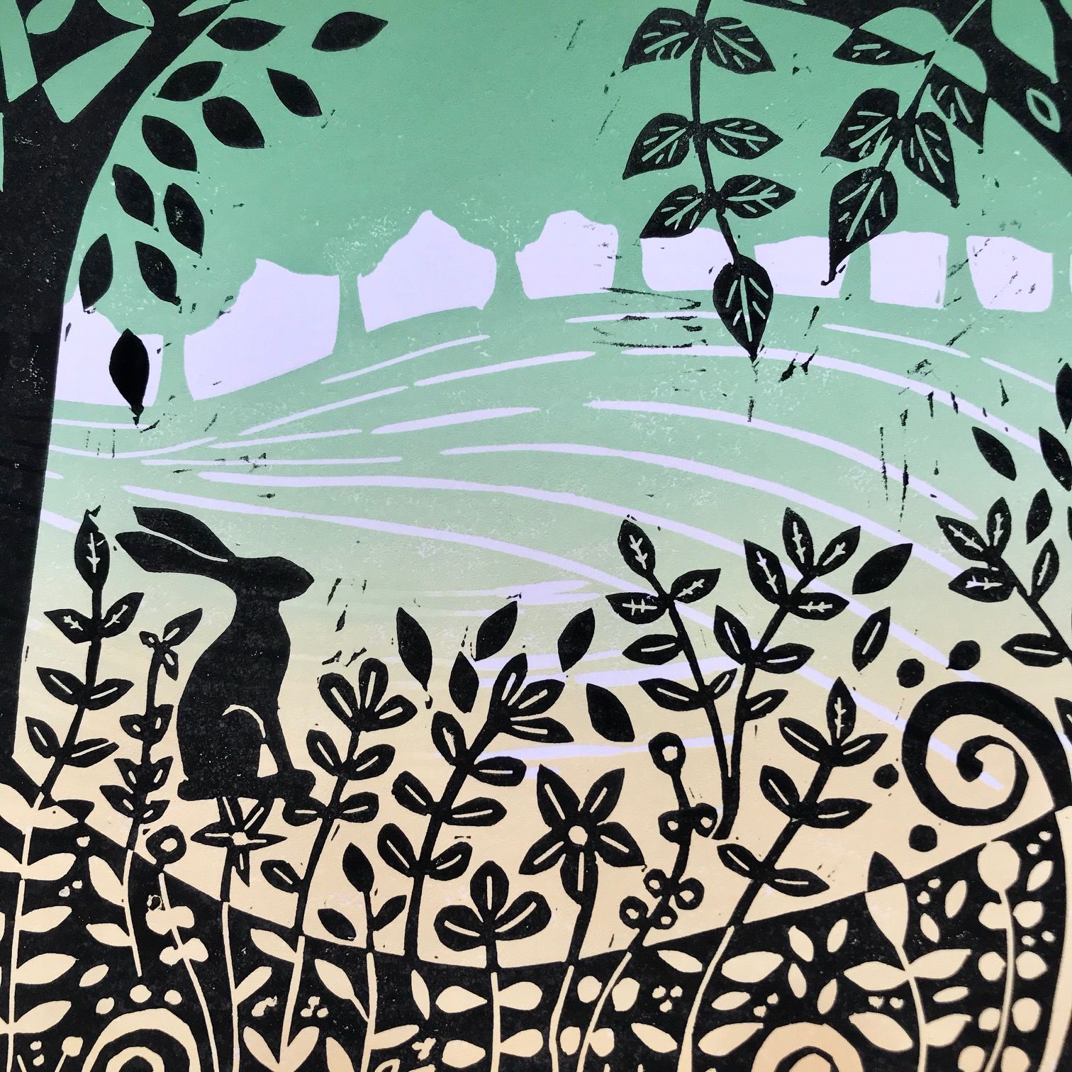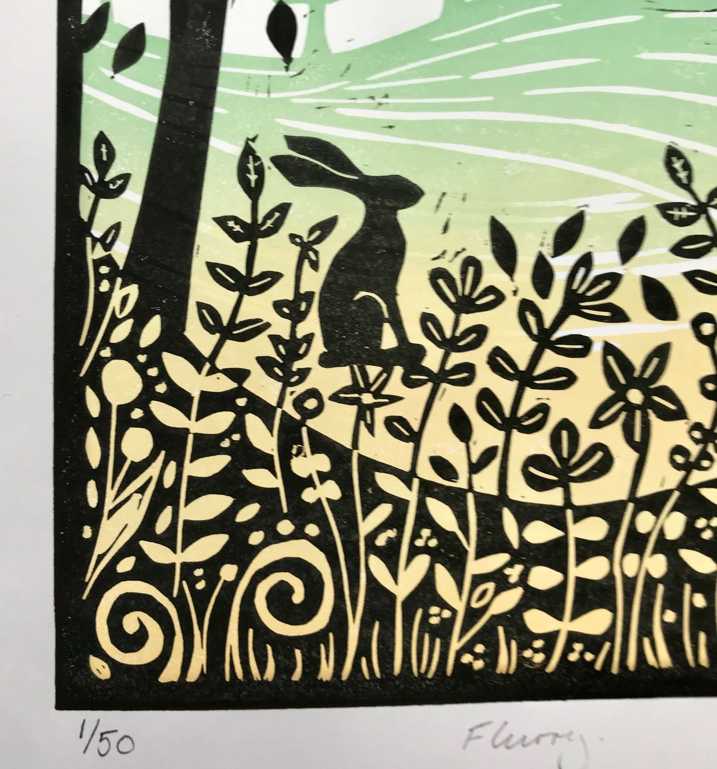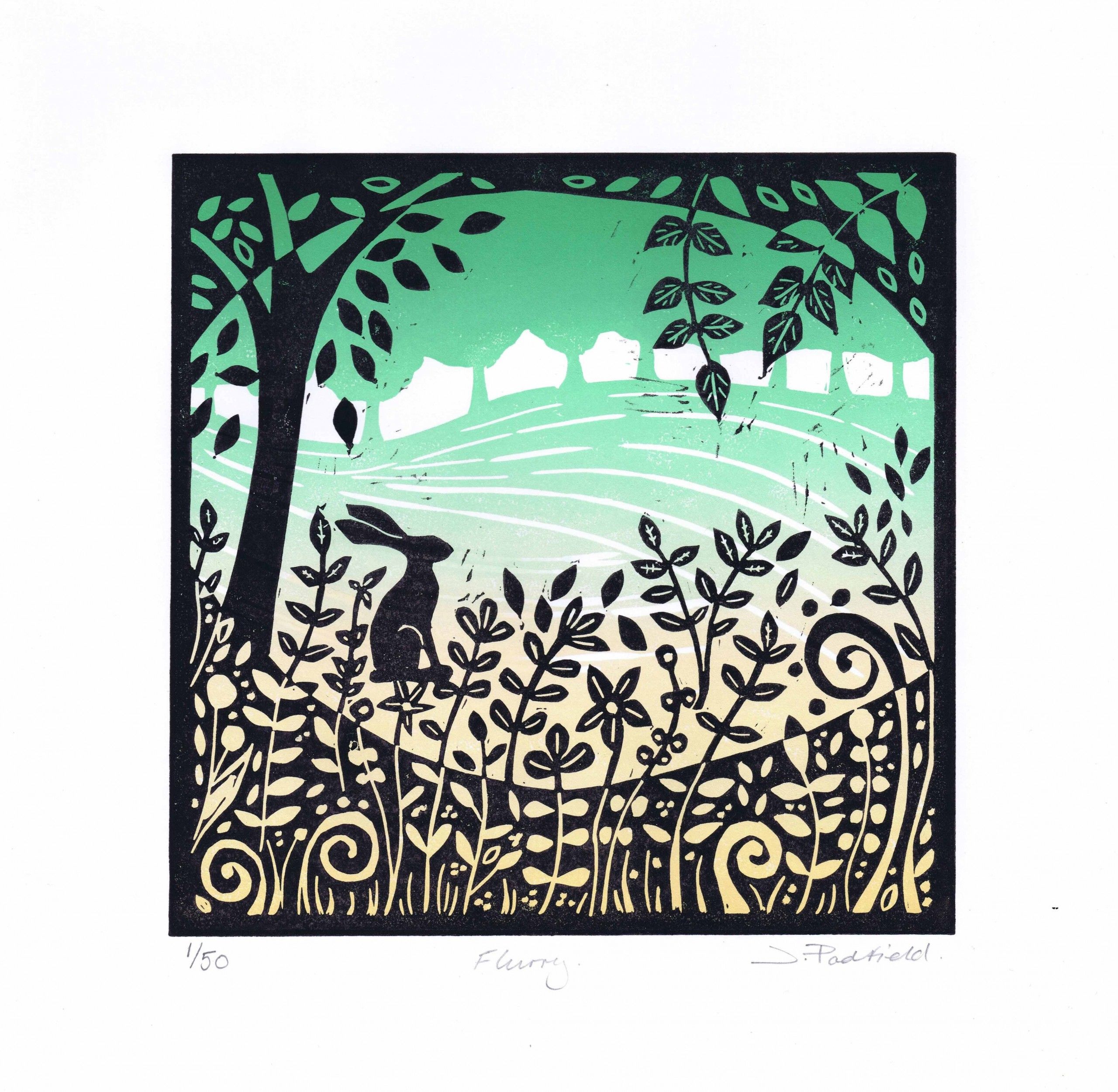 Flurry is a limited edition linocut print by Joanna Padfield. This linocut depicts a hare sitting under a tree, surrounded by a flurry of leaves and swaying flowers. In the background are fields and green trees. Joanna Padfield is an artist based in rural Norfolk – I love the natural world