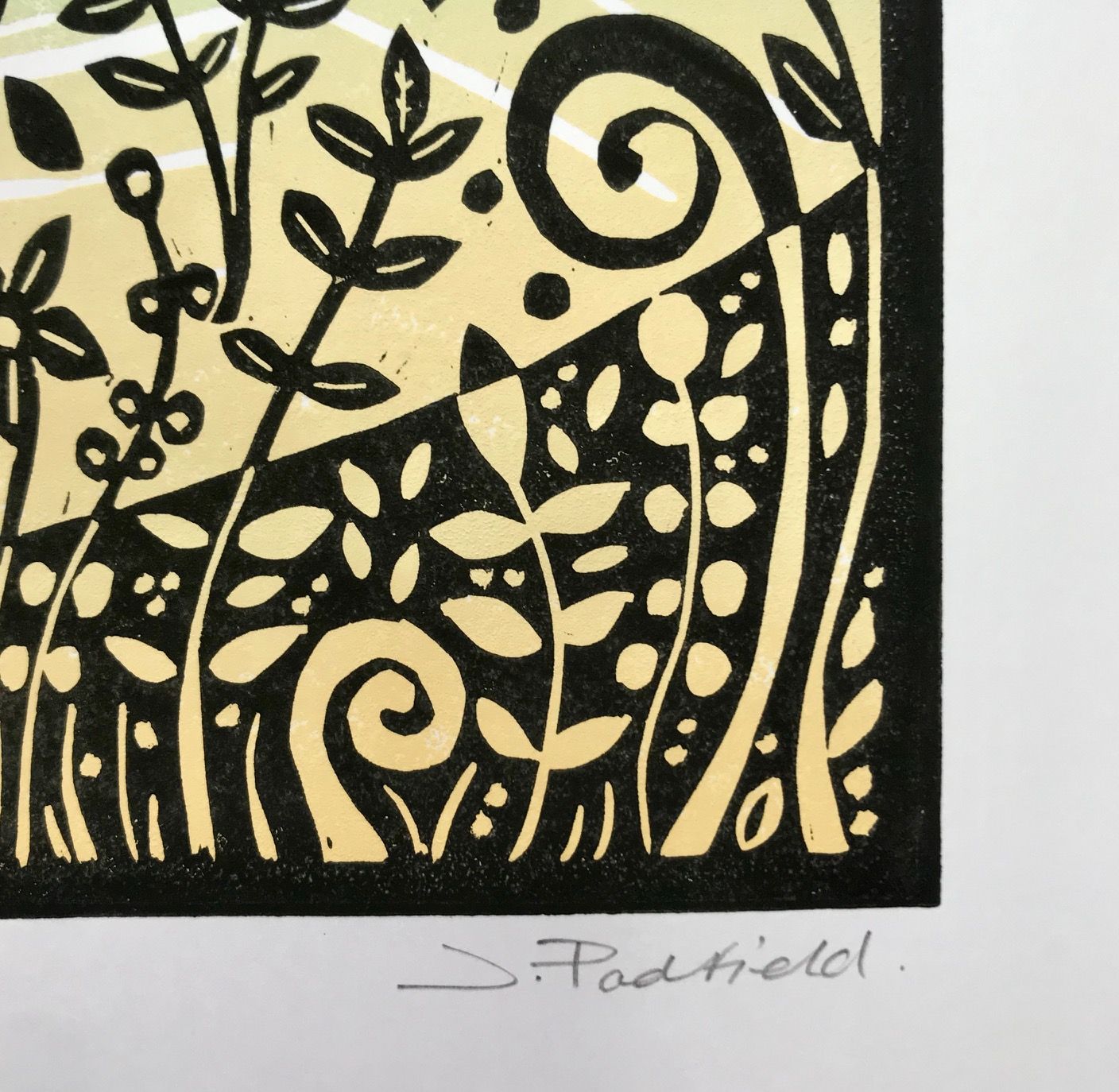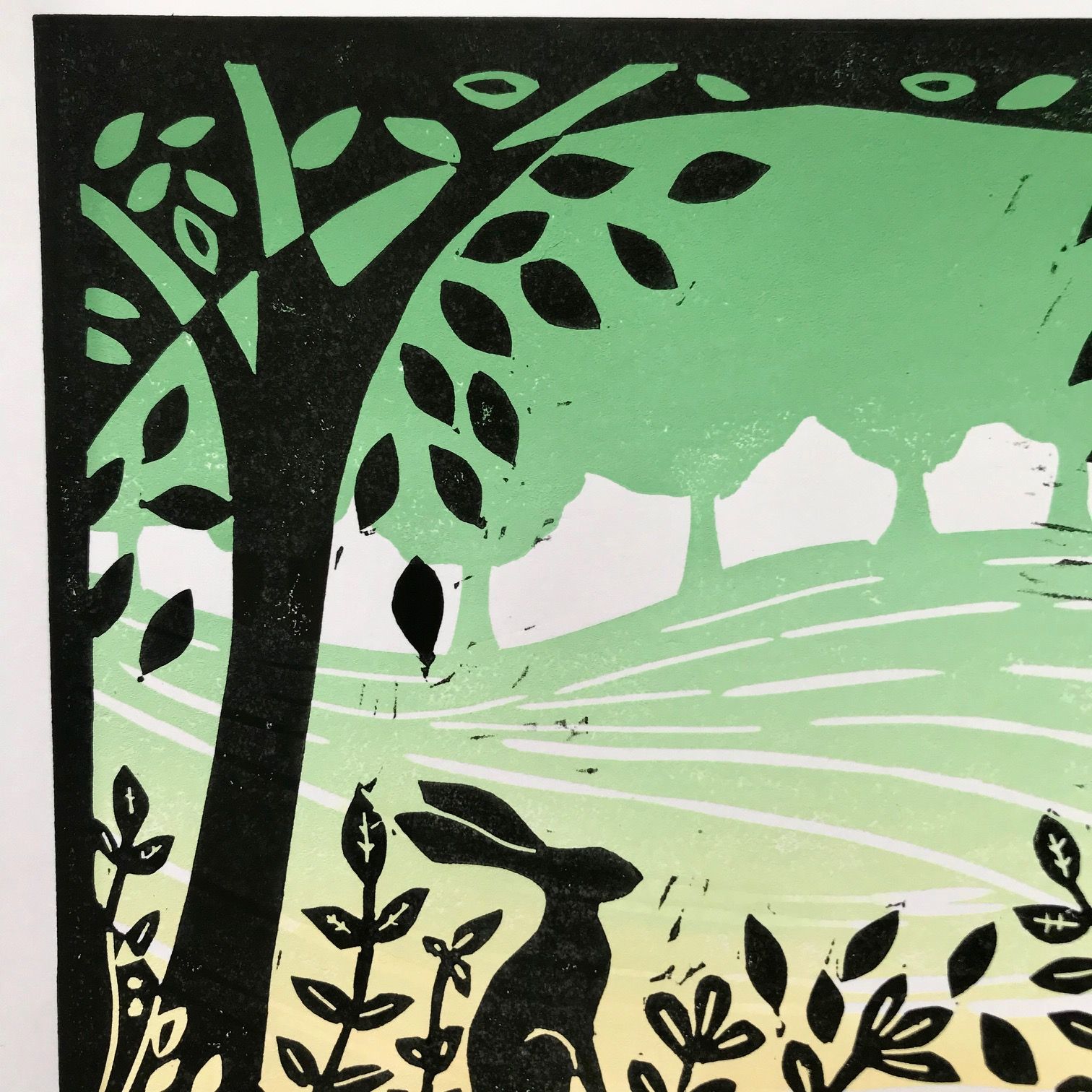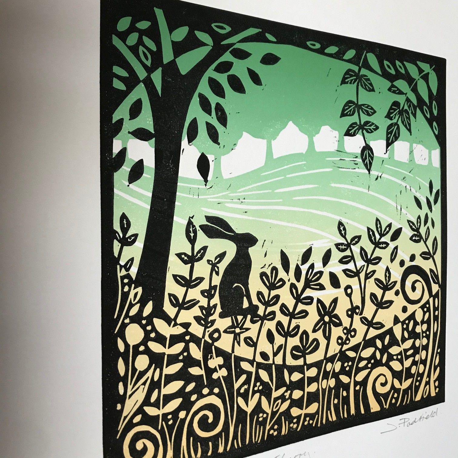 Flurry is a limited edition linocut print by Joanna Padfield. This linocut depicts a hare sitting under a tree, surrounded by a flurry of leaves and swaying flowers. In the background are fields and green trees. Joanna Padfield is an artist based in rural Norfolk – I love the natural world