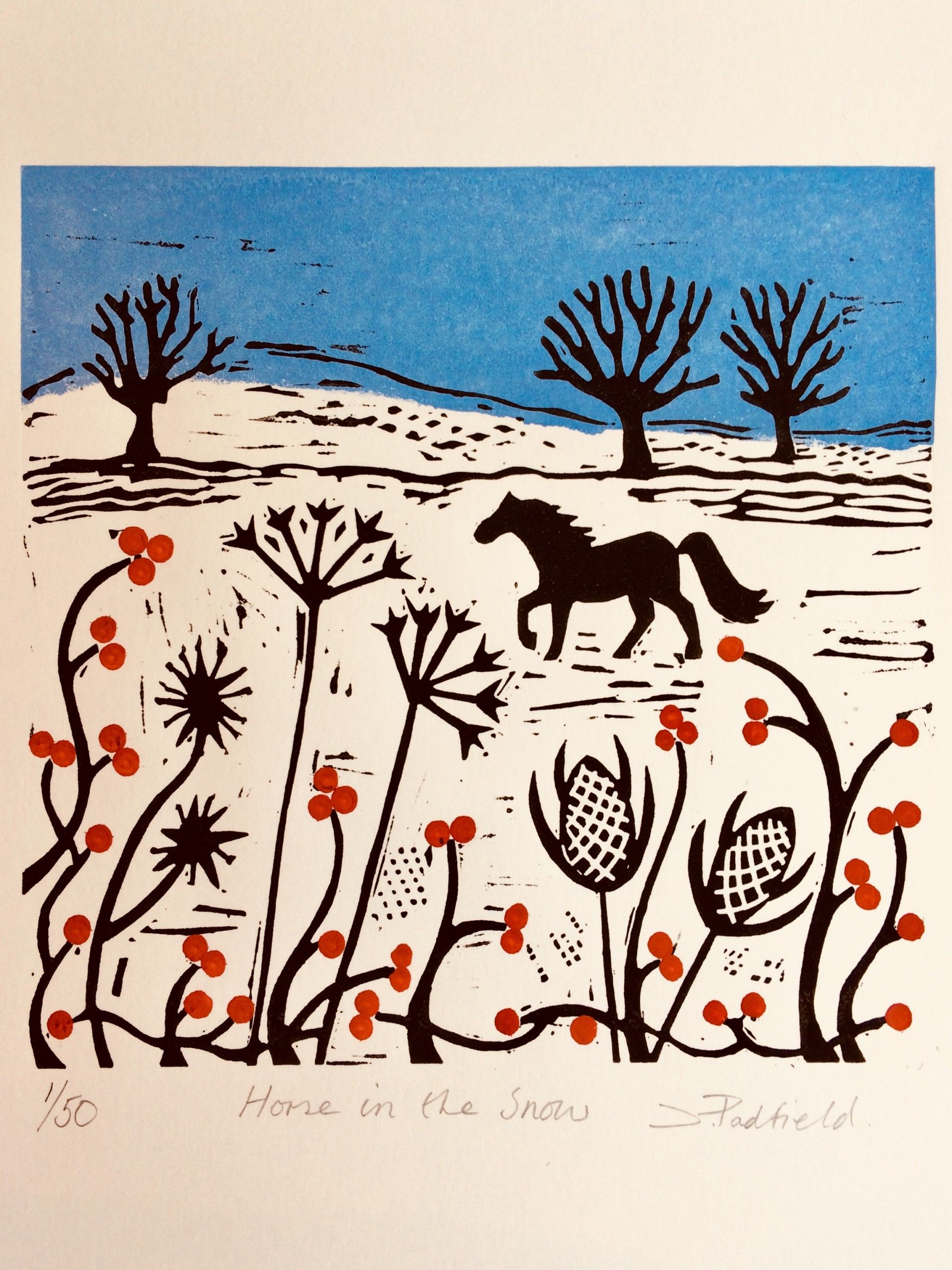 Joanna Padfield Horse in the snow Limited Edition Linocut Print on Paper Edition of 50 Image Size: H 15cm x W 15cm Paper Size: H 25cm x 25cm Sold Unframed Please note that in situ images are purely an indication of how a piece may look. Horse in the snow is a limited edition linocut landscape print by