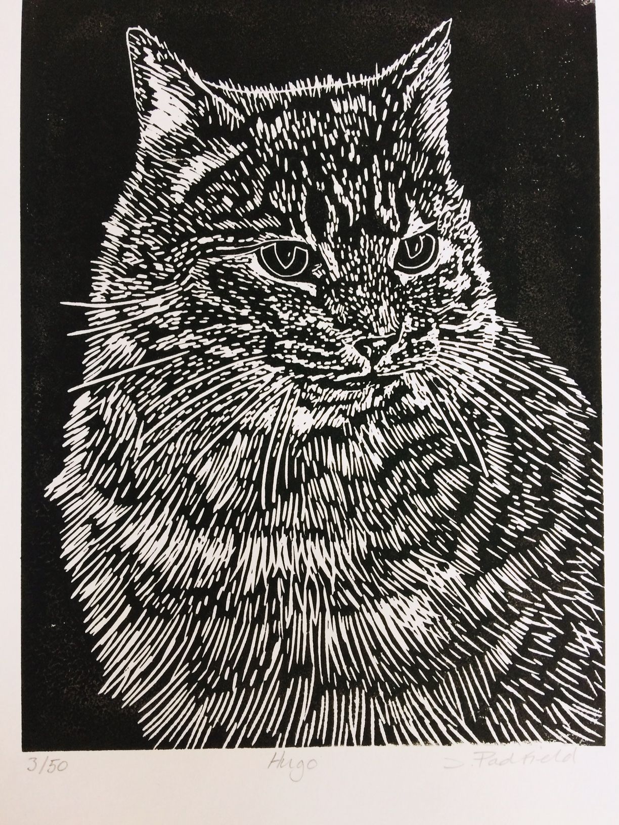 Joanna Padfield Title: Hugo Limited Edition Linocut Print on Paper Edition of 50 Image Size: H 20cm x W 15cm Paper Size: H24.5cm x W 21.5cm Sold Unframed Hugo is a limited edition linocut print of a Maine Coon cat by Joanna Padfield. I am an artist based in rural Norfolk. I love the natural world and my