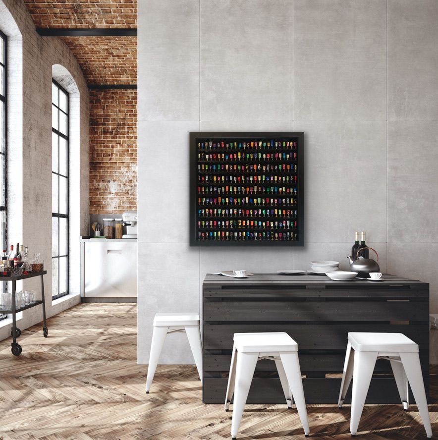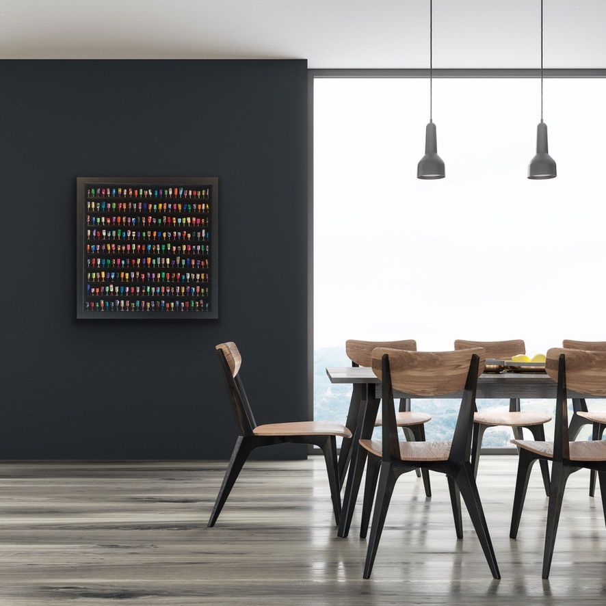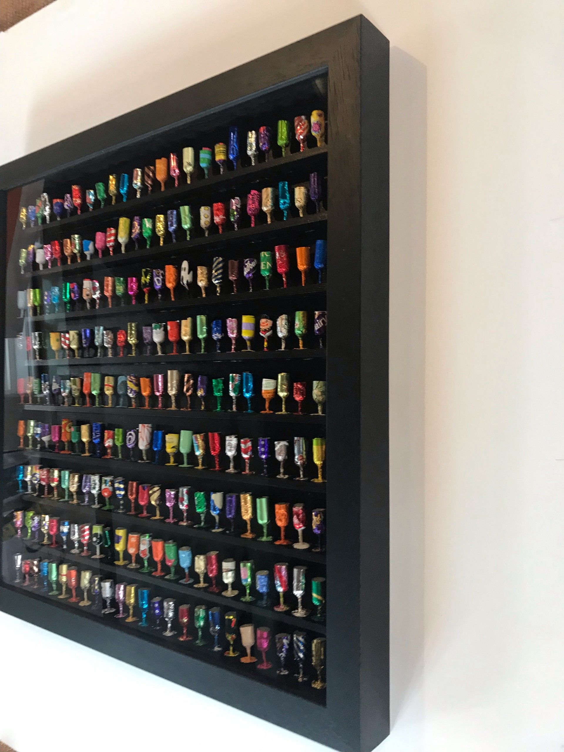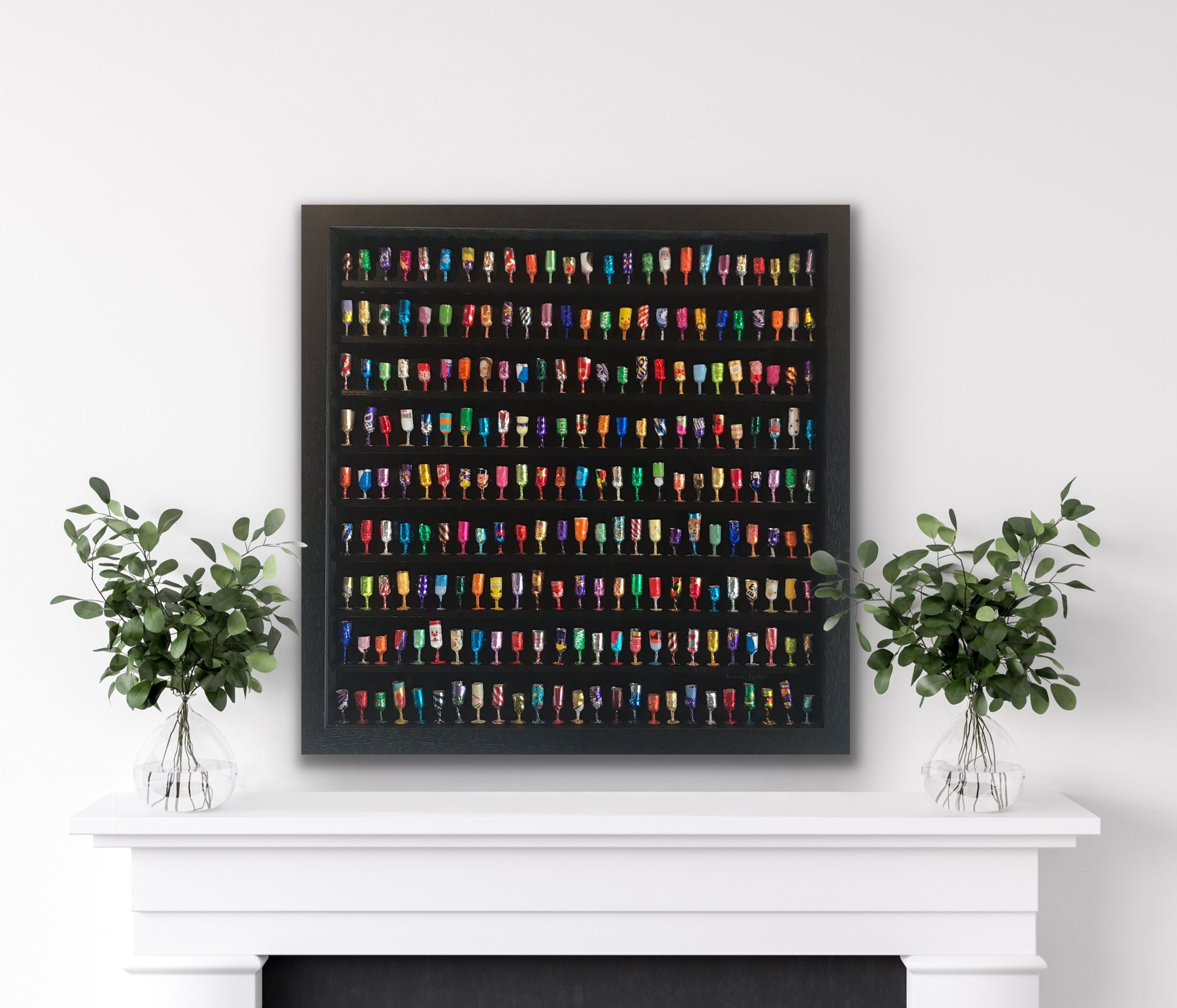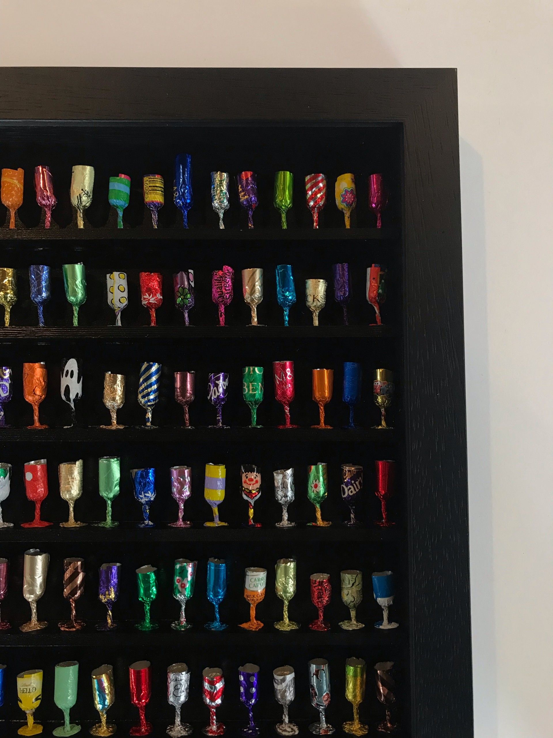Goblets XXV is a signed original wall sculpture made from sweet wrappers by Joanne Tinker of a selection of colourful wine goblets on a black shelved frame.
