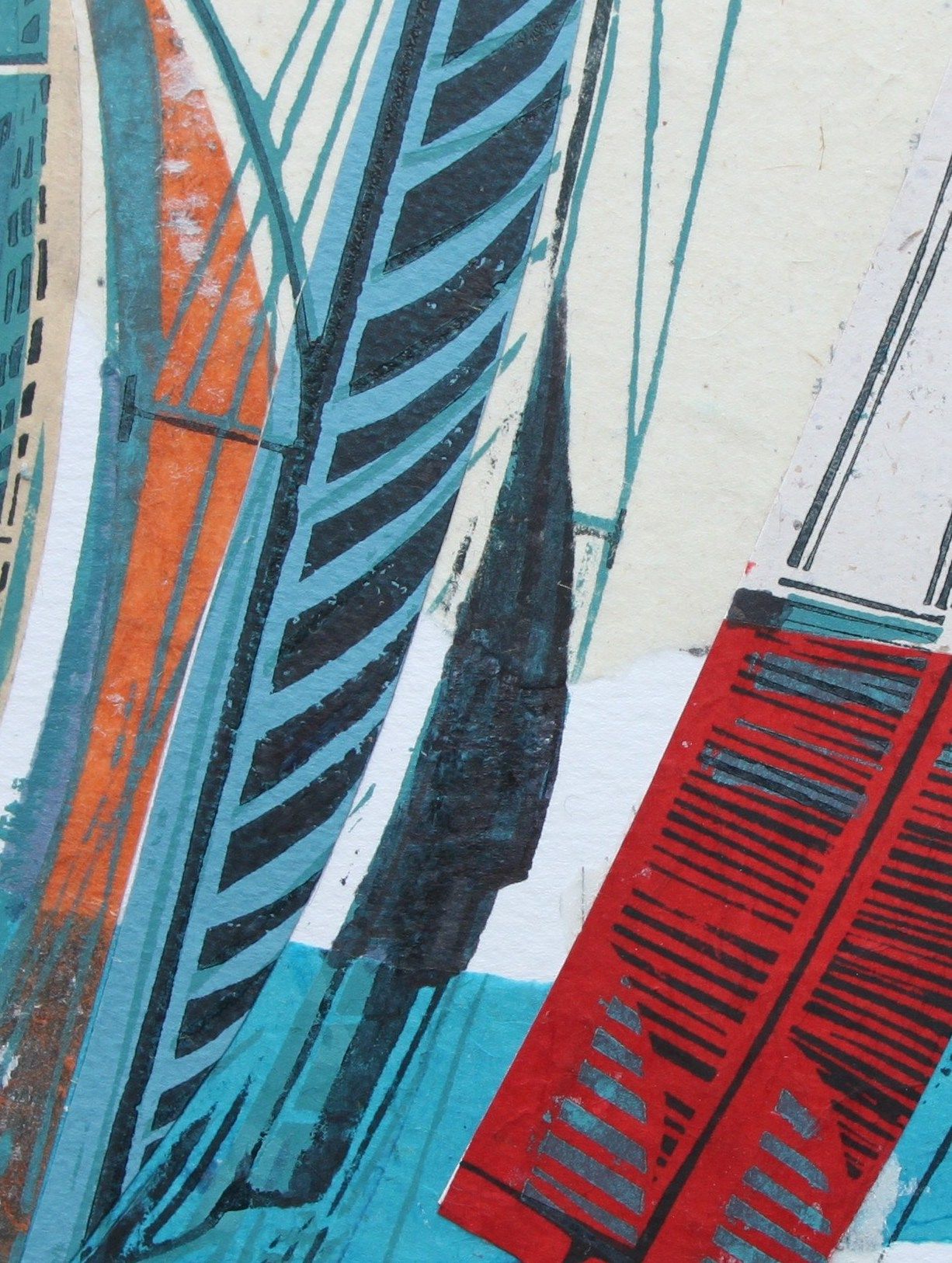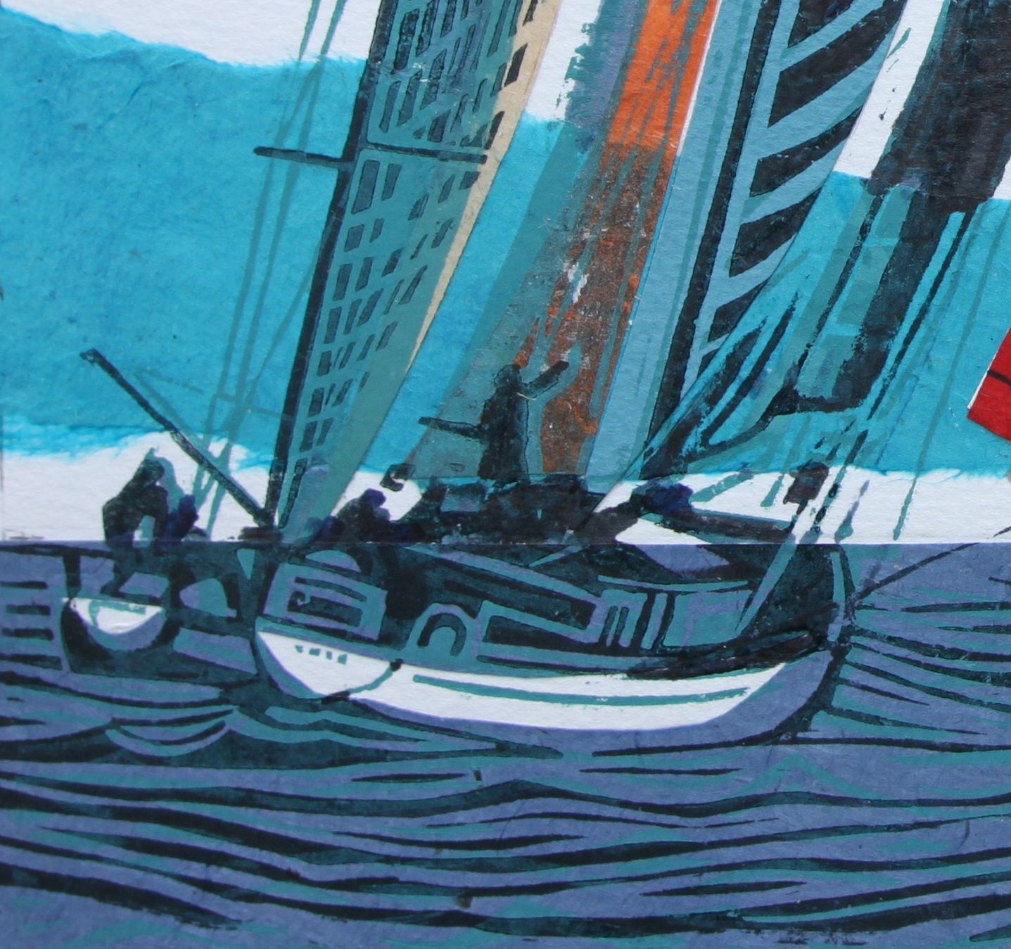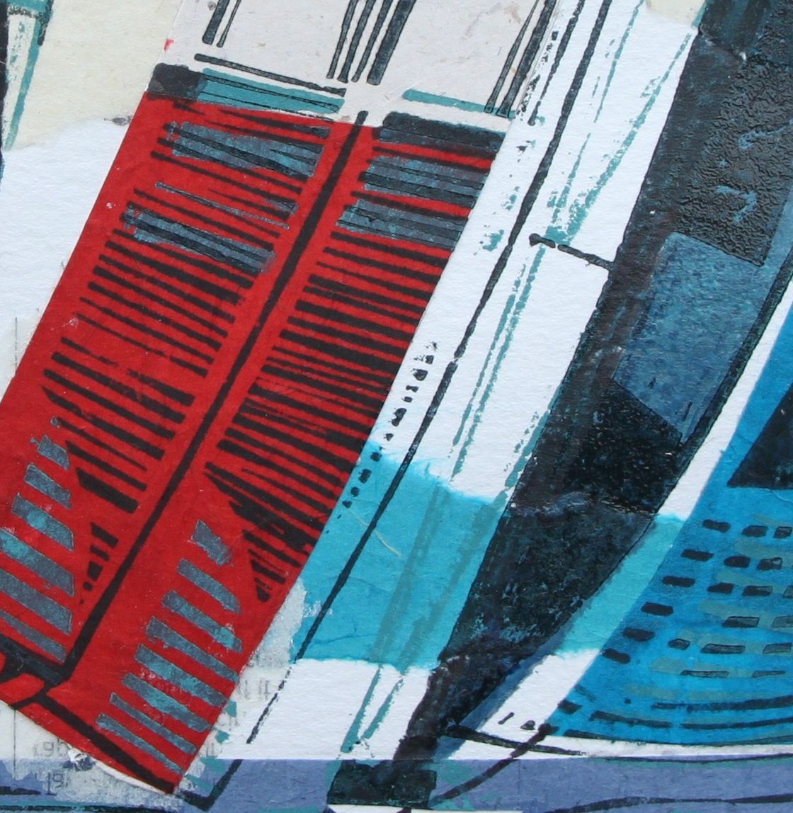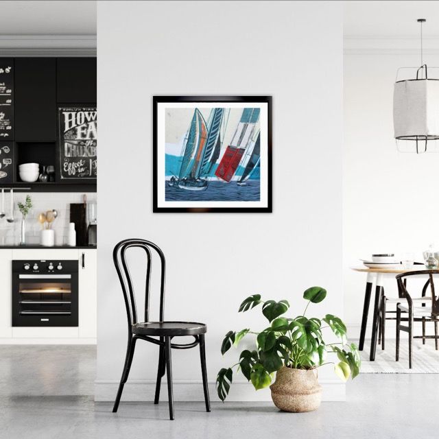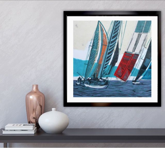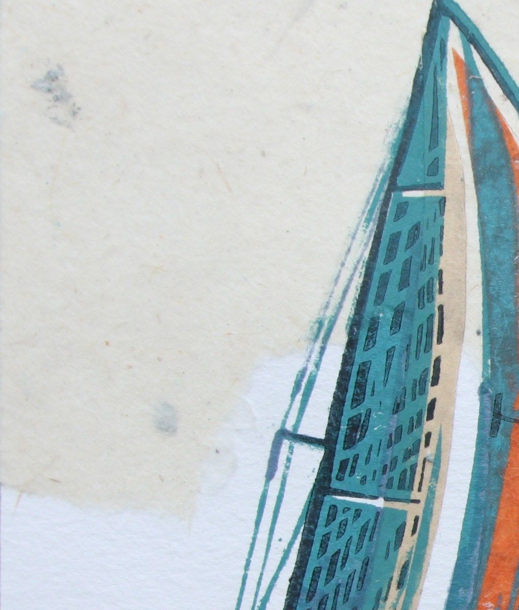 John Scott Martin Cowes Classic Unique Linocut Prints Linocut on Collage Image Size: H 20cm x W 20cm x D 0.3cm Mounted Size: H 34.5cm x W 34cm x D 0.3cm Sold Unframed Cowes Classic is a unique linocut print on collage by John Scott Martin. The bright colours of the sails and rustic use of line makes this