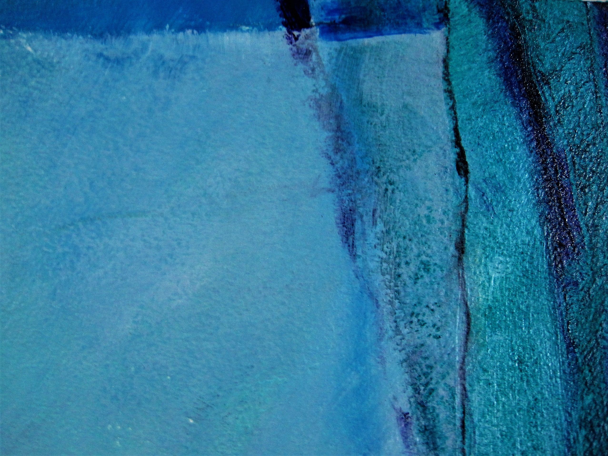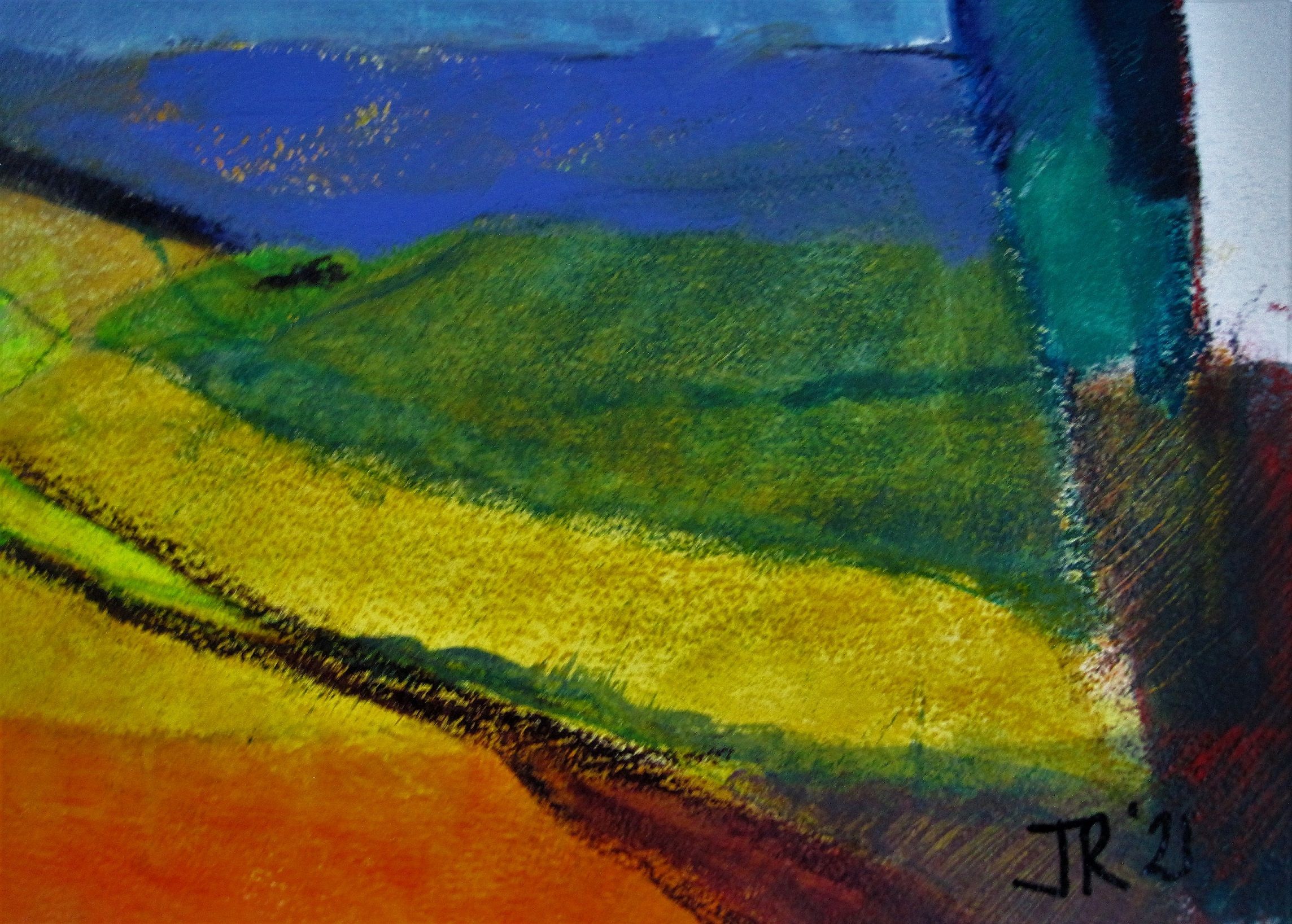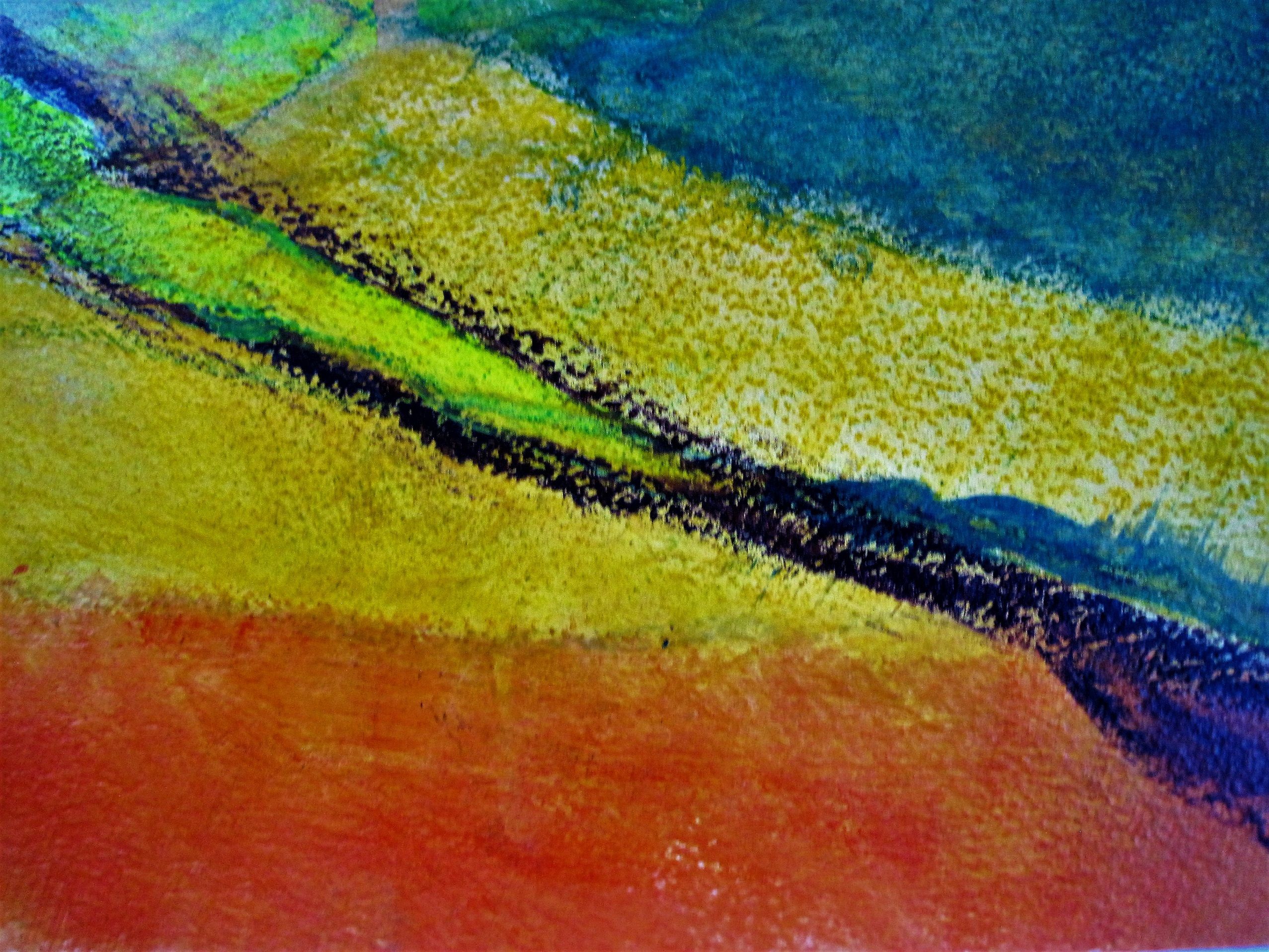 Jon Rowland - This is one of a series of abstract multi-media paintings that have emerged of walks through neighbouring woods and peering out to open fields. The painting is also my response to the impact of wind. The colour palette reflects the usage of pastels, and the bright colours