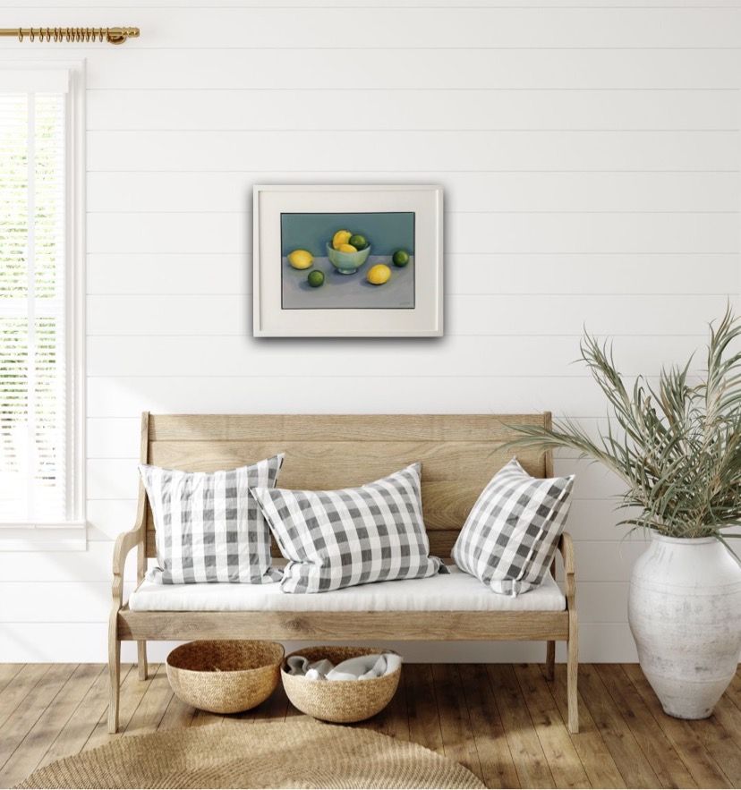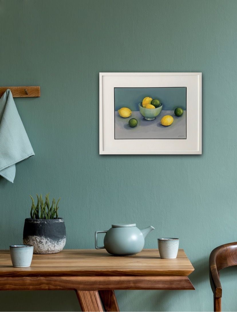 Jonquil Williamson Lemons and Limes with bowl Contemporary Still Life Painting Oil on Canvas Image Size: H25 cm x W 35cm x D 1.5 cm Framed Size: H 41cm x W 51cm x D 3cm Sold Framed (white wood inset frame) (Please note that in situ images are purely an indication of how a piece may look.) Lemons