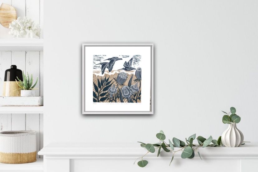 THIS WORK IS SOLD OUT AND NOT AVAILABLE ANYWHERE to ORDER. PLEASE SEE OTHER WORKS BY KATE OR CALL DEBORAH TO DISCUSS OTHER SIMILAR WORKS 07799 535 765. Kate Heiss Curlews Over The Coast Limited Edition Linocut Print Edition of 50 Printed with oil based relief inks on 300gsm soft white