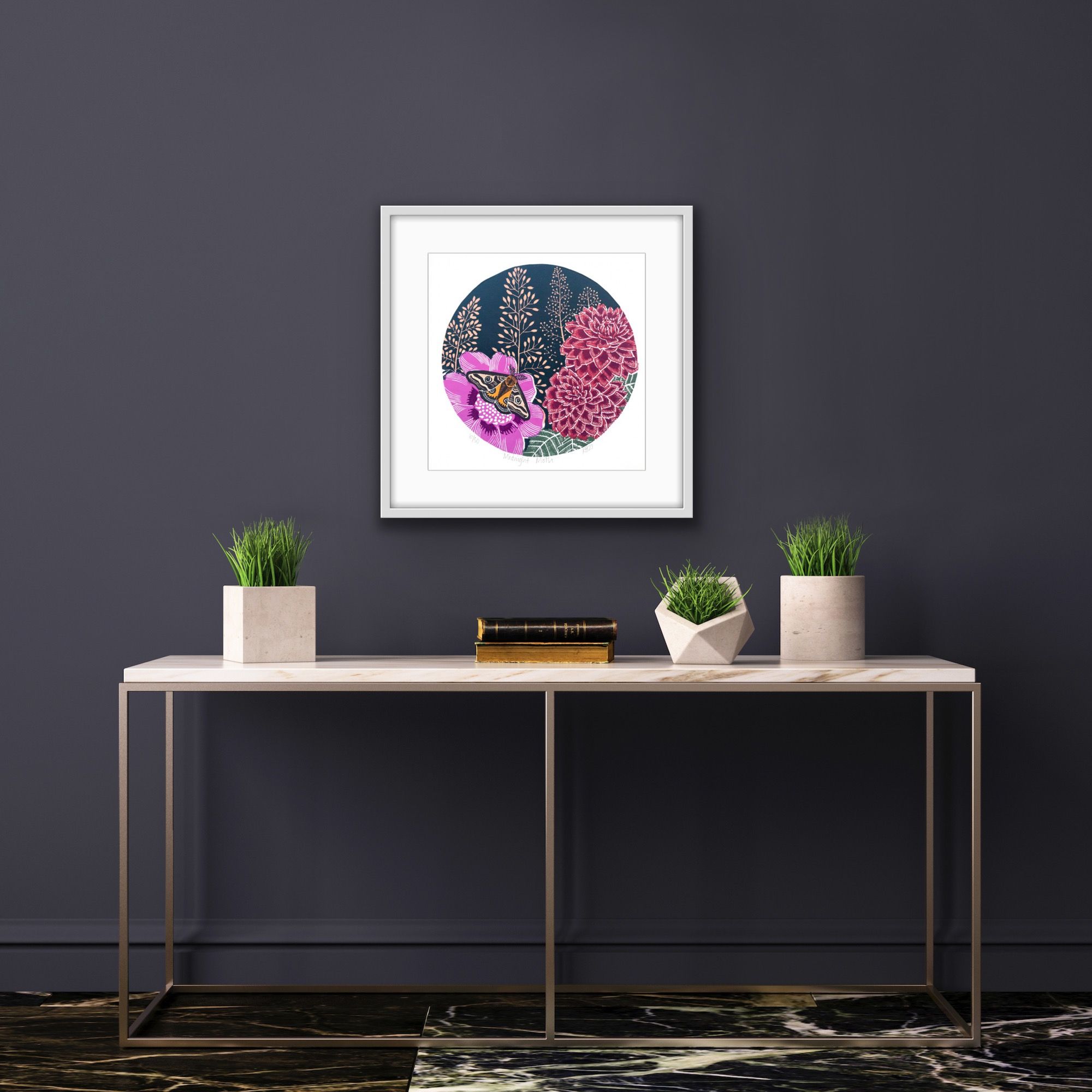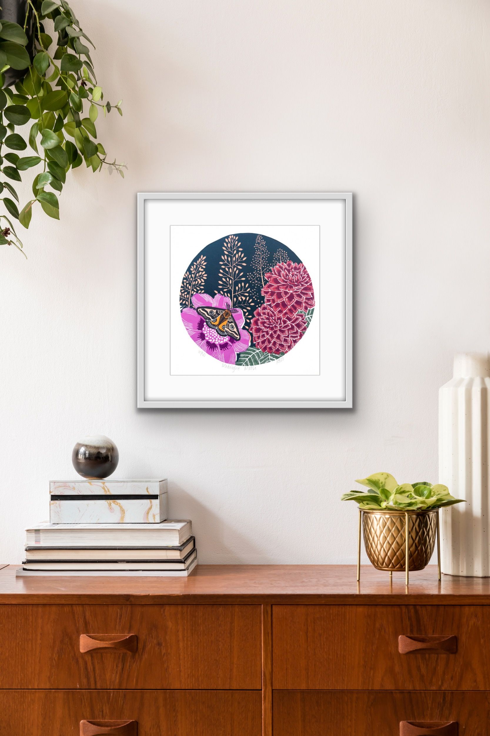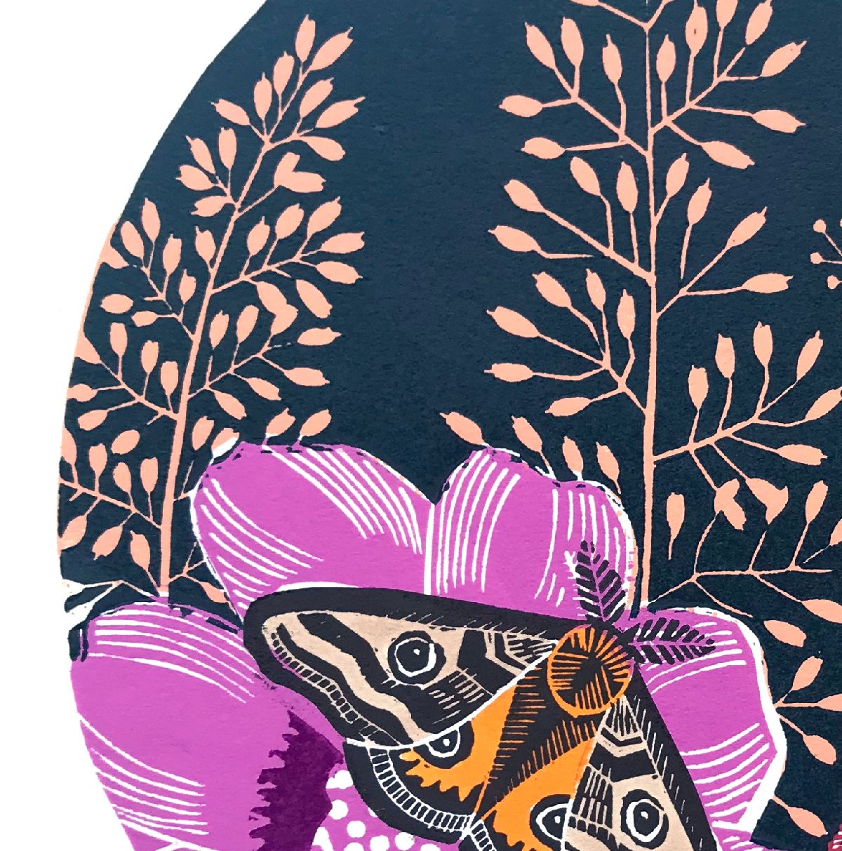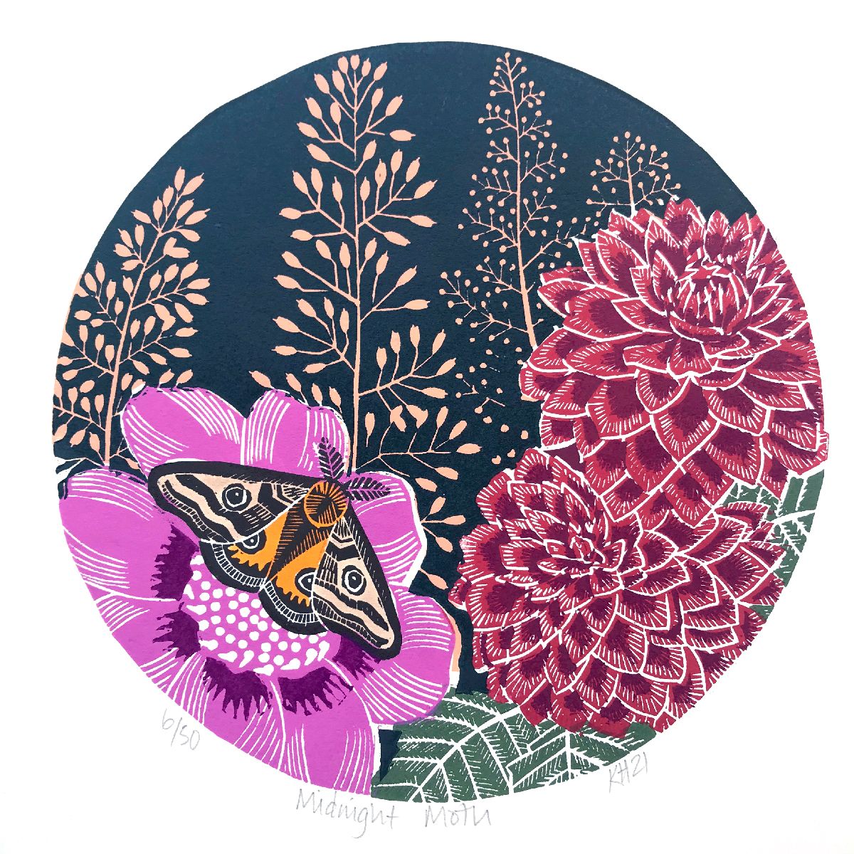 This circular garden print features a medley of summer dahlias standing proud in the moonlight and a majestic Emperor Moth. This print is cut from 5 individual Lino blocks. Limited Edition of 50 Linocut Print – A relief printing technique where lino is cut, inked and rolled to create an inverse relief