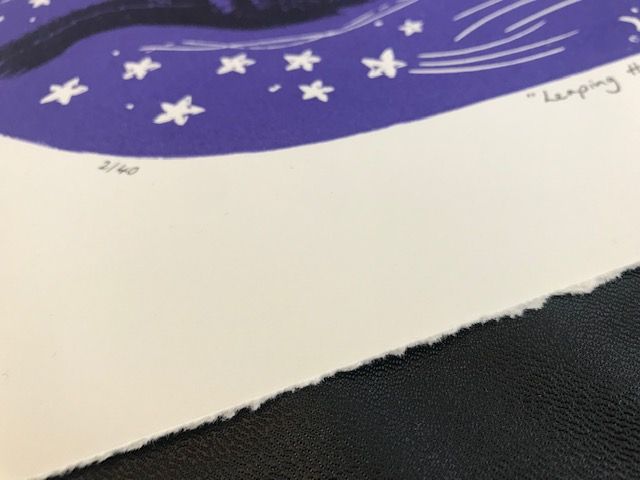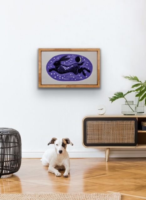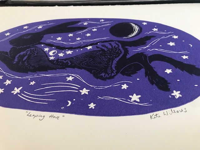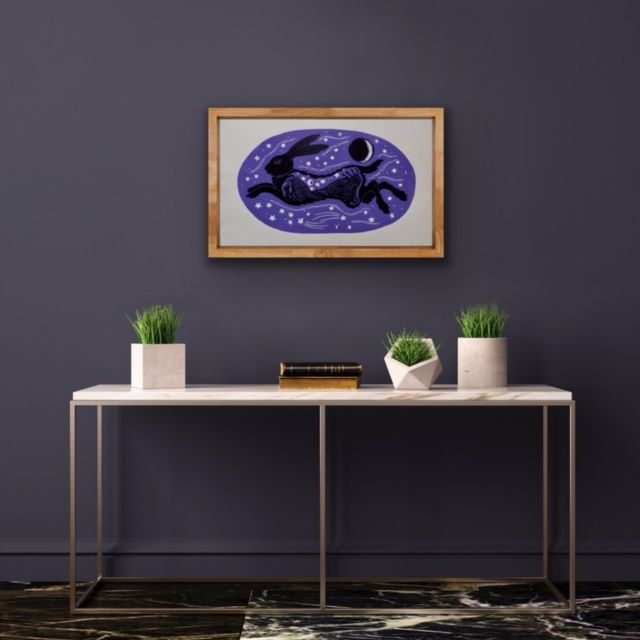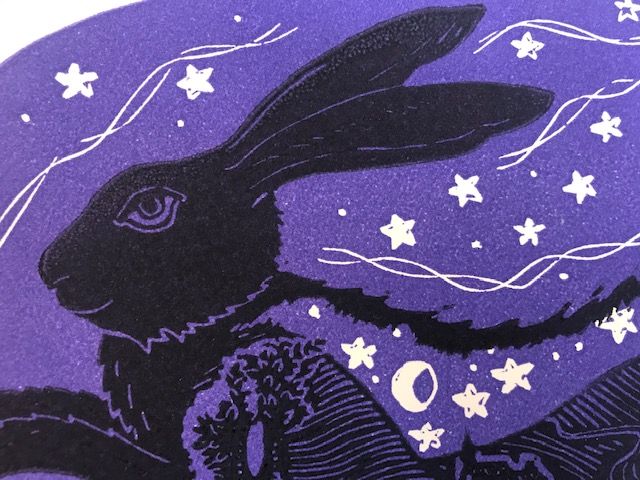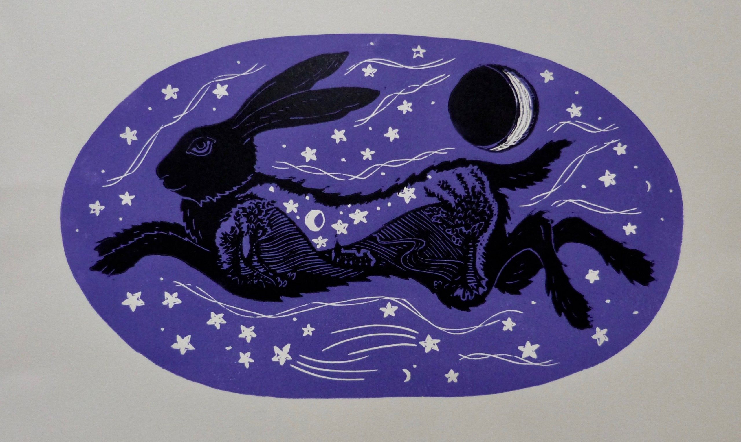 This print celebrates the beauty of the leaping hare. Once I have designed the image, I transfer it to lino, which I then hand-carve. I print the linoprint in my studio, using a roller press. As each print is individually printed, there may be slight variations in tone and colour. This print