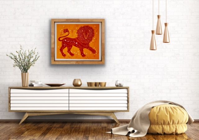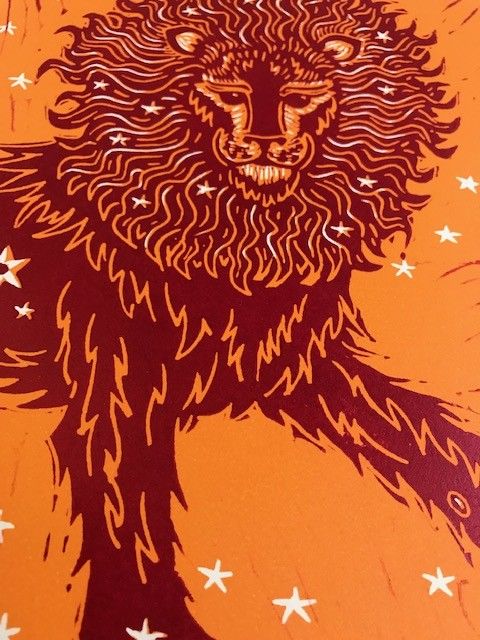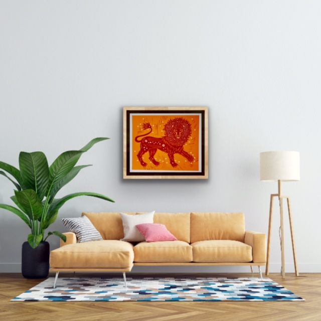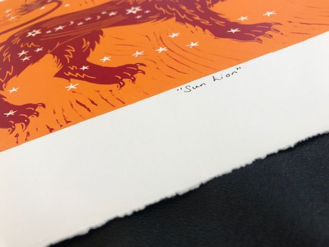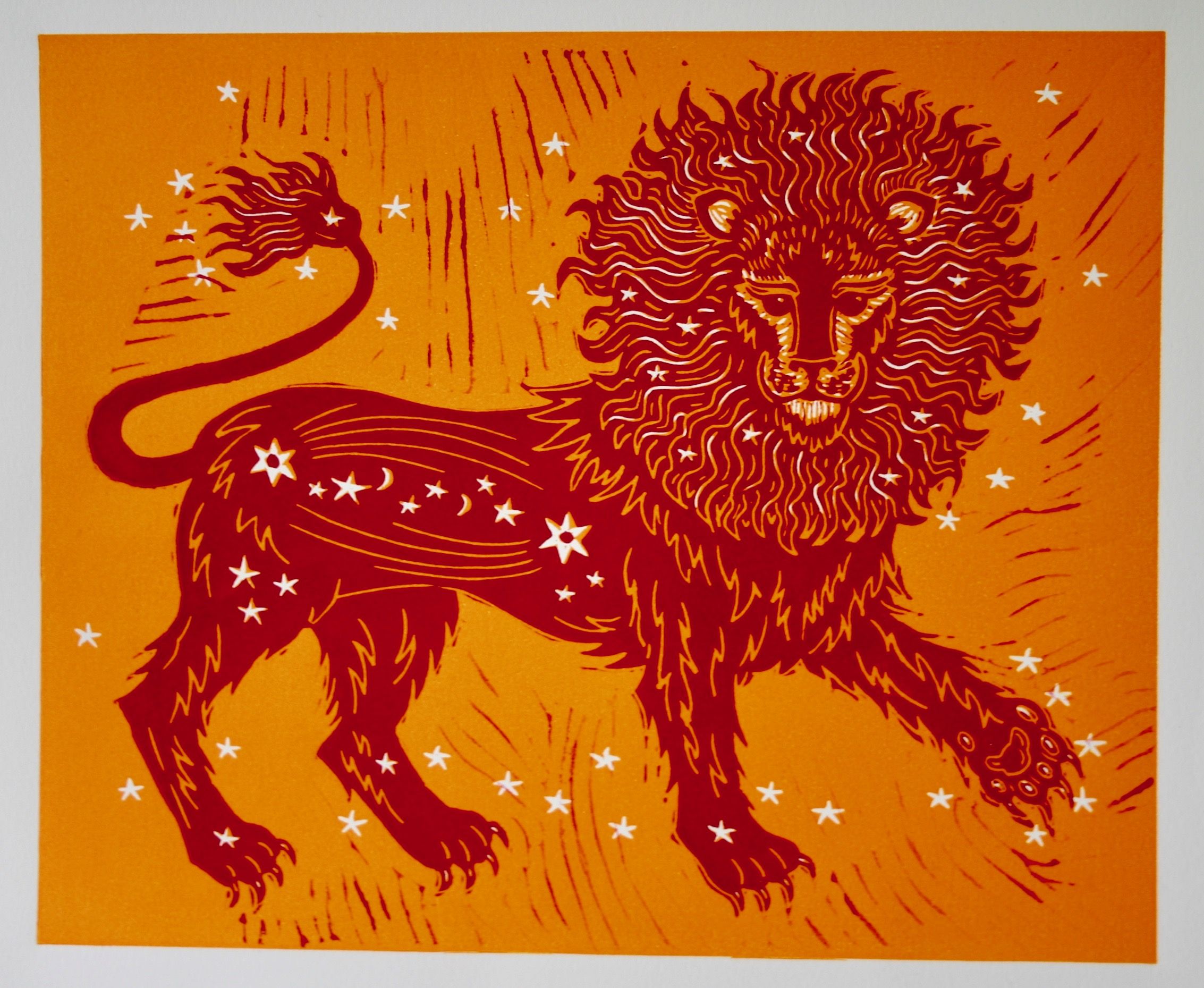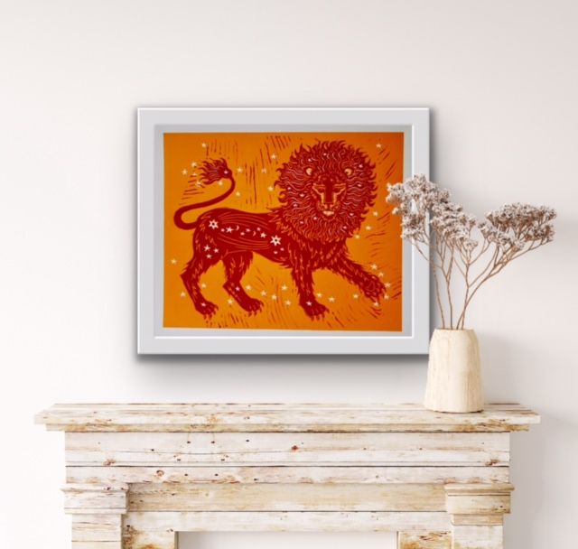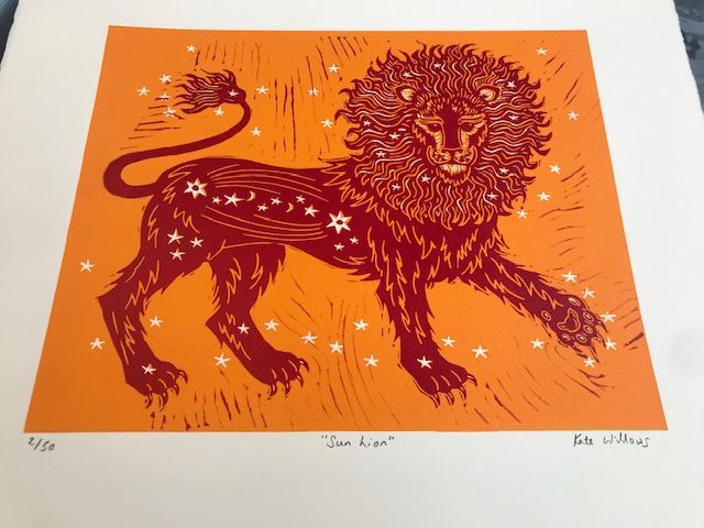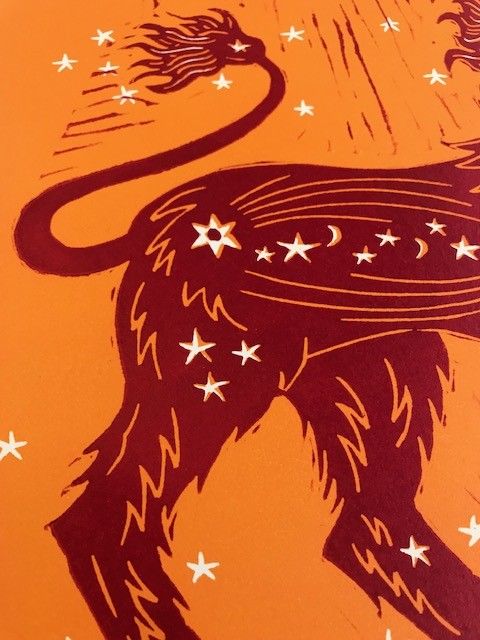 An original limited edition two-block linoprint. This print is a bright and colourful celebration of the lion and its connection to the sun. I have designed the image so that the lion's mane mimics the rays of the sun. Once I have designed the image, I transfer it to lino, which