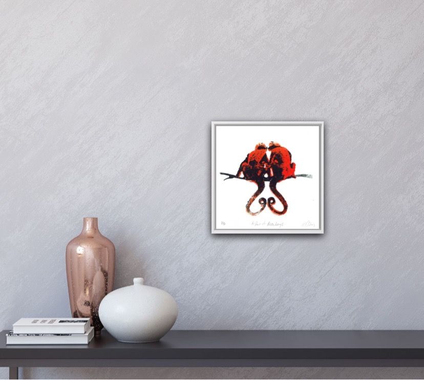 Katie Edwards A Pair of Monkeys Original Silkscreen Print Image Size: H 20cm x W 20 cm Free Shipping Please note that in situ images are purely an indication of how a piece may look. Original Silkscreen Print by Katie Edwards Colourful and fun illustration representing True Romance in the animal world. Monkeys in love with hidden love