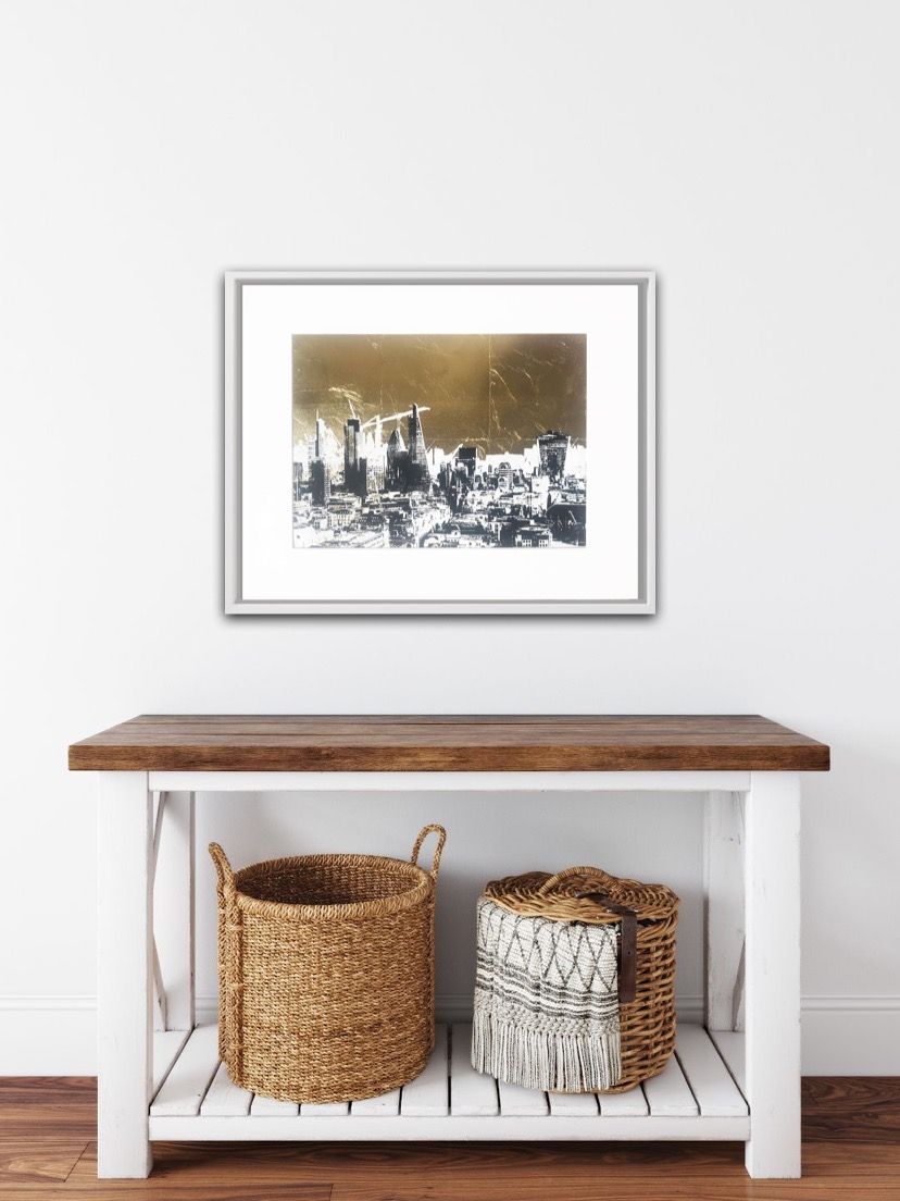 London Gold II' - Original Handmade Silk Screen Print on 24k Gold Leaf created by London artist, Katie Edwards. Sold UNFRAMED - framing ideas have been provided. (Please note that in situ images are purely an indication of how a piece may look). 'London Gold II' features the capital cities iconic buildings,