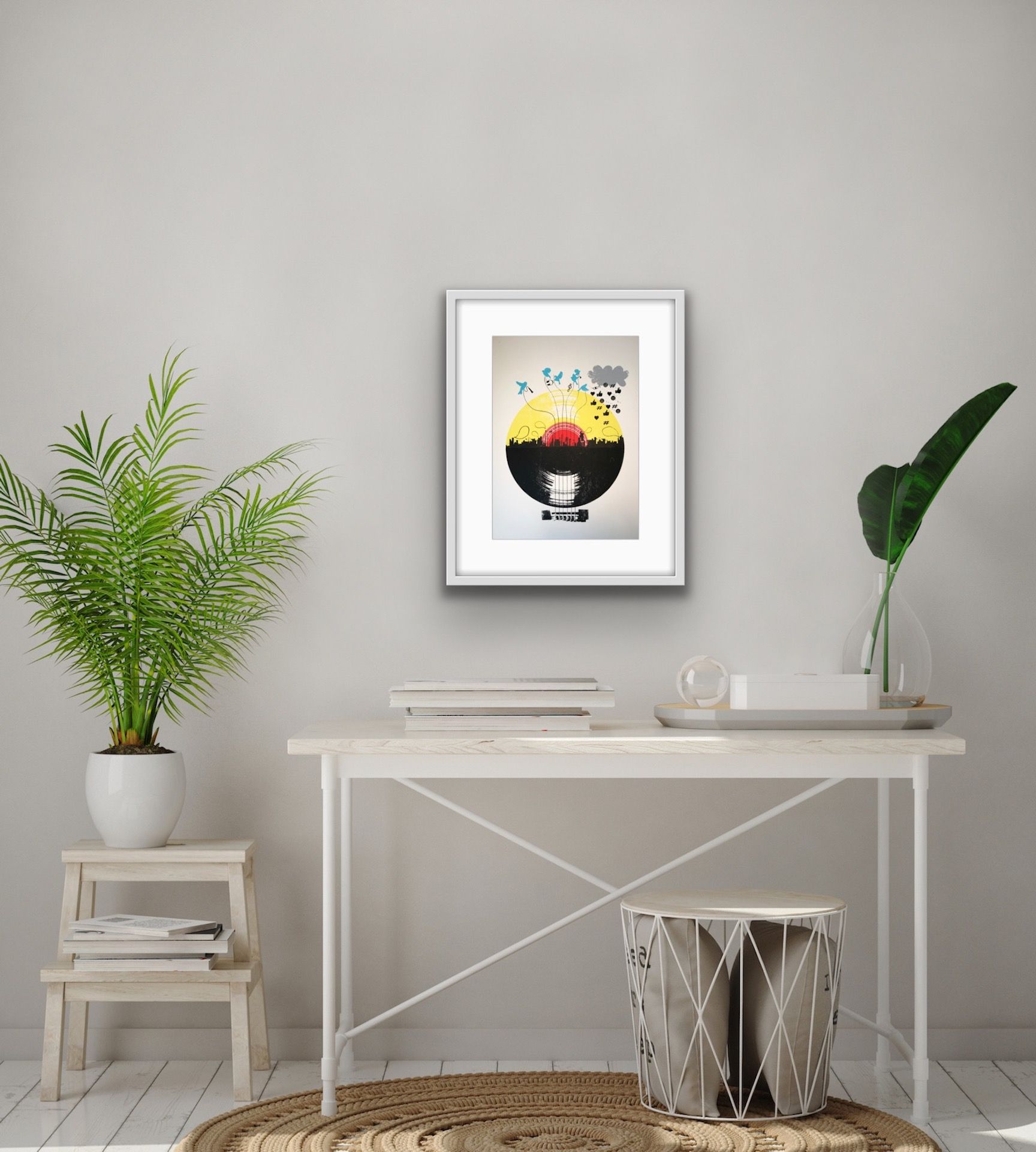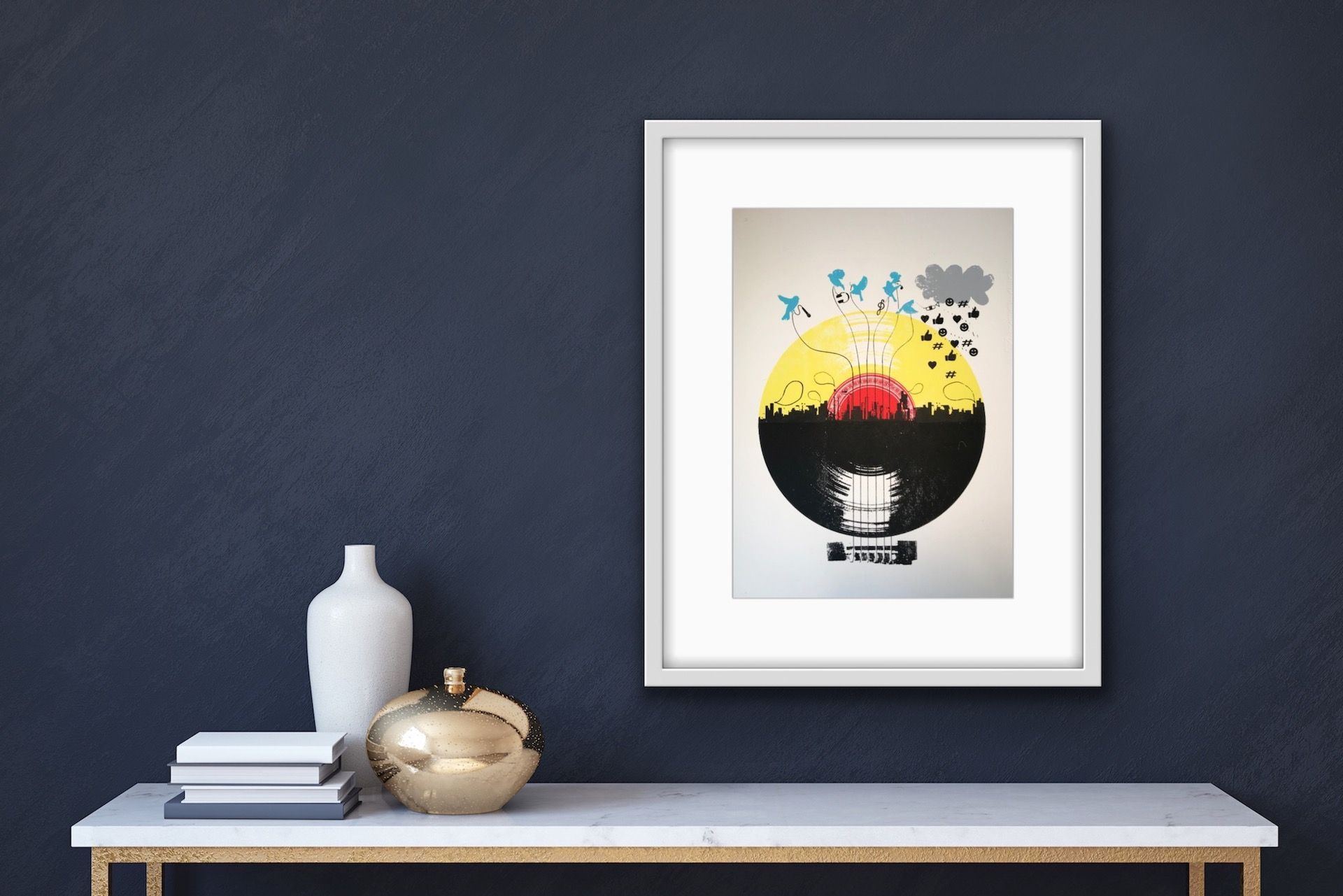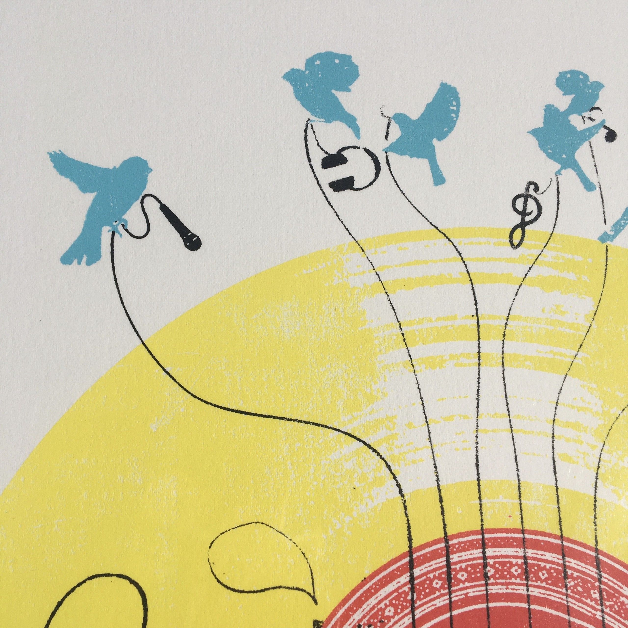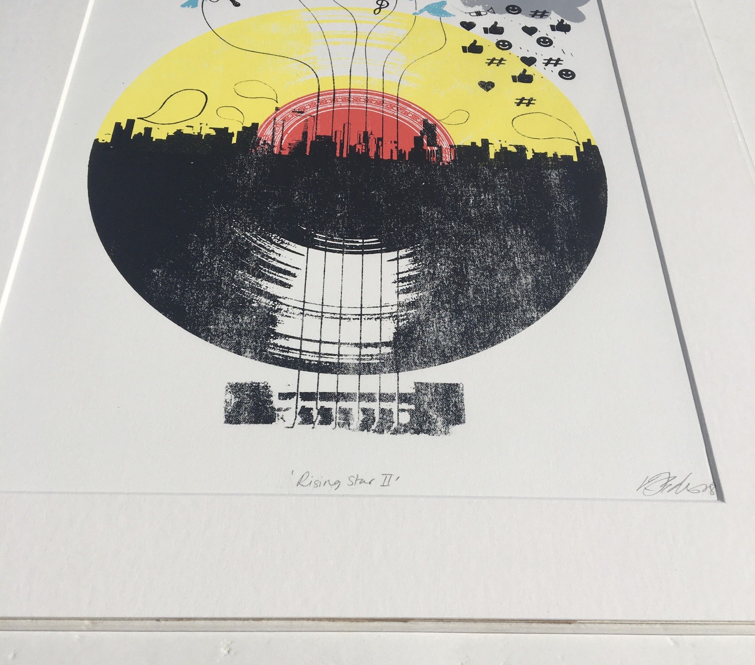Rising Star II by Katie Edwards Illustrations. 5 colour original silkscreen print on Fabriano edition of 100. Image Size - A3 - 29.7 x 42 cm. Mounted size is 40.5 cm x 50.5 cm. This screen print was commissioned by Listen Music Magazine, representing the impact social networking has rising to fame in the