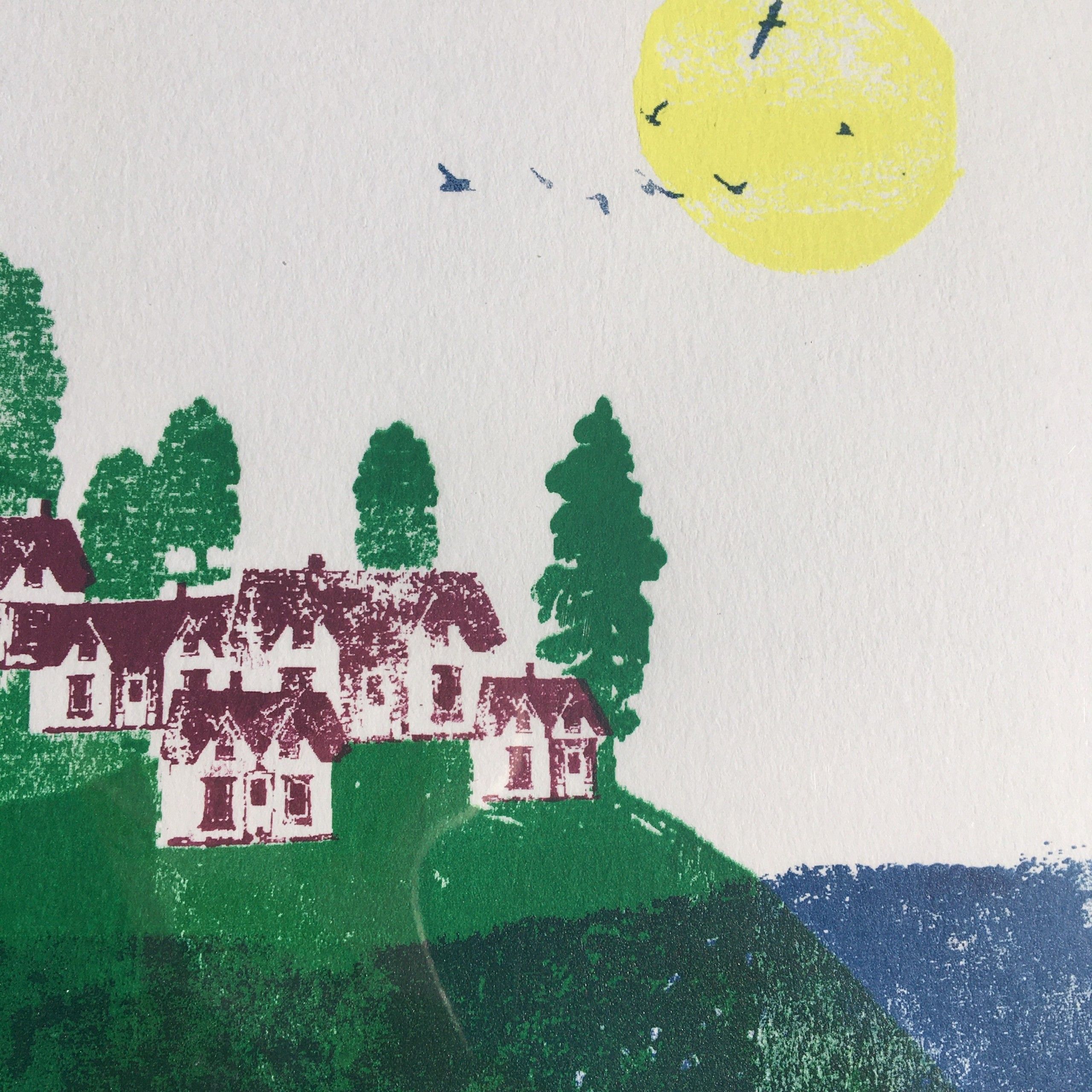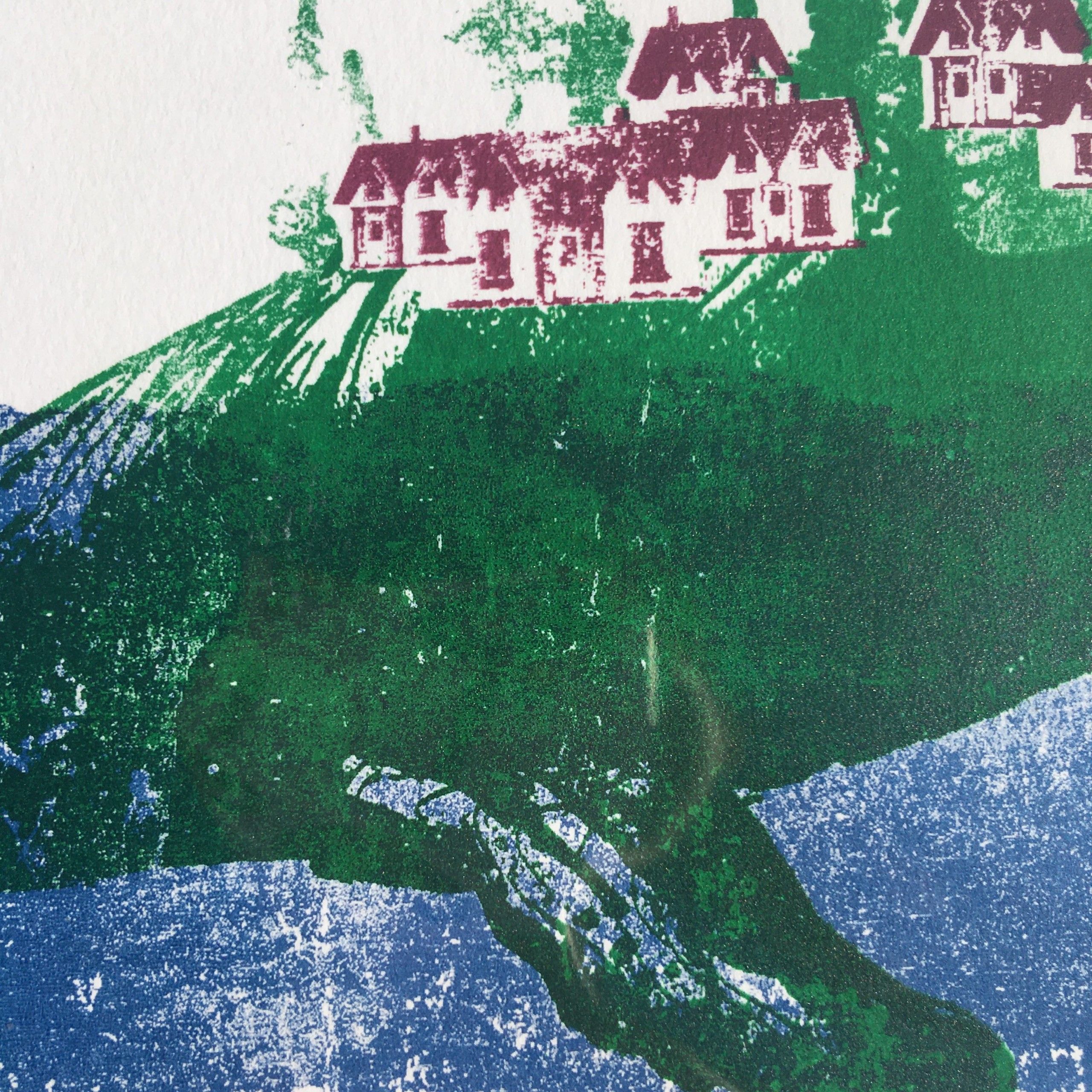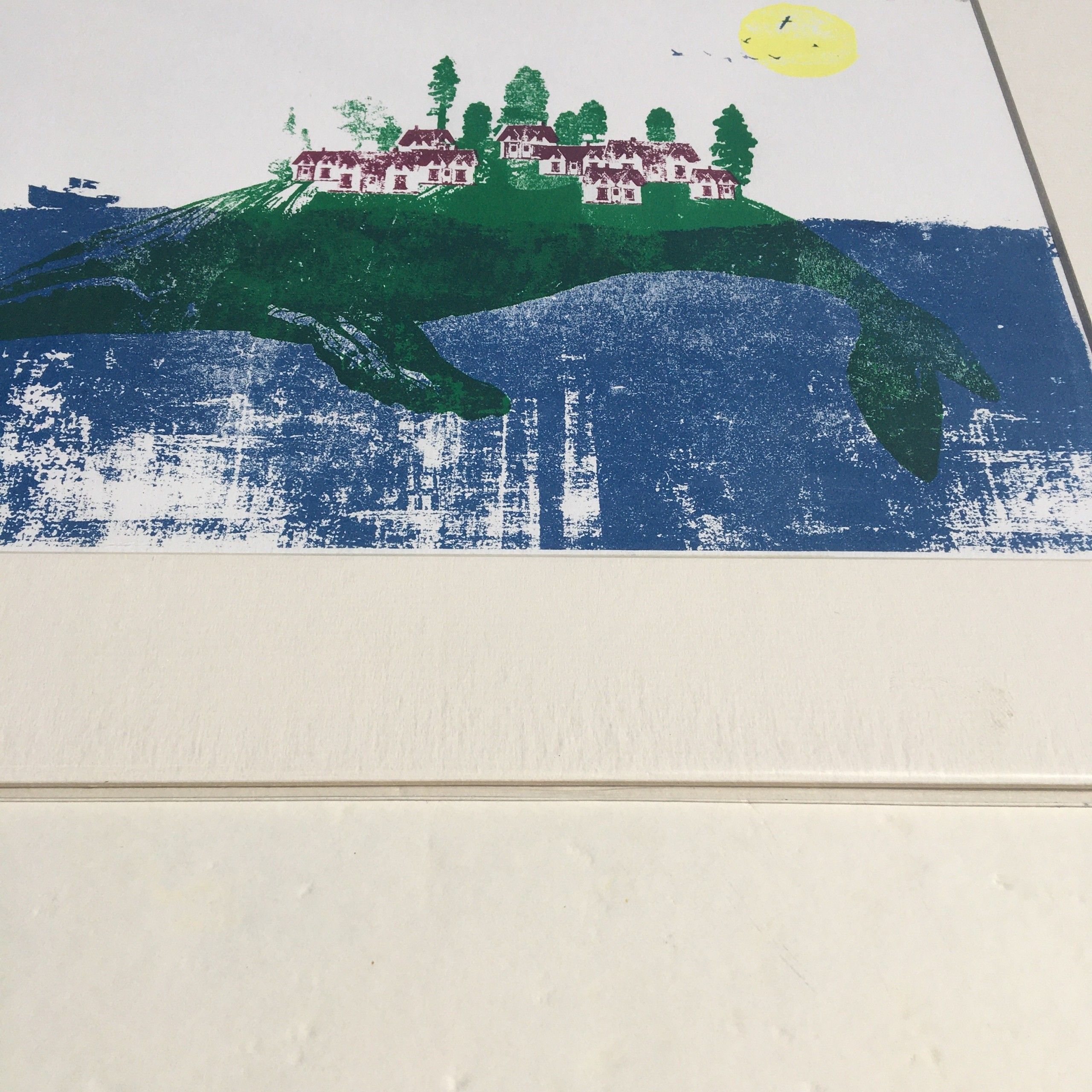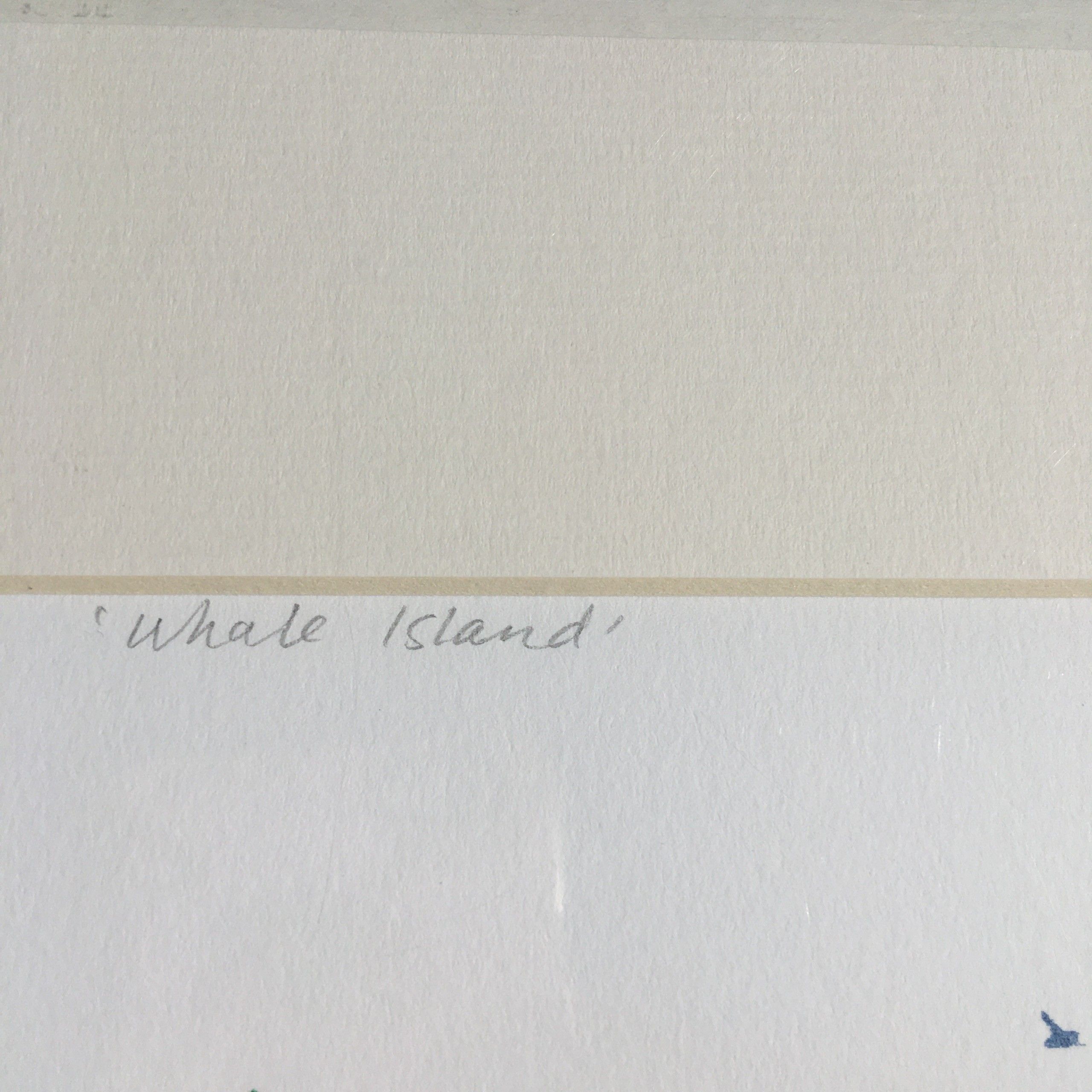 Katie Edwards. Whale Island- whale artworks- original handmade silk screen print. This work of art is a 4 colour silk screen printed onto Fabriano Ruvidi 200gsm paper. Edition of 100 and is sold unframed.