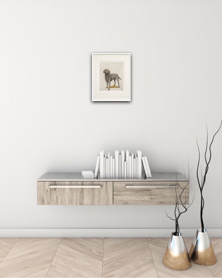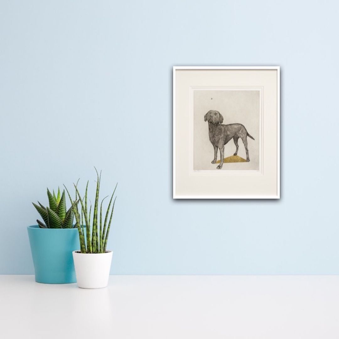 Guy Allen Labrador and Bumblebee Original Etching and Gold Leaf on Paper Image size: H35cm x W20cm Approximate size when framed: H40cm x W30cm Edition size: 75 Please note the price is for the unframed original etching. Please note that in situ images are purely an indication of how a piece may look. Labrador and Bumblebee is an