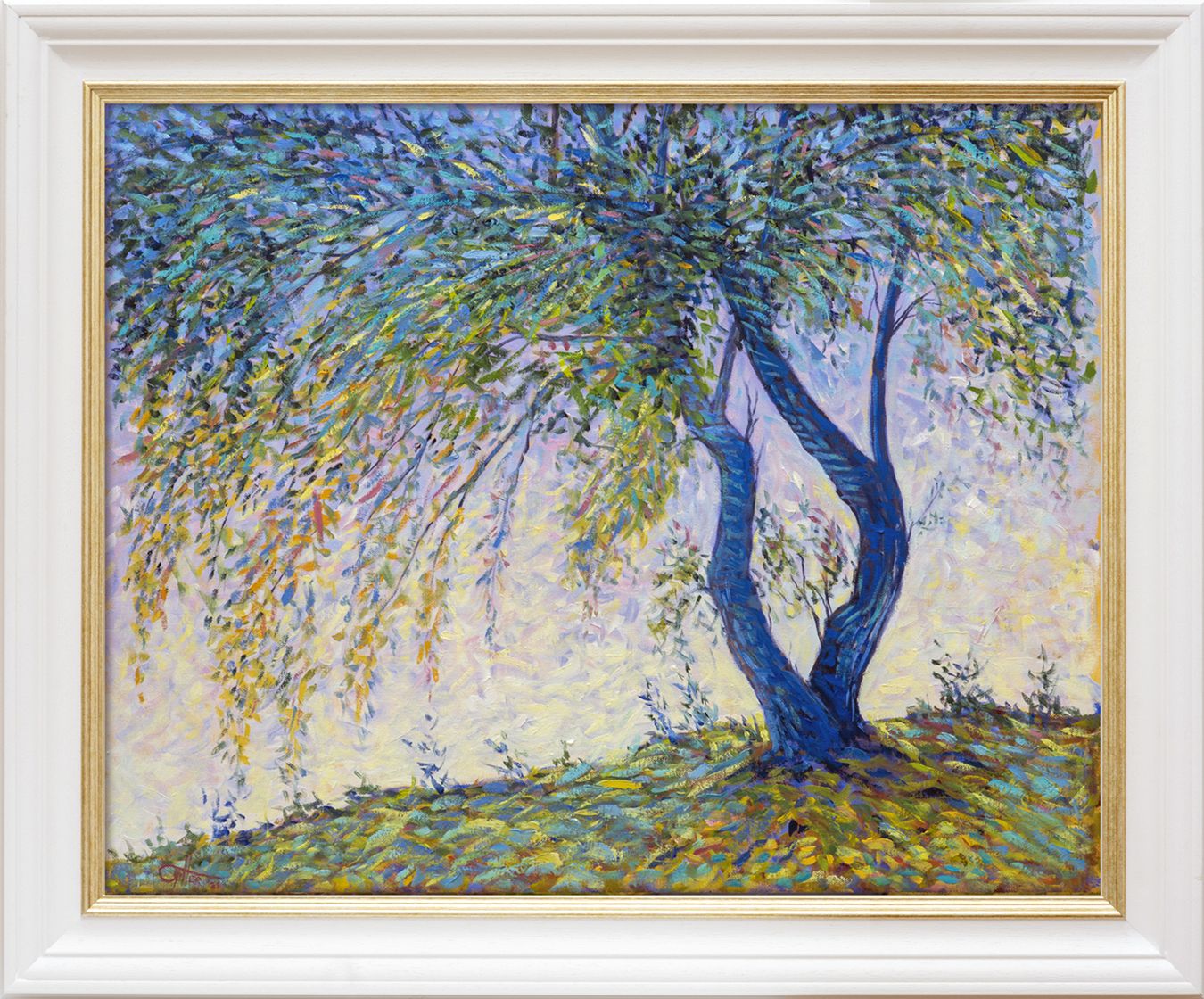 In 'Not all who weep are sad' Lee Tiller has used a vibrant and playful palette of purples, blues, greens, yellows and pinks. Lee believes that expressions of joy can be found in colour, and a sense of euphoria certainly resonates in this painting. He paints in the same tradition as