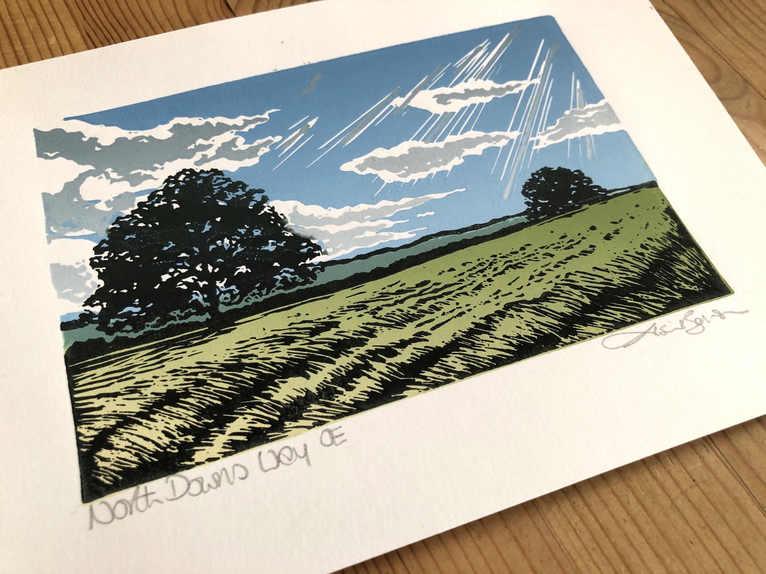 Taking a pause on a walk, the sun through the clouds, the breeze through the grass and the space stretching out in front of me. A lot to fit into what is quite a small print. This spot can be found in Shackleford, Surrey, and is part of the North