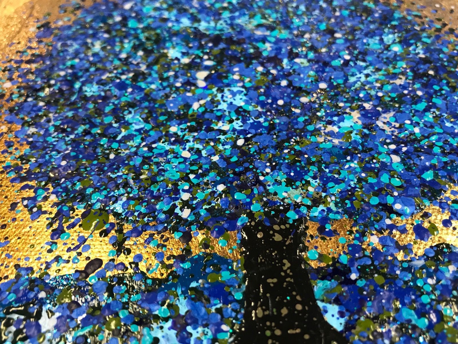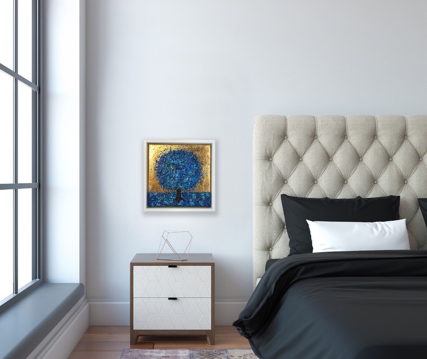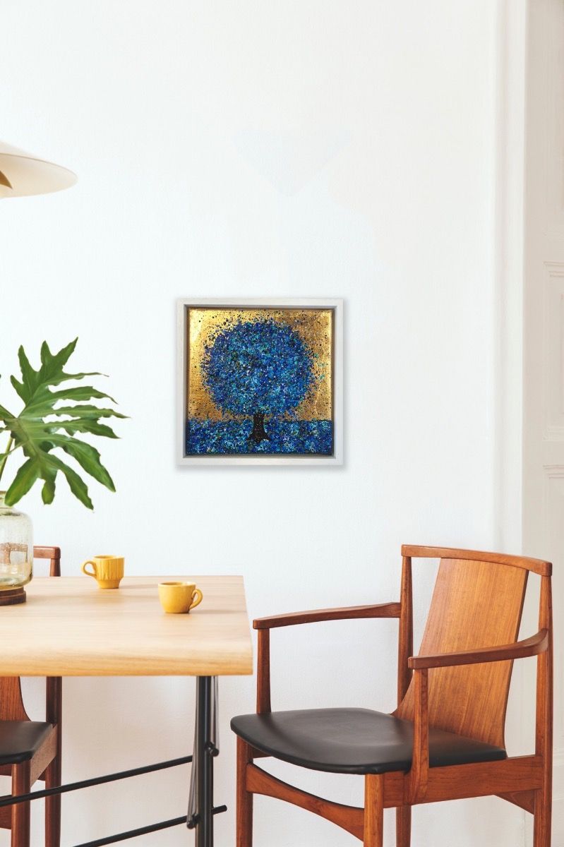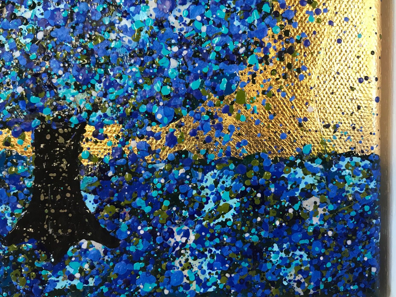 New original landscape painting by Nicky Chubb. Colourful and textured landscape painting of a tree with a gold shiny background. ADDITIONAL INFORMATION: signed and dated by artist on the back of the painting Acrylic on Canvas 23.2 H x 23.2 W x 4 D cm (9.13 x 9.13 x 1.57 in) Sold framed Image size: Height: