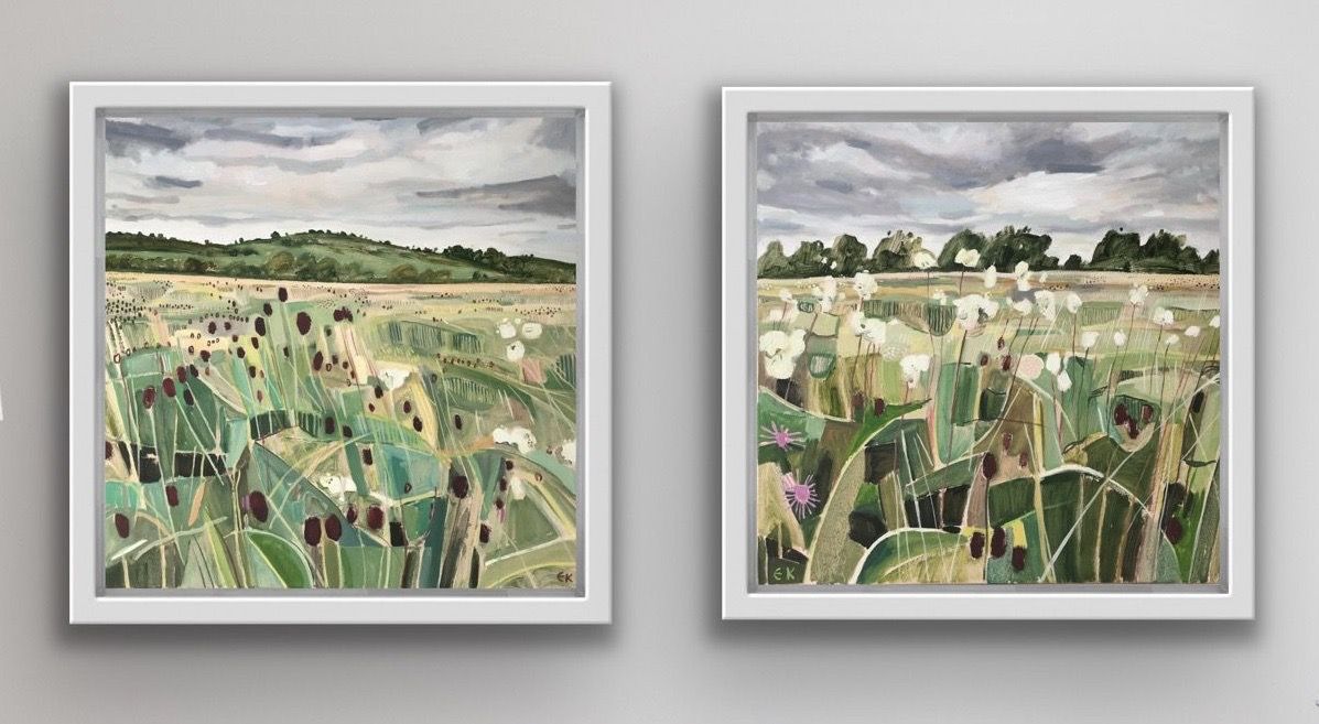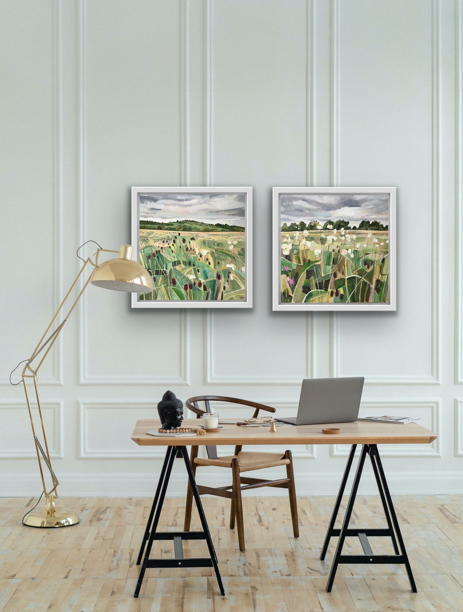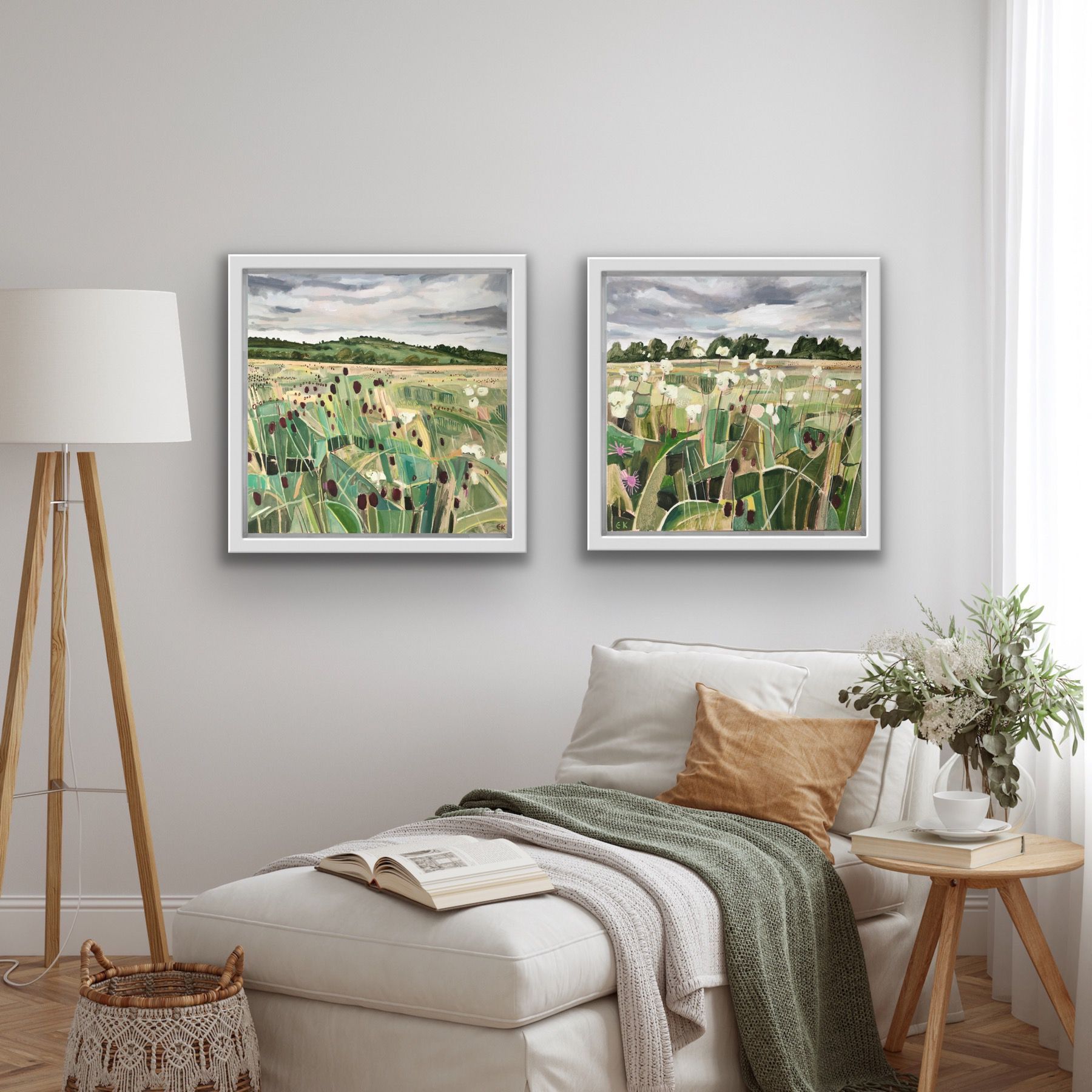 This work comprises a pair of paintings of a meadow called Long Mead, which create a diptych. Although the paintings could be available separately, they compliment one another when hung side by side, on opposite walls or within the same interior. The subject of the diptych is a floodplain meadow
