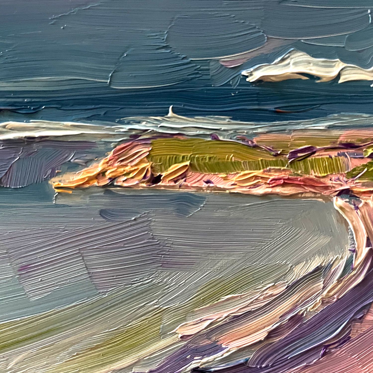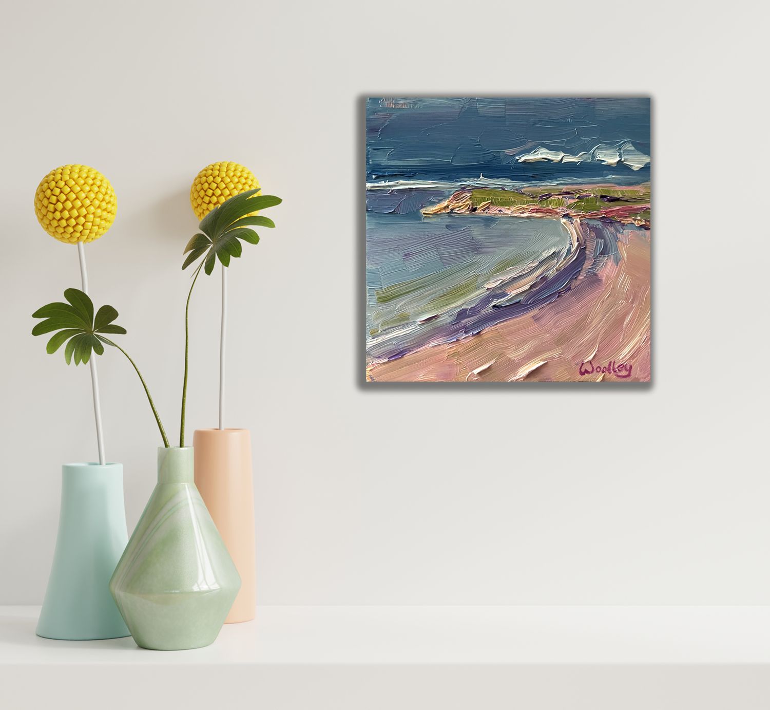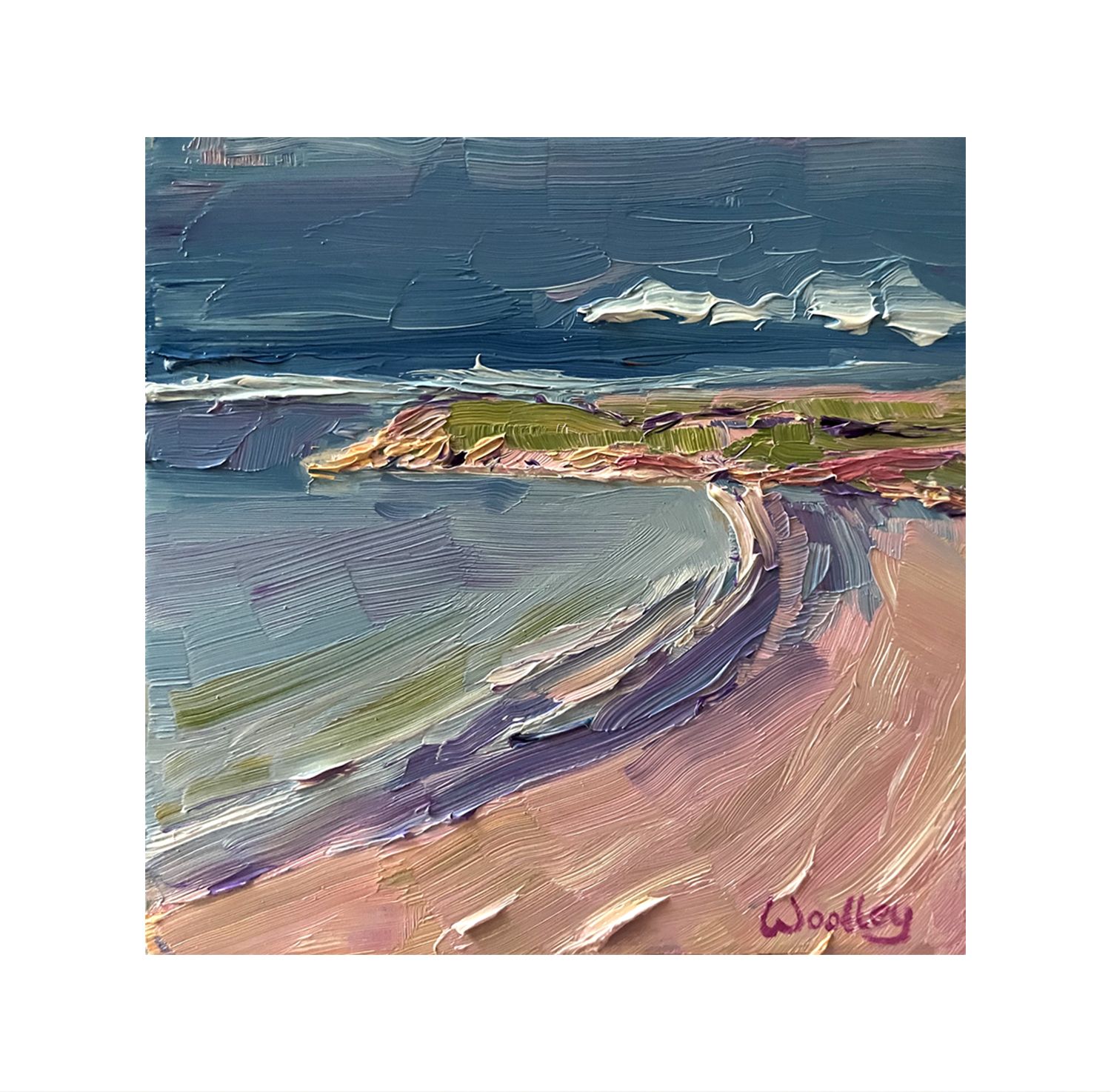 Looking down to Newport Sands depicts the beautiful peach coloured curve of the Pembrokeshire bay. The painting is painted using lovey thick and vigorous strokes which are very visible and flowing. The arc of the coastline bring our eye into the middle of the painting where the jutting