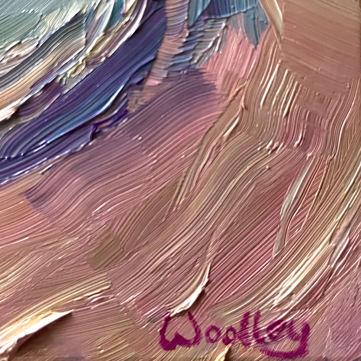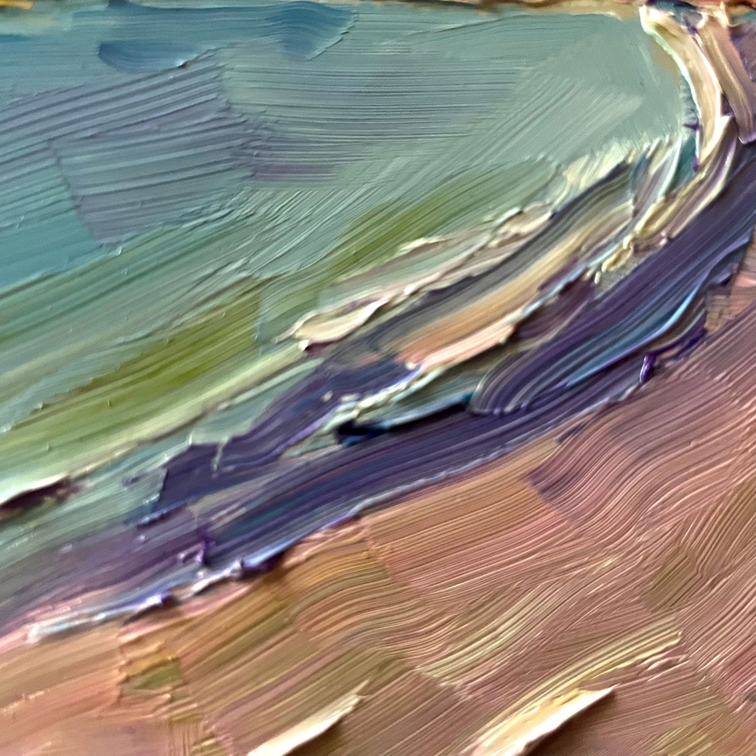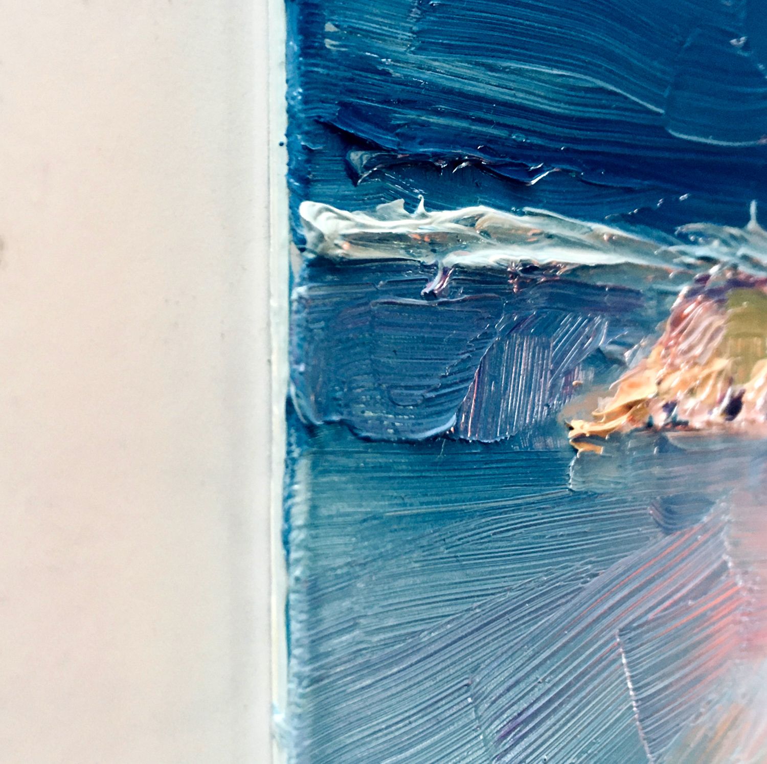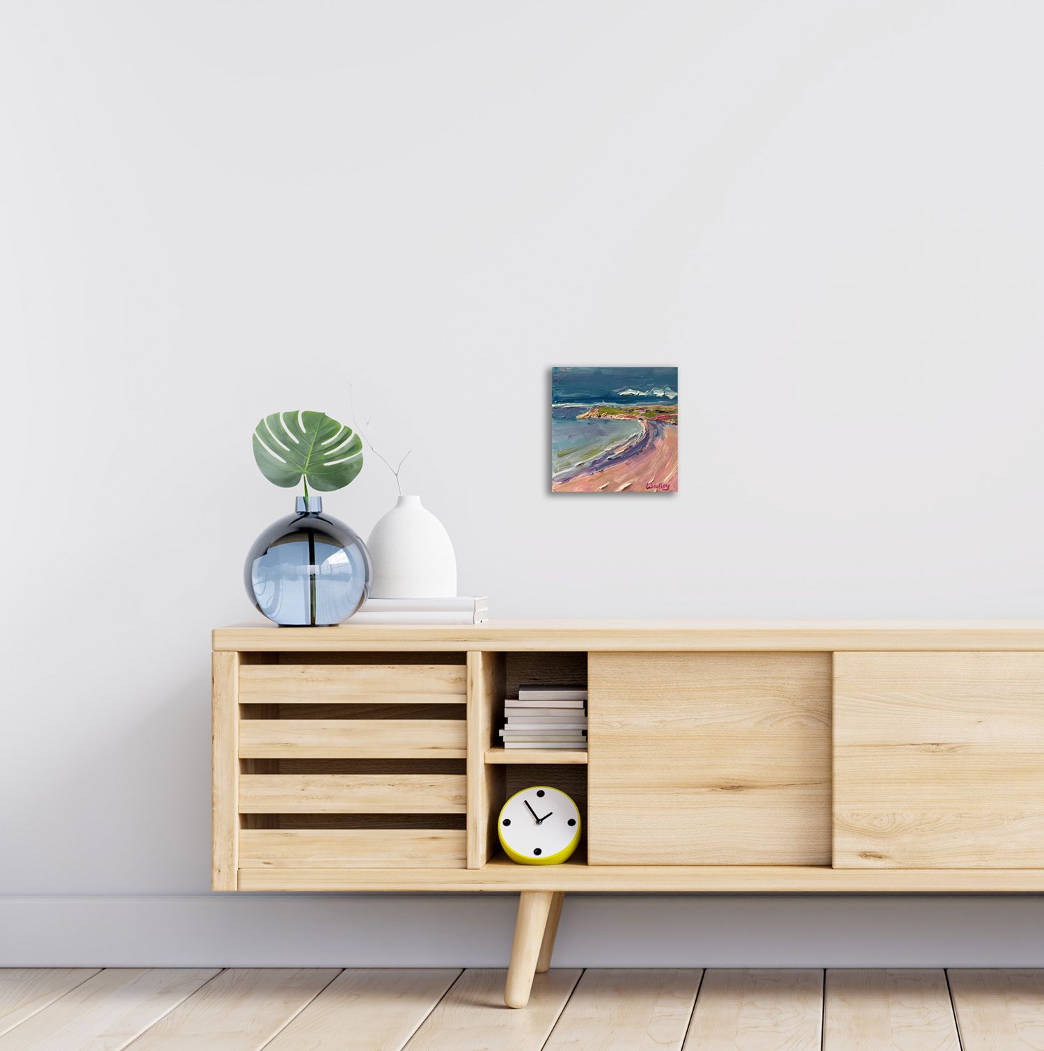 Looking down to Newport Sands depicts the beautiful peach coloured curve of the Pembrokeshire bay. The painting is painted using lovey thick and vigorous strokes which are very visible and flowing. The arc of the coastline bring our eye into the middle of the painting where the jutting
