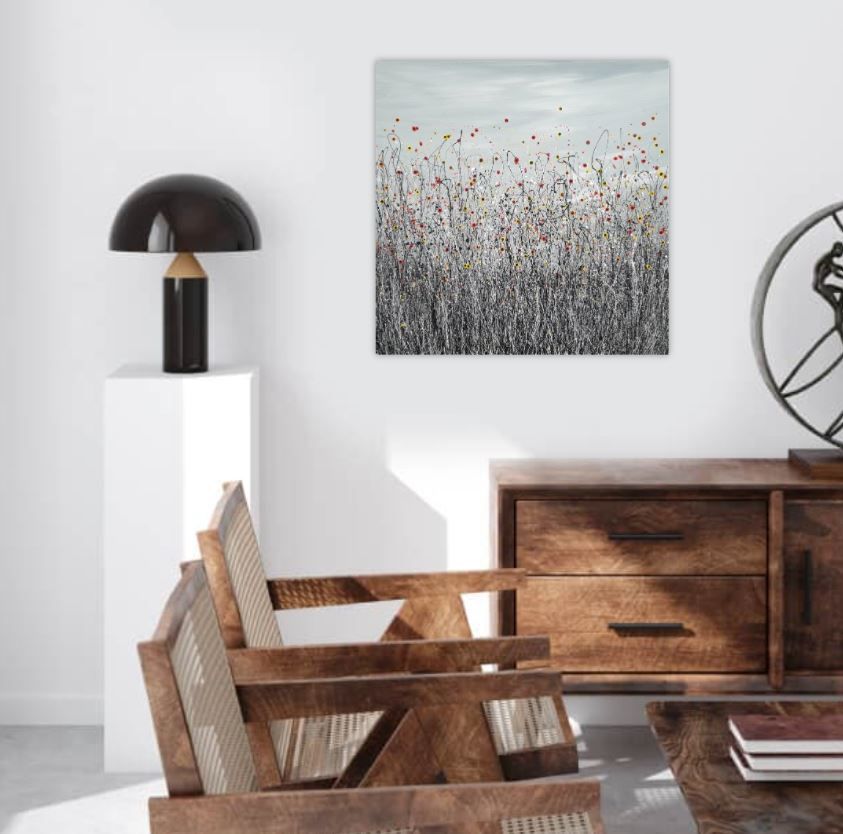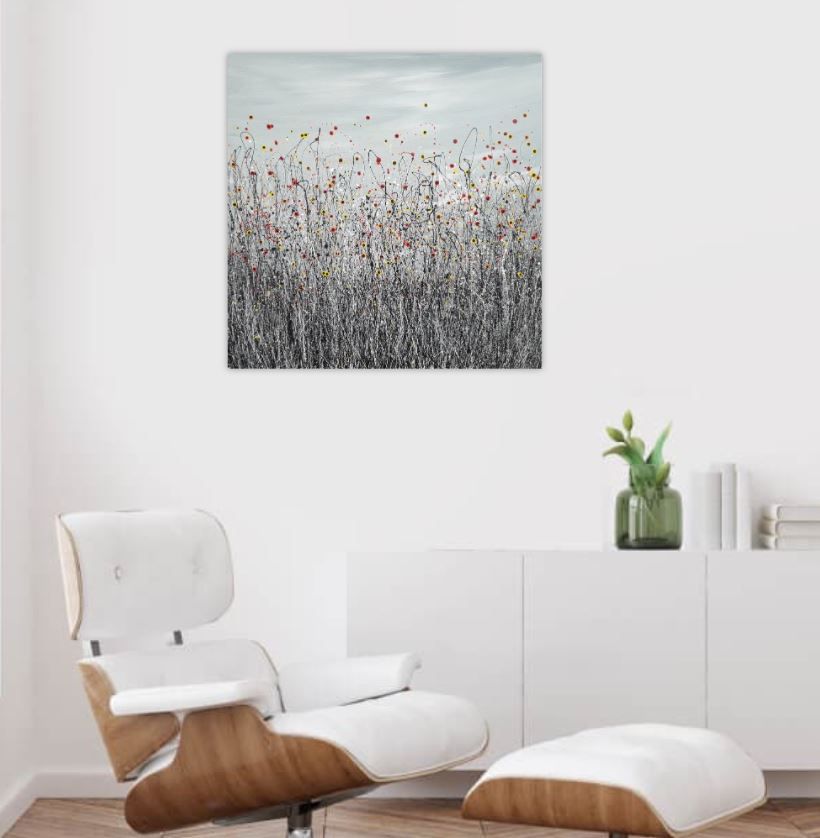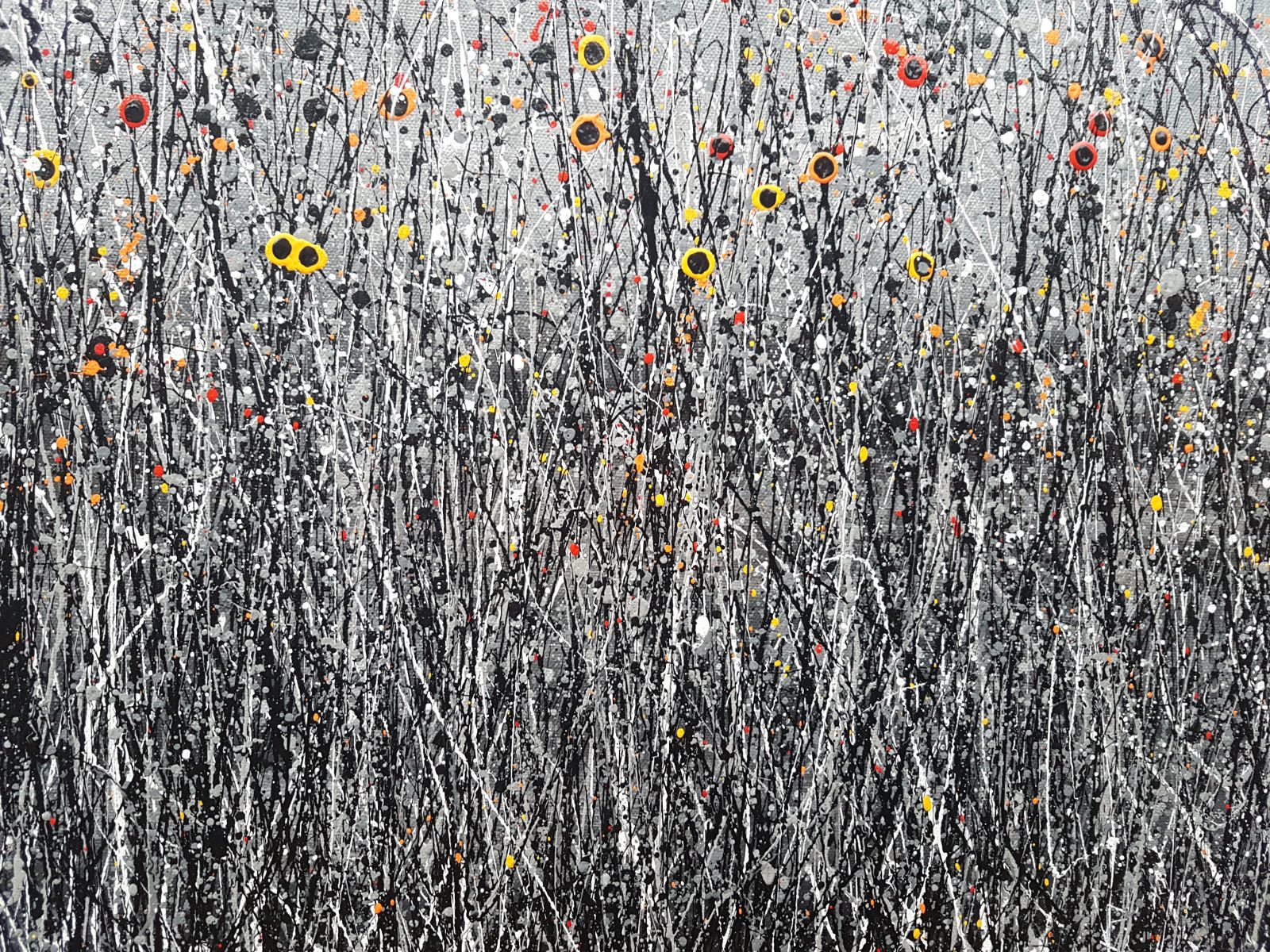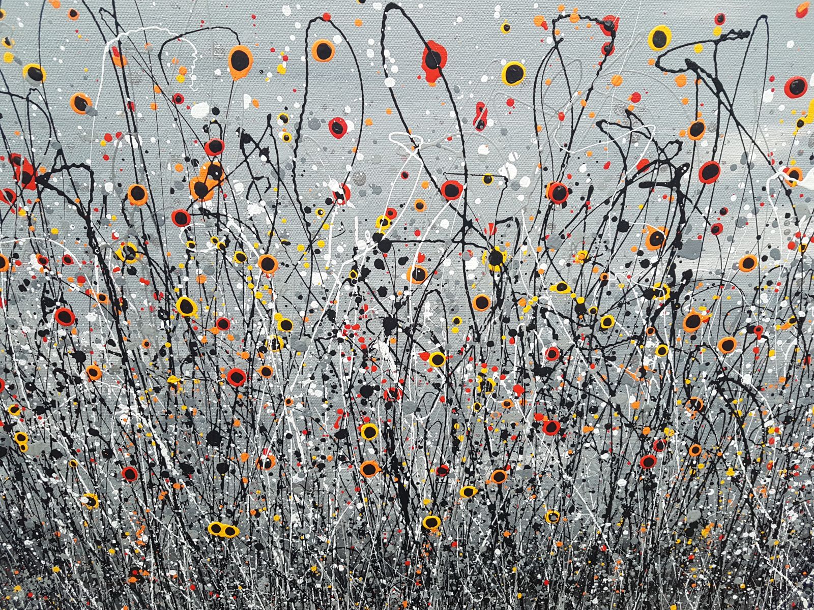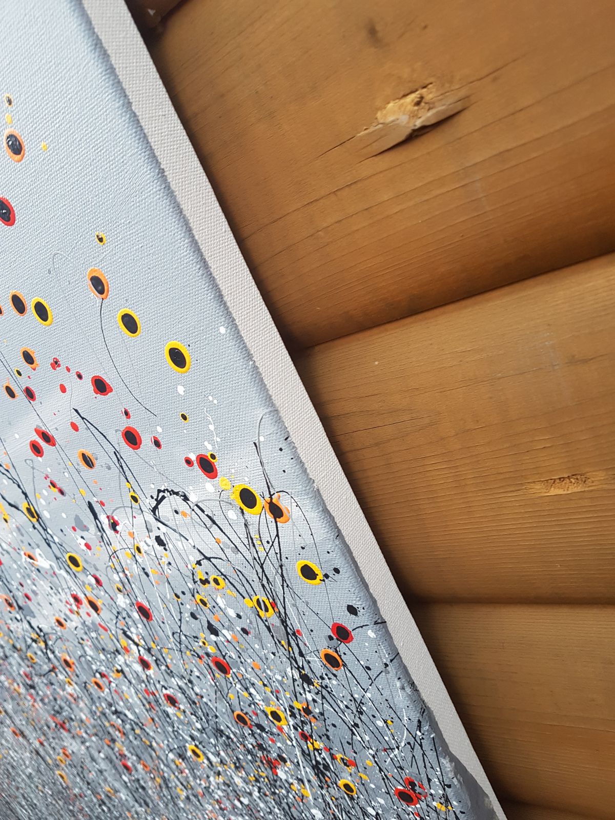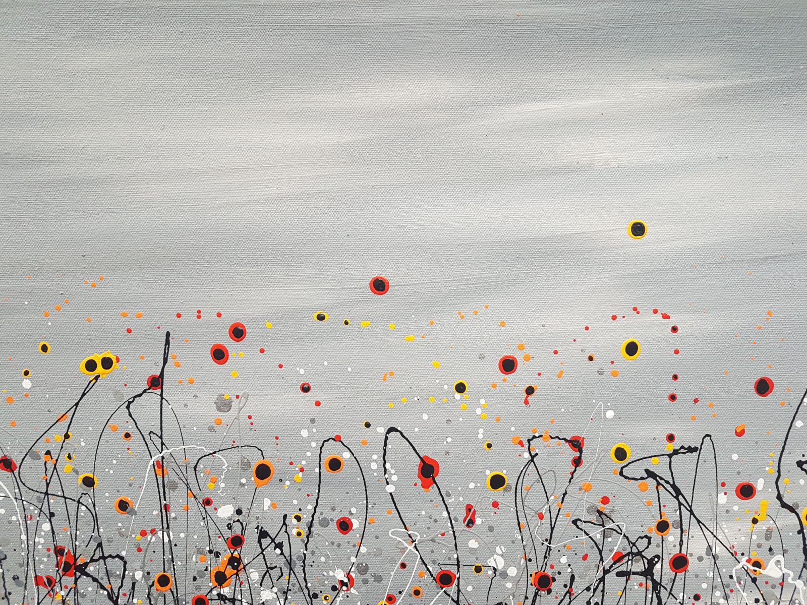 Awakening #3 - An Original semi-abstract painting by Lucy Moore I really like the contrast of the monochrome back ground against the vibrant pops of red, yellow and Orange . Awakening #3 is part of my monochrome colour pop series. I love painting abstract landscapes, using my techniques to put