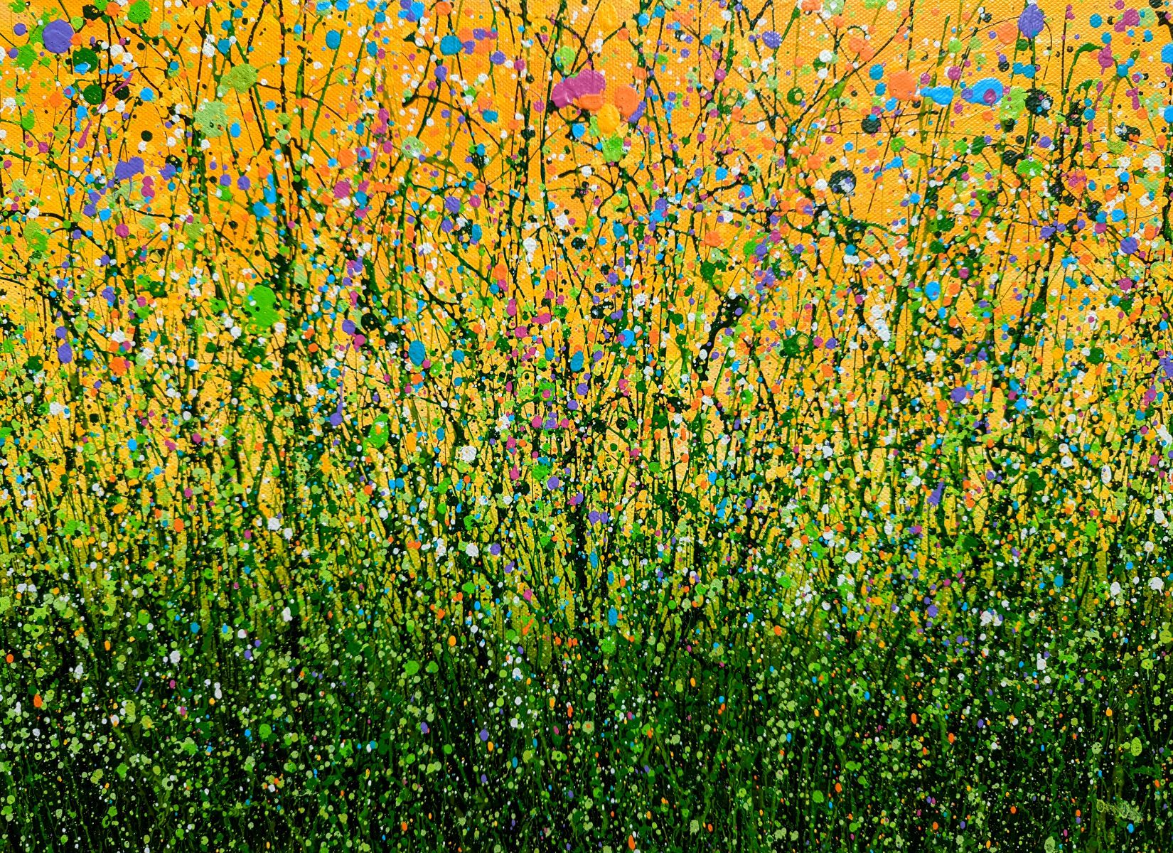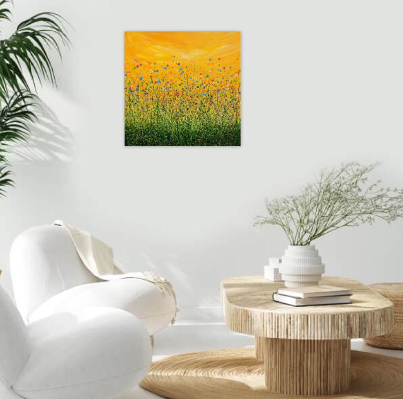 Dreams Gone By #2 - A whimsical meadow bursting with Sunshine. An Original semi-abstract painting by Lucy Moore. Using her signature string grass technique Lucy has created a semi-abstract twist to her classic meadow paintings. Colourful yellow flowers beneath a sunlit skyline. This piece would brighten any home or office,