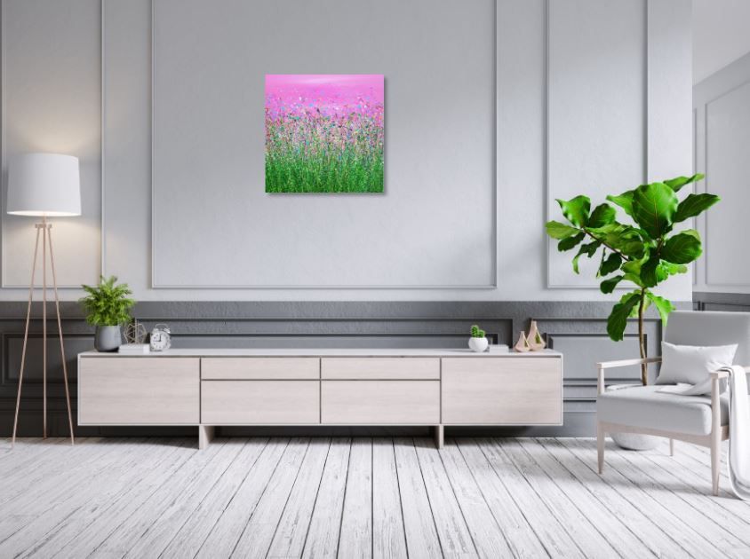 Flamingo Sky Meadows #4 - An Original semi-abstract painting by Lucy Moore. Using my signature stringy grass technique I have created a bountiful vibrant meadow. I used pinks and purples for this fantasy inspired meadow. " Wychwood Art comments " We love Lucy Moore's original meadow paintings. They are full