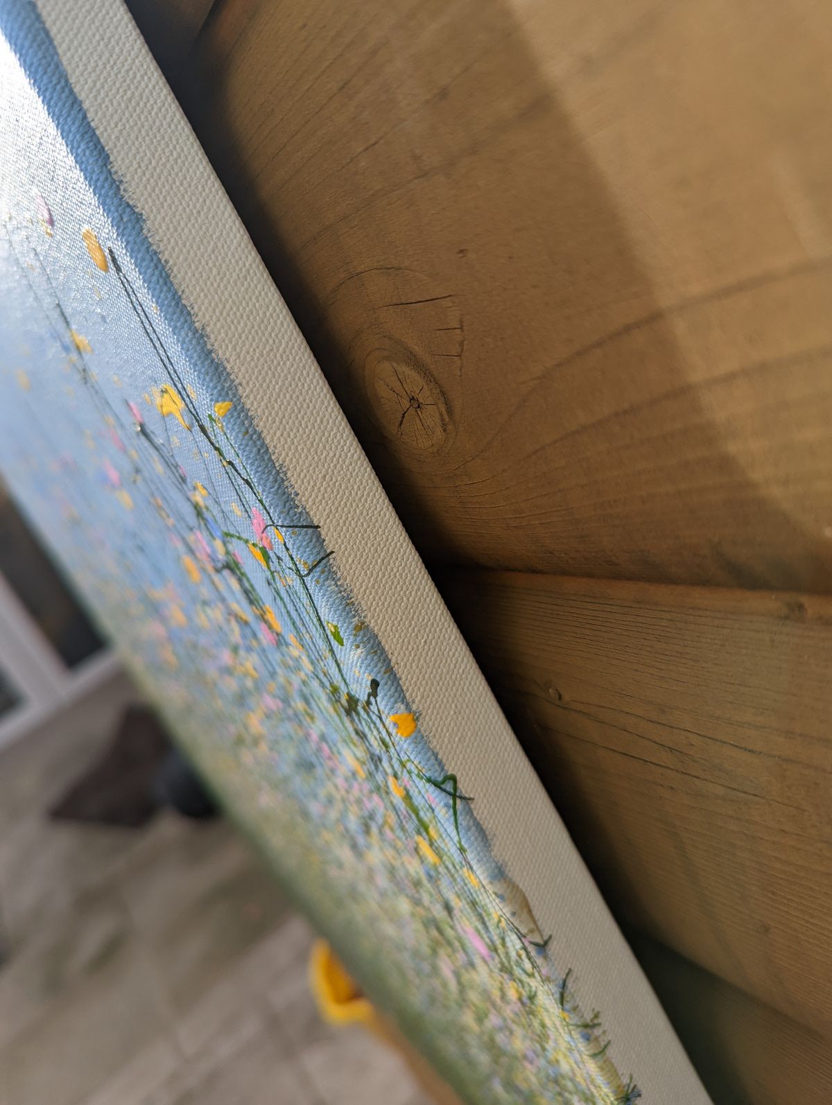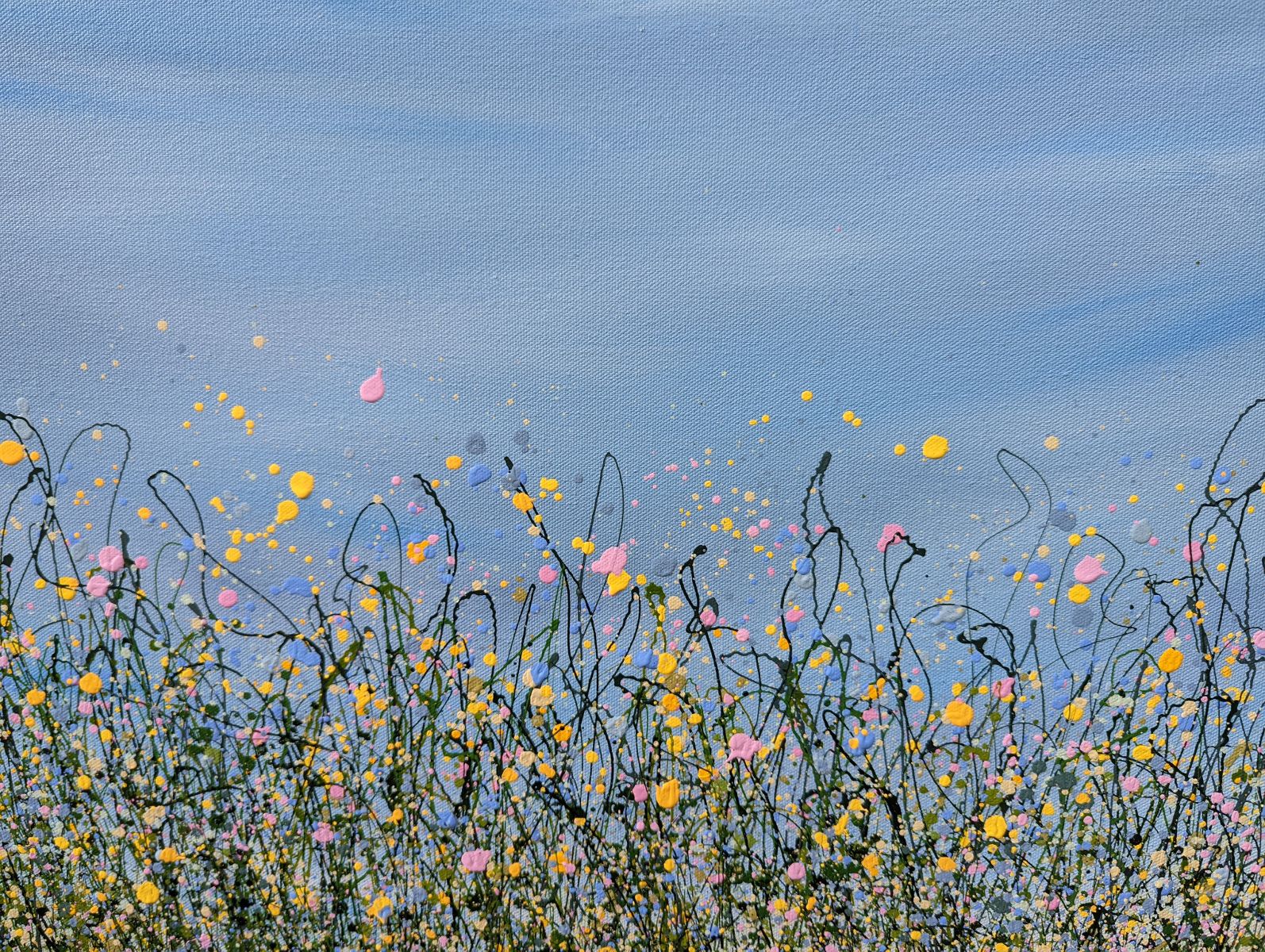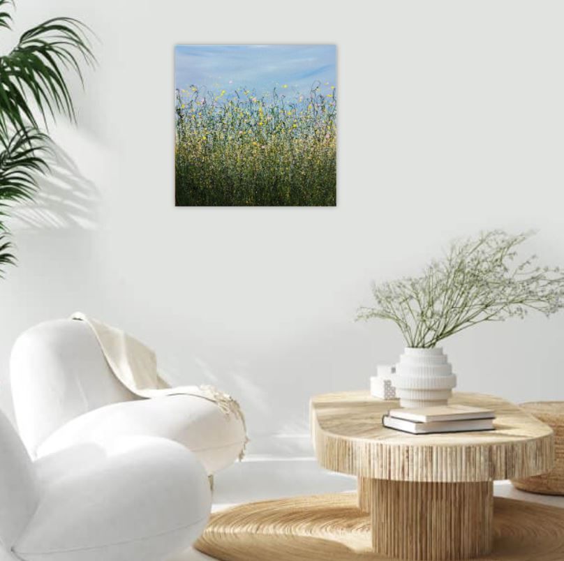 Muted Spring Meadow - An Original semi-abstract painting by Lucy Moore. Using her signature string grass technique and a muted palette Lucy has created a semi-abstract twist to her classic meadow paintings, This piece would brighten any home or office, bring a little of the outside inside. We love Lucy