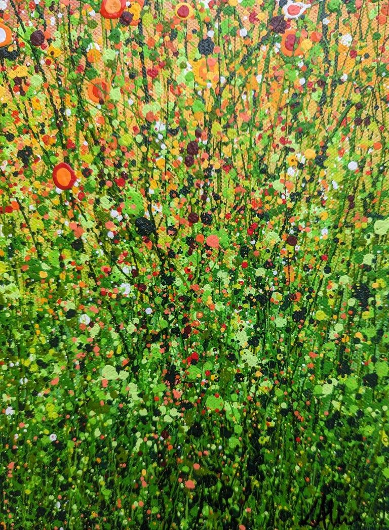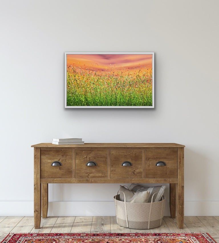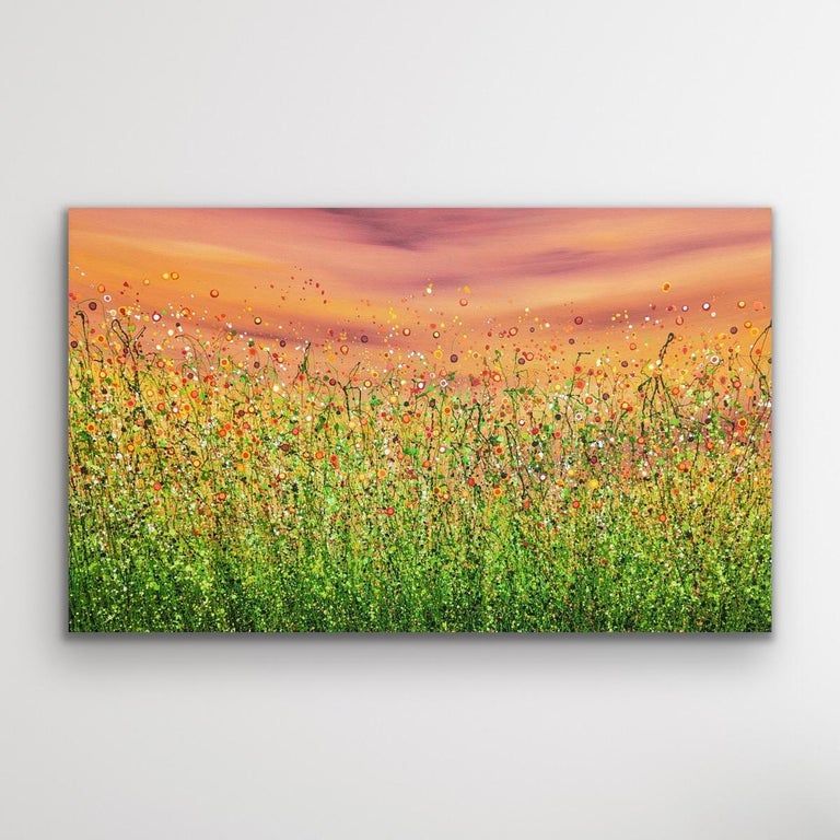 Popping Sunrise Meadows - A whimsical meadow bursting with Sunshine. An Original semi-abstract painting by Lucy Moore. Using her signature string grass technique Lucy has created a semi-abstract twist to her classic meadow paintings. Colourful yellow flowers beneath a sunlit skyline. This piece would brighten any home or office, bring