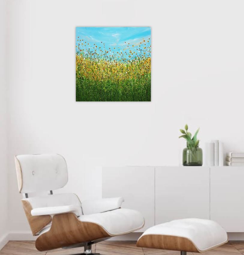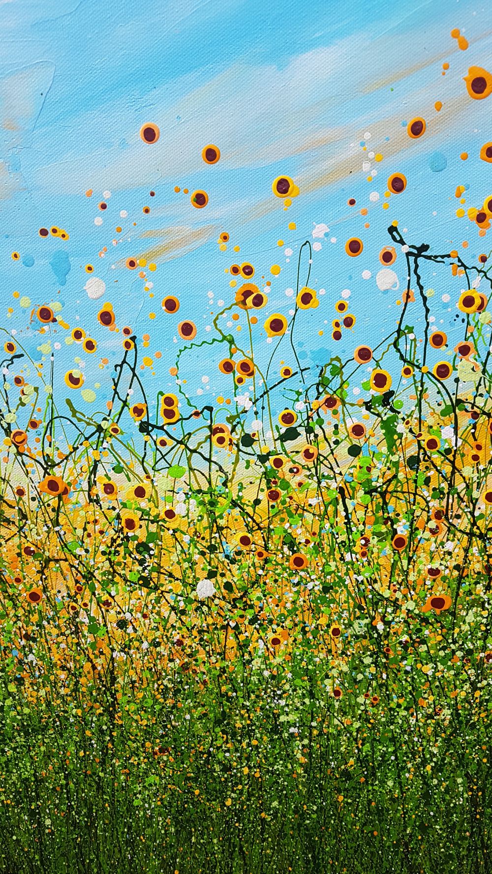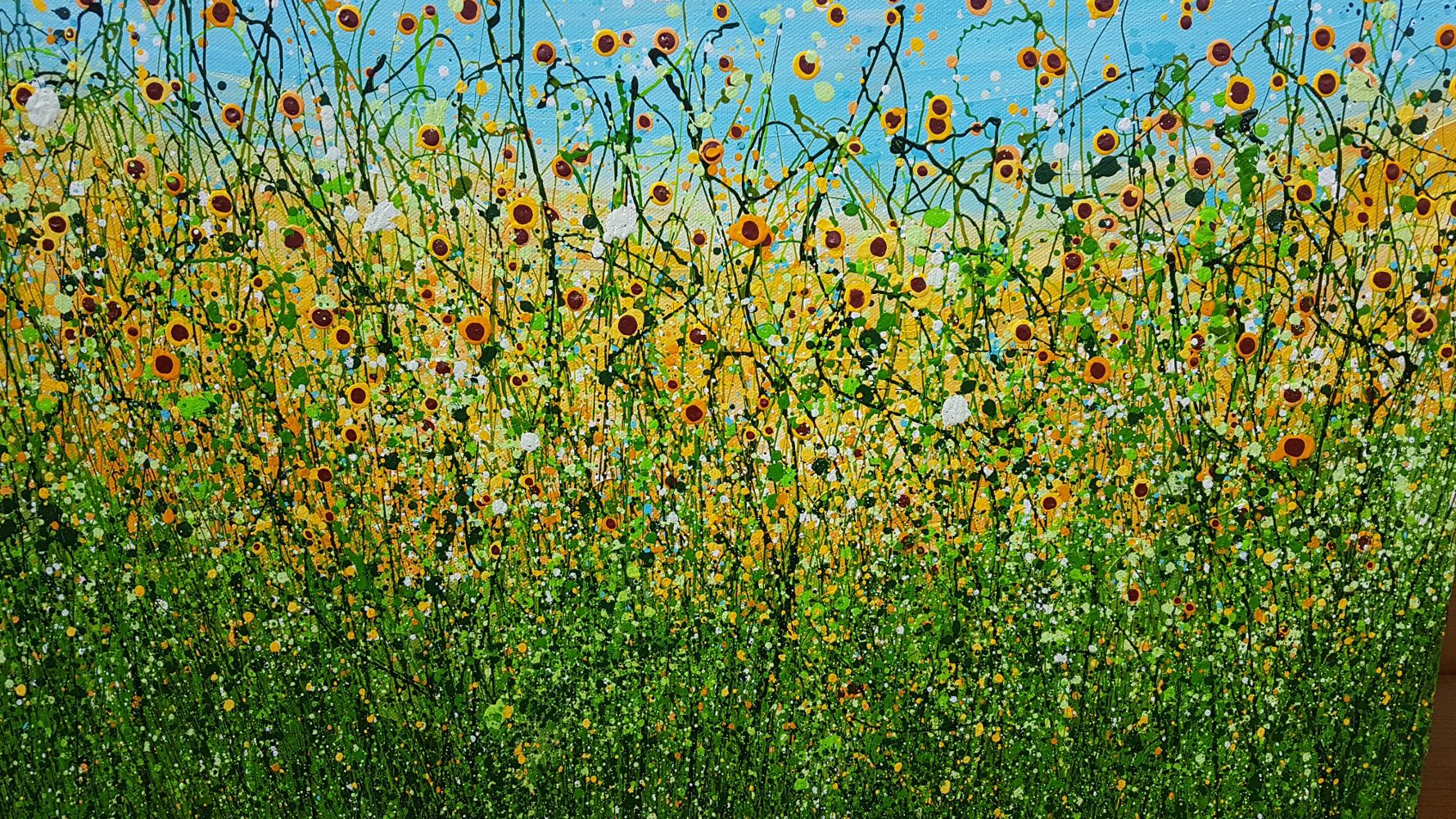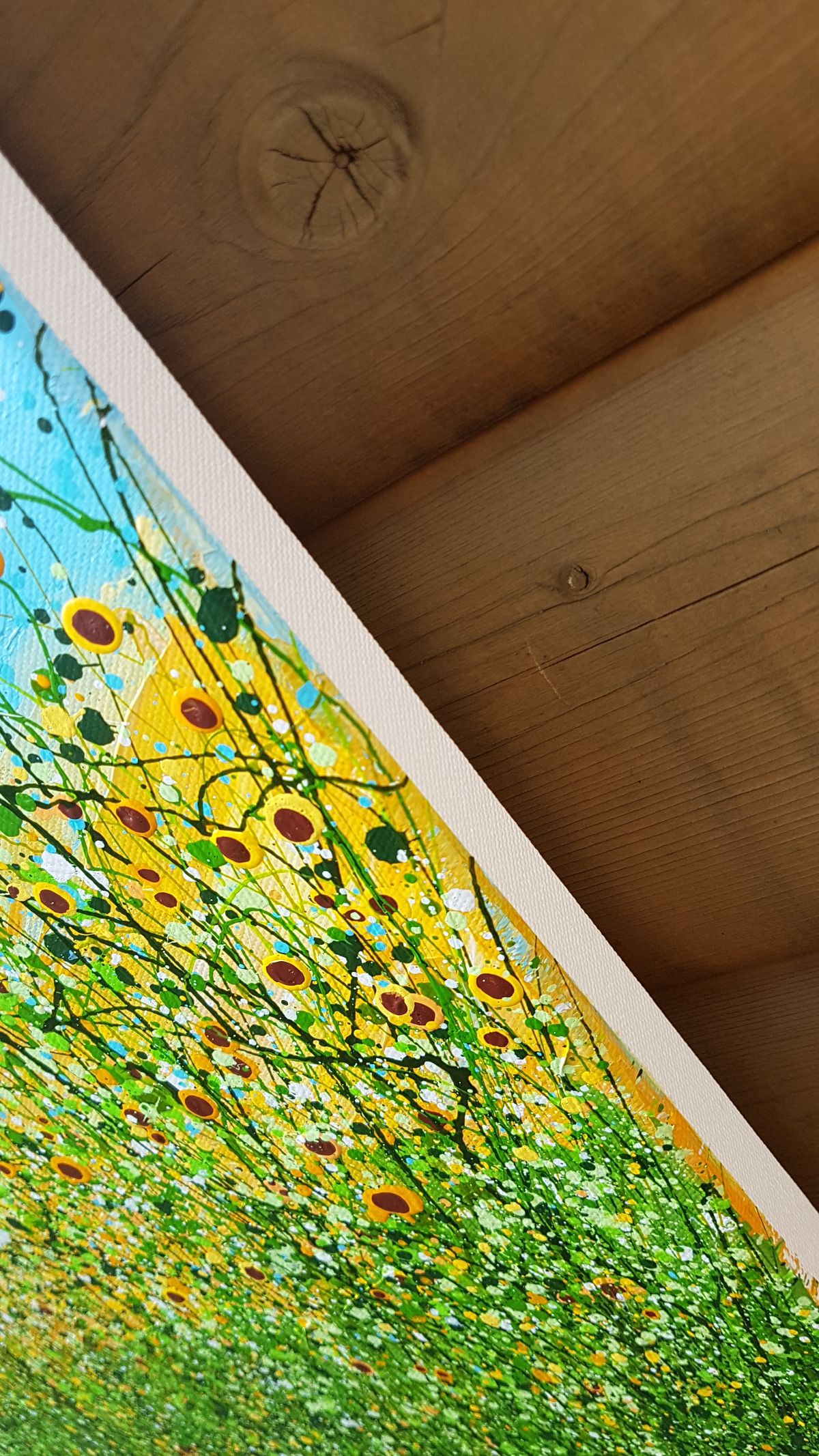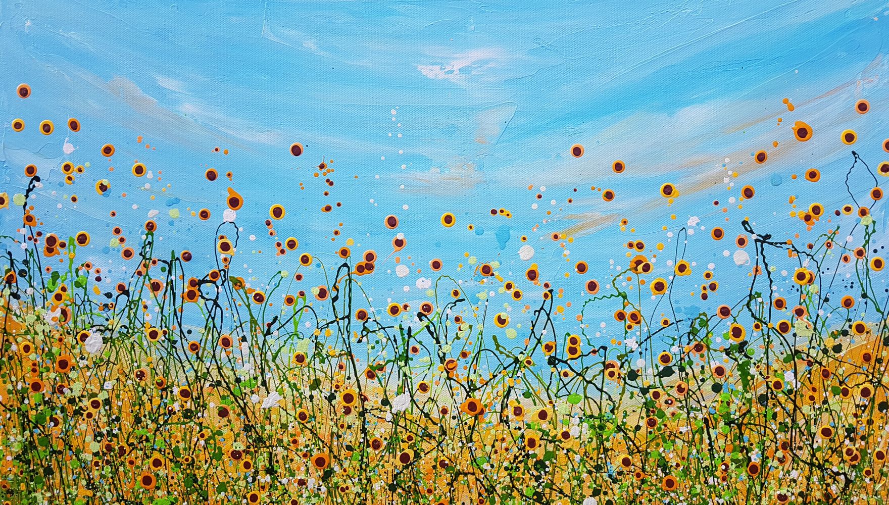 Sunshine Meadow - An Original semi-abstract painting by Lucy Moore. Using her signature string grass technique Lucy has created a semi-abstract twist to her classic meadow paintings. Lose yourself in this vibrant Sunflower meadow. This piece would brighten any home or office, bring a little of the outside inside. We