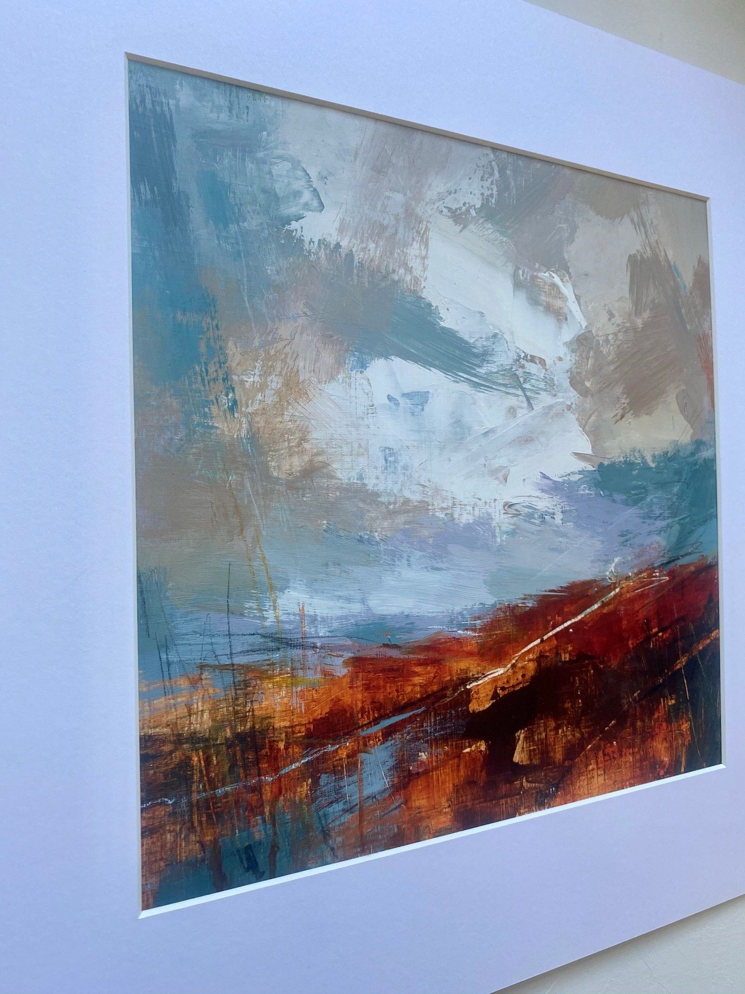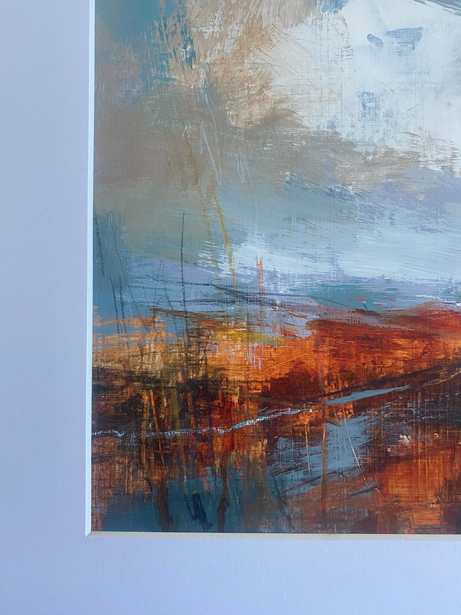 Abstracted Autumn Moor painting with rich earthy reds and dramatic sweeping sky with blue and umber tones. The painting was executed with a large palette knife and brushes and wet paint was scored through to create linear marks. Mixed media such as charcoal and oil pastel was added here and