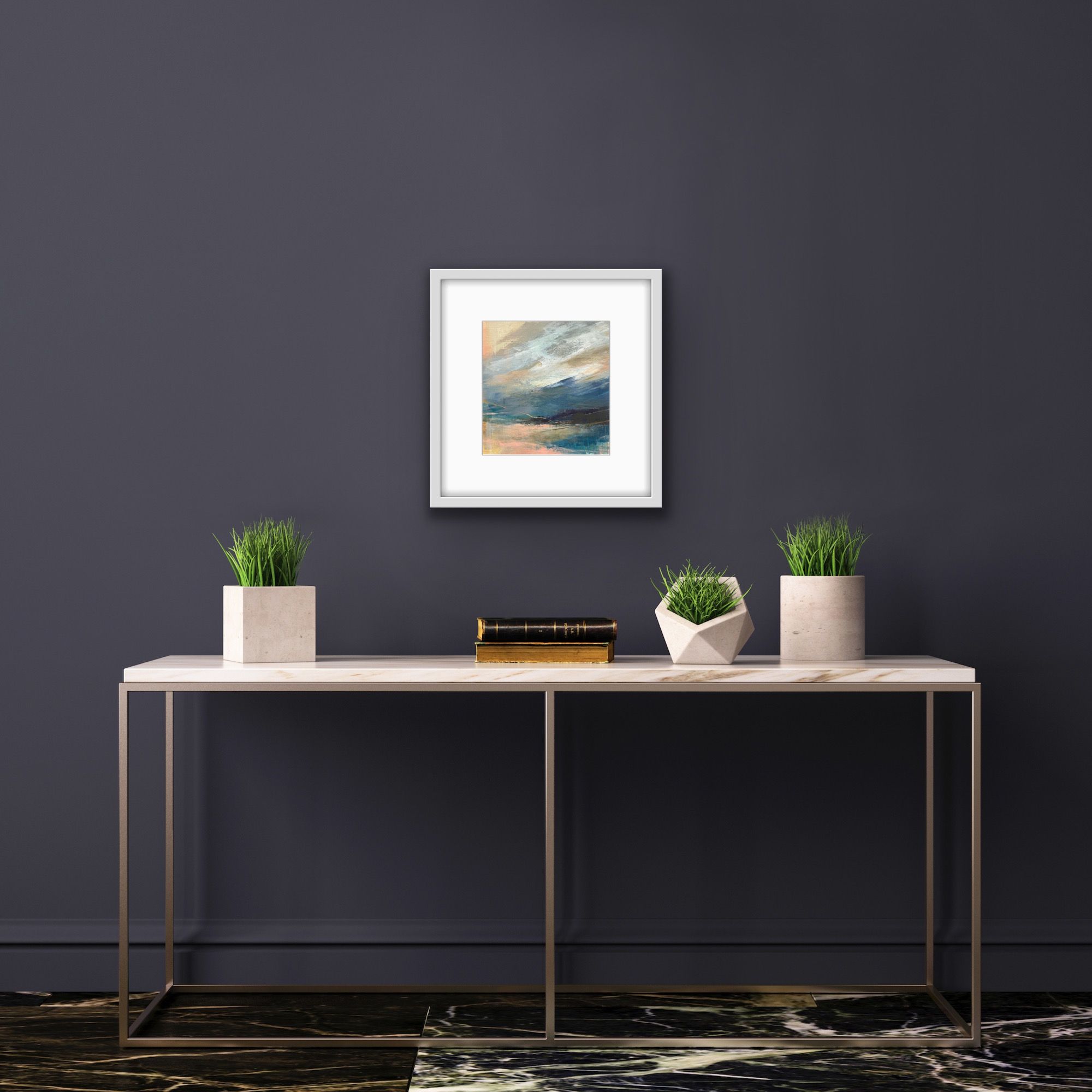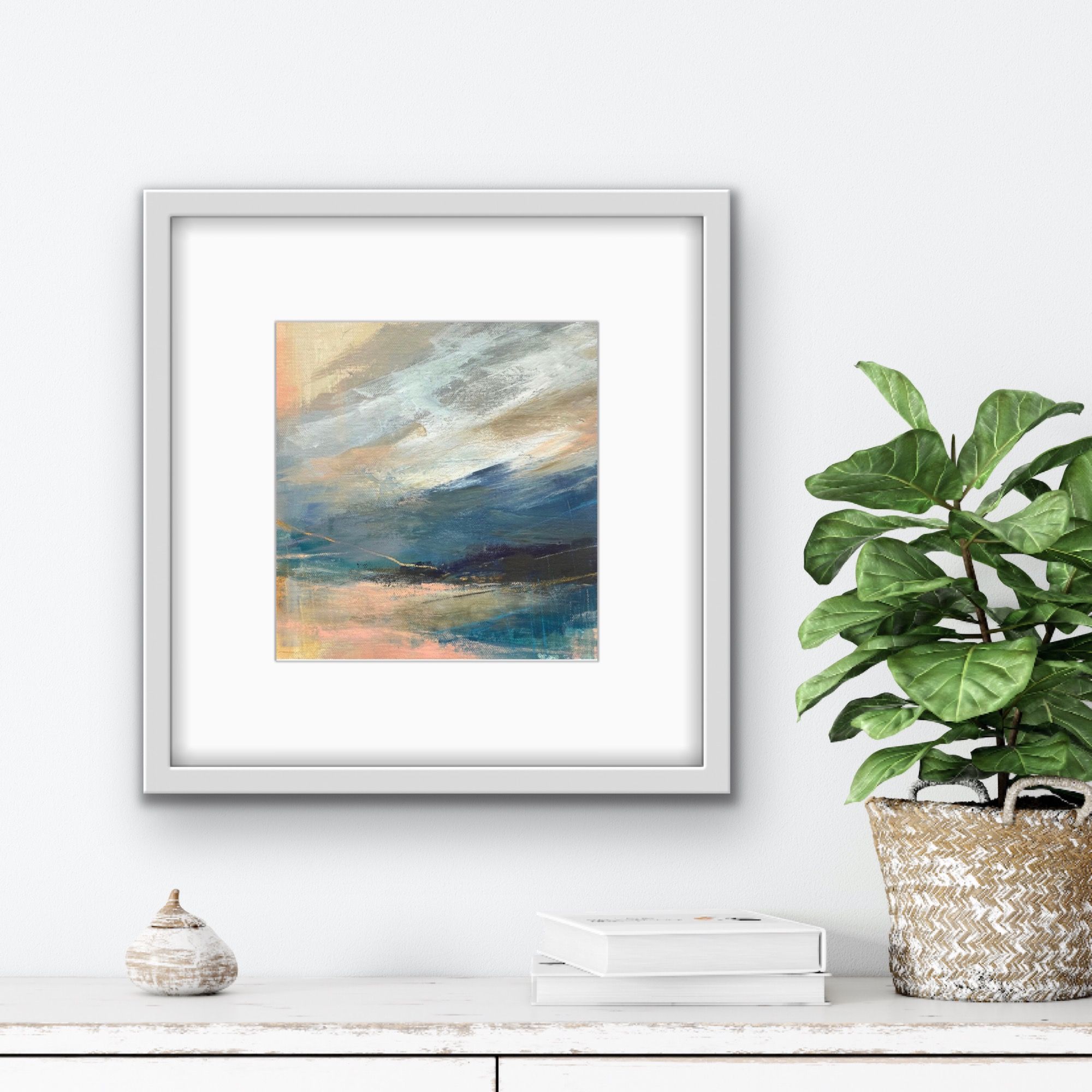 A soft, muted shoreline acrylic painting inspired by the North Yorkshire coast. This painting is on mounted canvas. It is presented in a soft, off white deep edge mount. I wanted to create a subtle, glazed sky, introducing peachy/umber tones and contrasting it with the dark bay on the right.