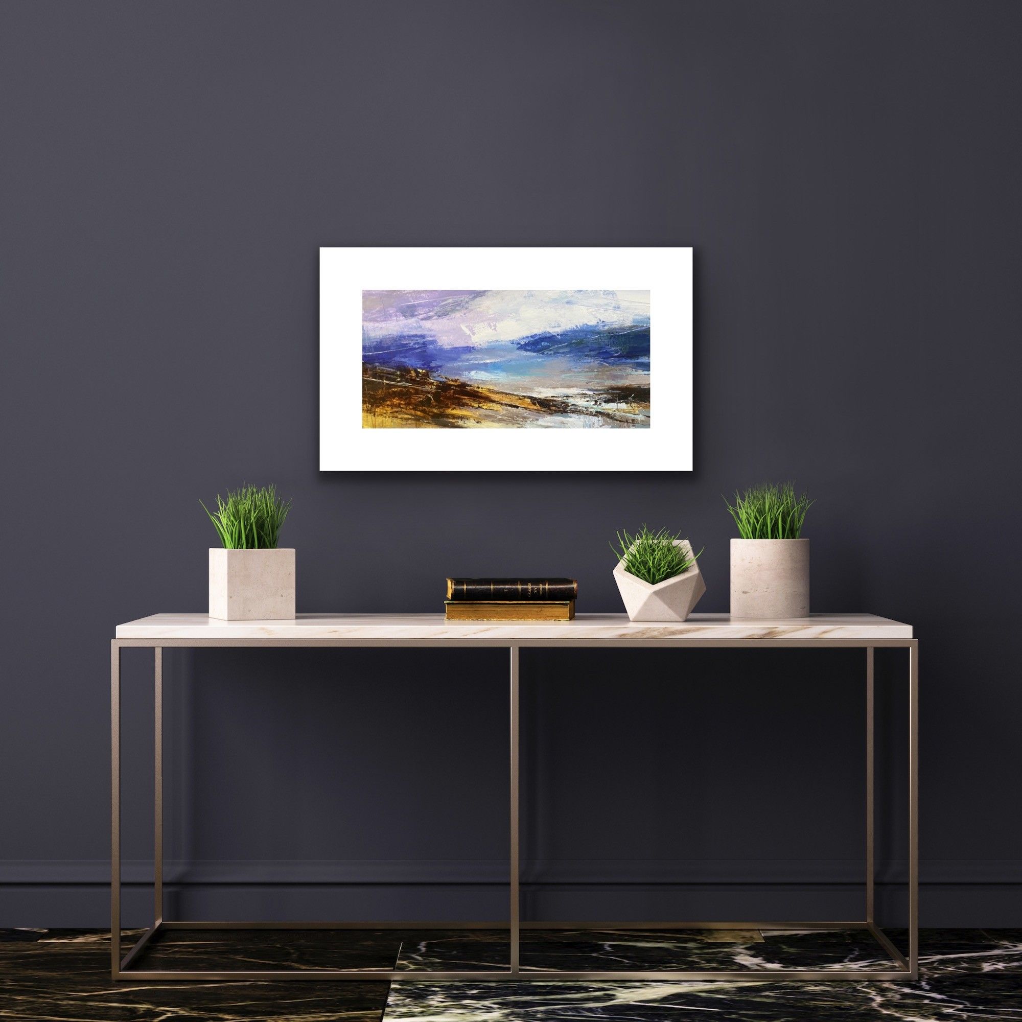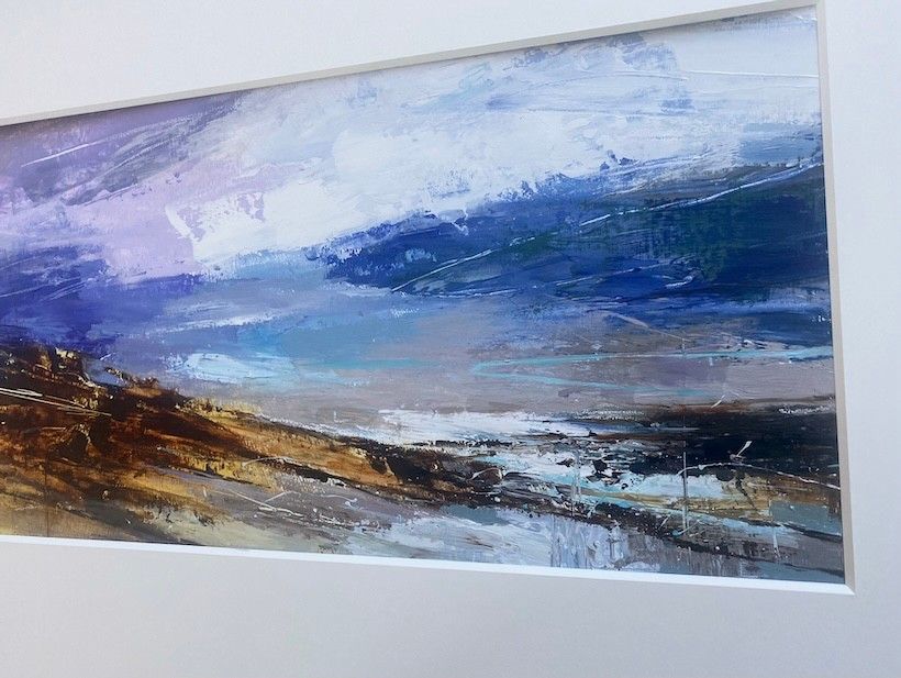 Rocky textural shoreline with a dramatic, sweeping sky. This painting was inspired by the beautiful Yorkshire coast, near to where I live. It was built up with textural medium and thick and thin layers of acrylic paint, then some charcoal & and pastel was added to create some linear mark making. The