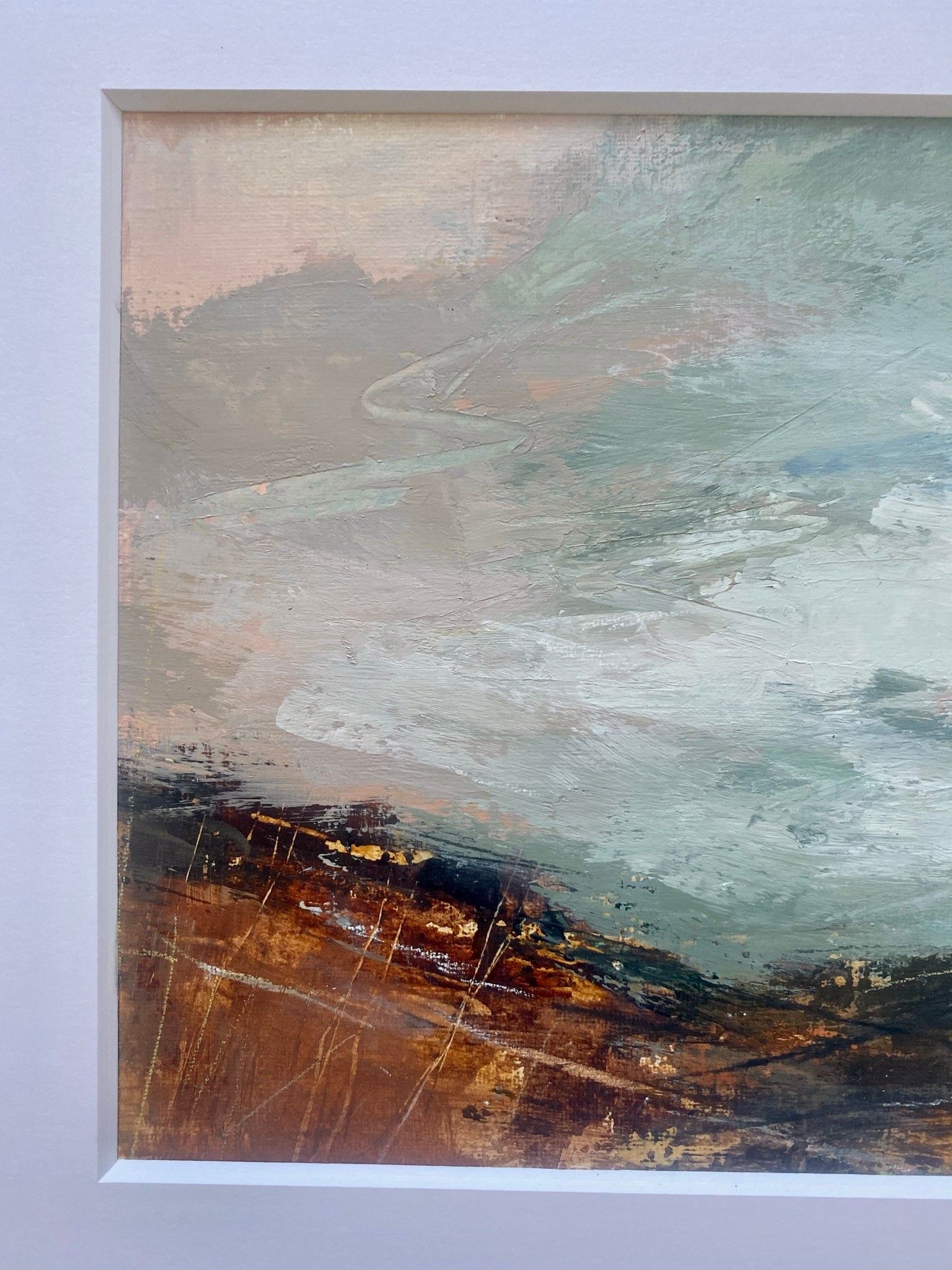 Windswept moorland with pink by Luisa Holden. The textural, earthy tones of the moorland are complimented by the green/greys and dusky pinks of the sky. This piece creates movment with fast moving scudding clouds. Chalk pastel and Inktense were worked over the earth colours to create moorland grasses. This piece