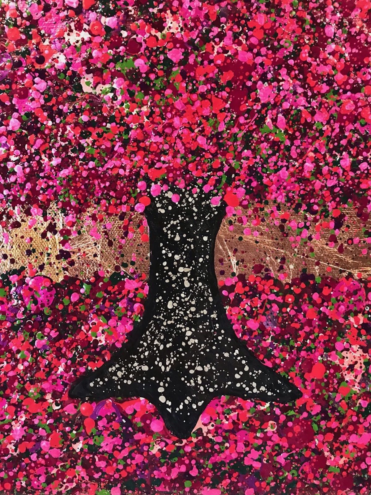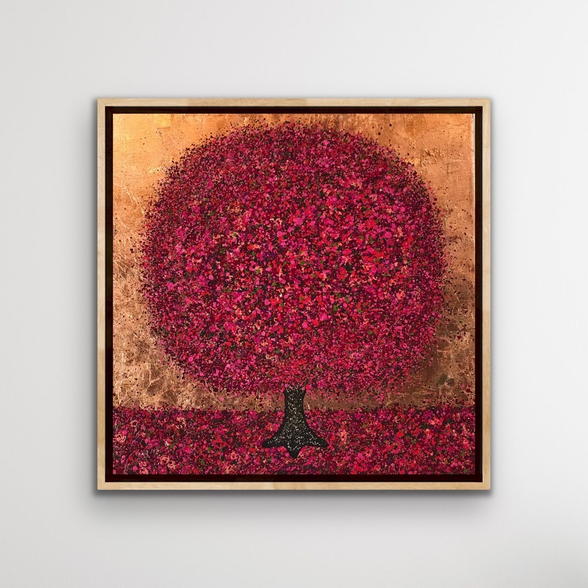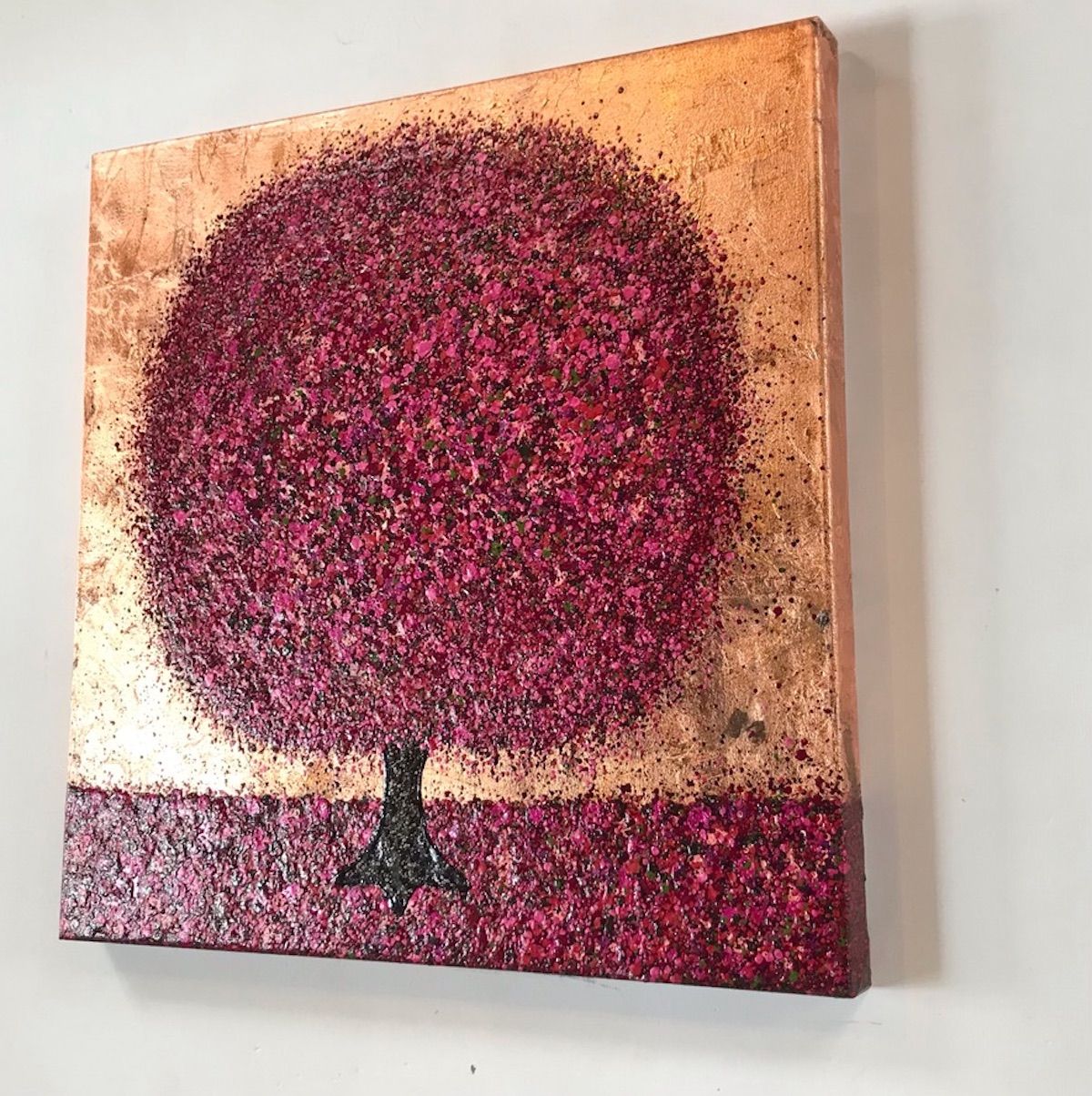 Magenta Sunset is and original semi-abstract painting by artist Nicky Chubb. Featuring her signature stippling and dotting mark making alongside a beautifully sophisticated colour palette. Magenta blossom on the tree stands out against the alluring copper background to great this statement tree painting.