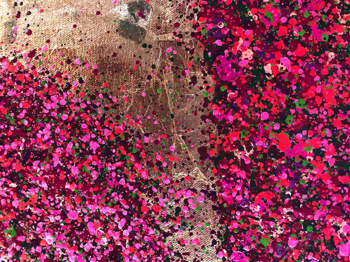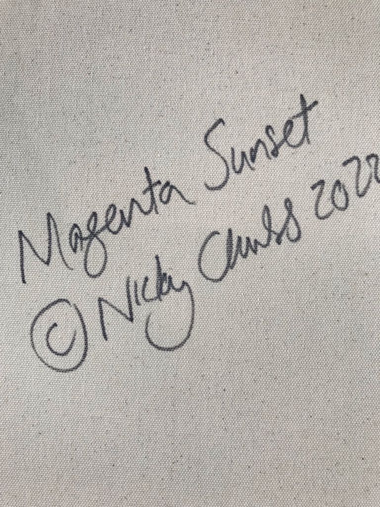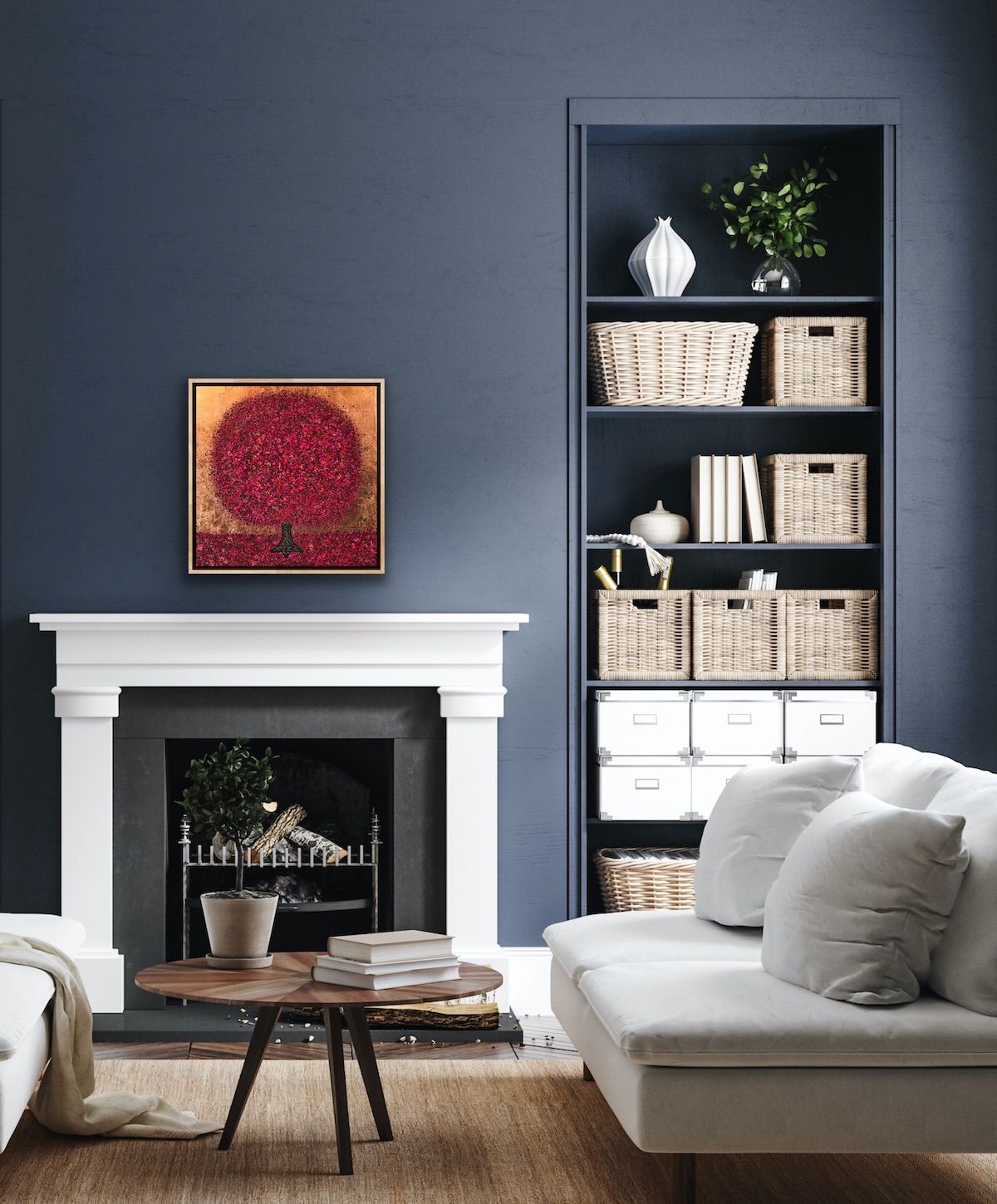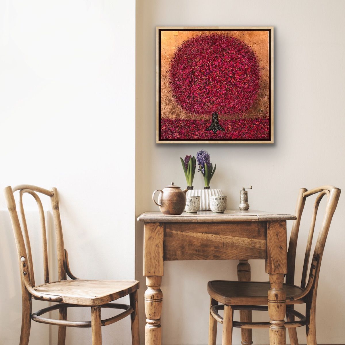 Magenta Sunset is and original semi-abstract painting by artist Nicky Chubb. Featuring her signature stippling and dotting mark making alongside a beautifully sophisticated colour palette. Magenta blossom on the tree stands out against the alluring copper background to great this statement tree painting.