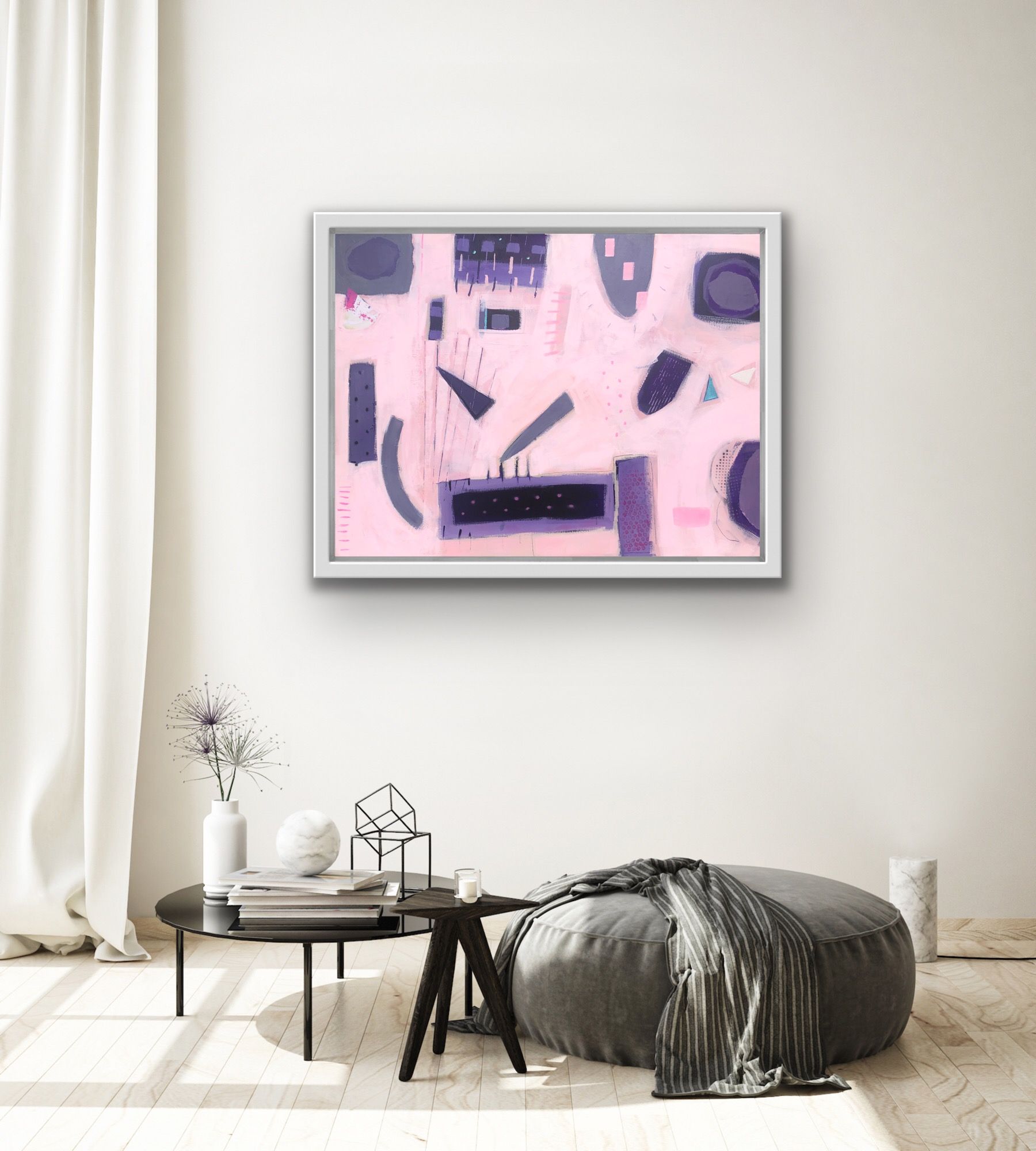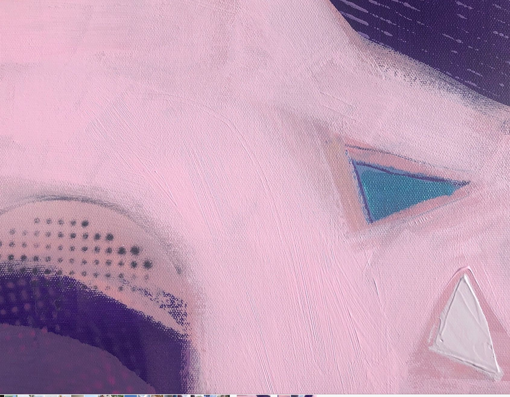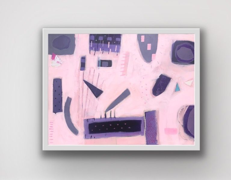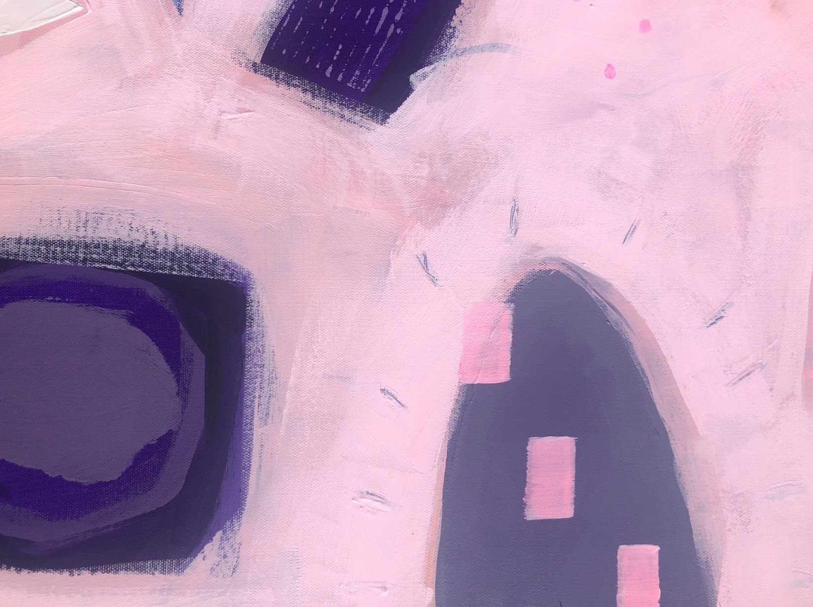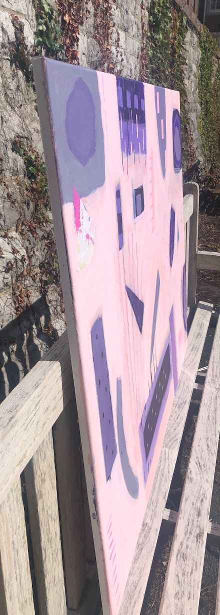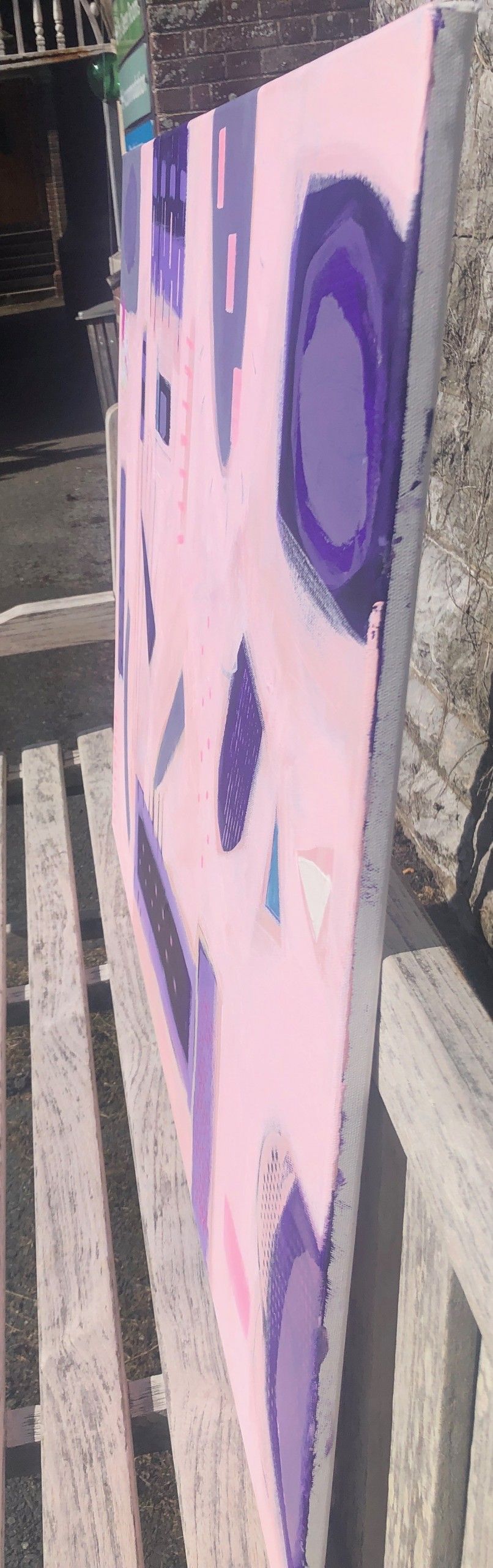 Let's go party, is based on studies made on Dartmoor. The canvas is layered in four different colours with each layer exposing parts of the colour beneath. Collage is added and graffiti spray paint. The colours are feminine and gentle , while the brushstrokes are strong and confident.