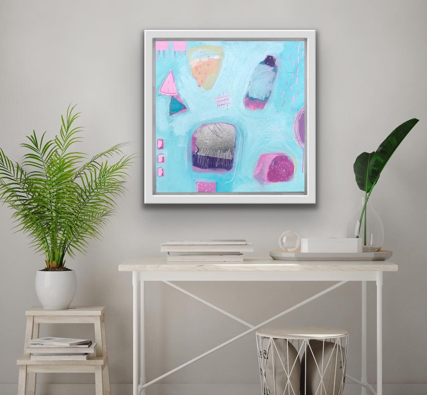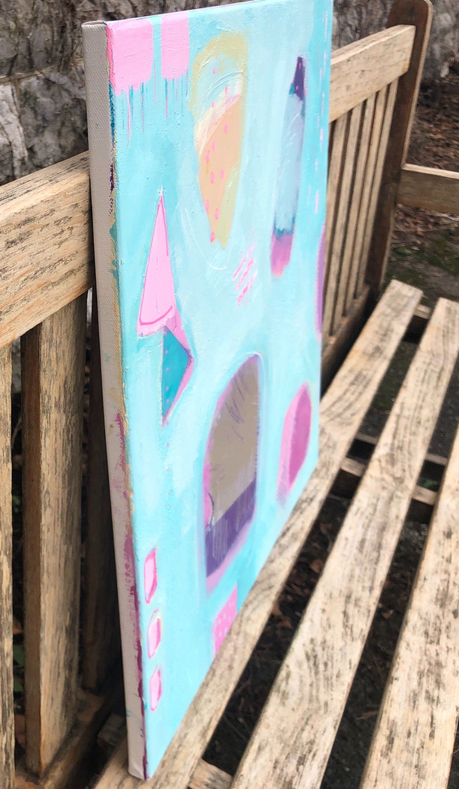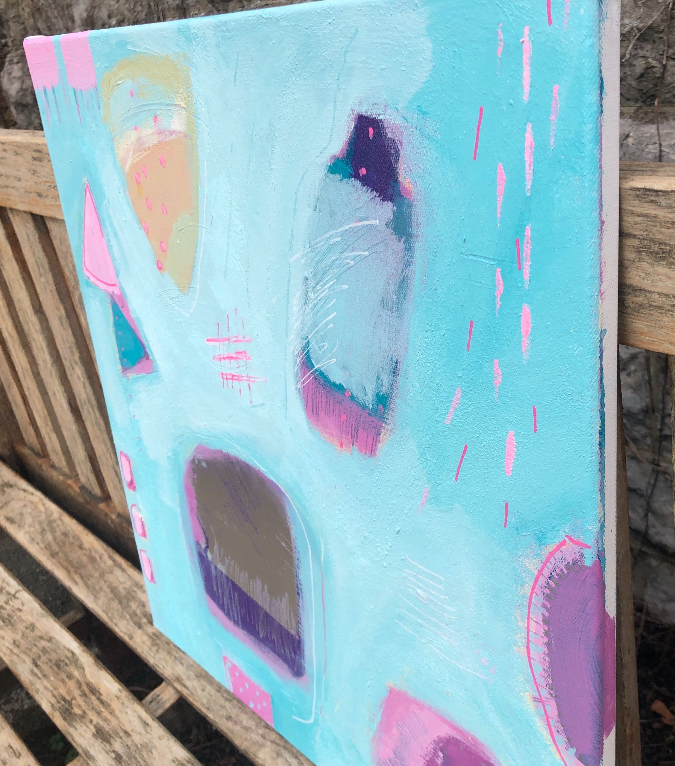 This canvas is a lead on from a large canvas called Pink Bikini (also on site), a piece based on th surroundings of the beaches and the seaside in South Devon in summertime. For this canvas I wanted to use turquoise to depict the colour of the sea so often